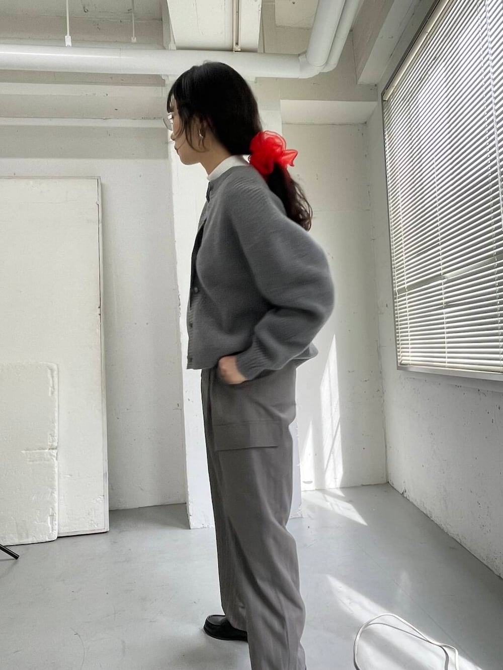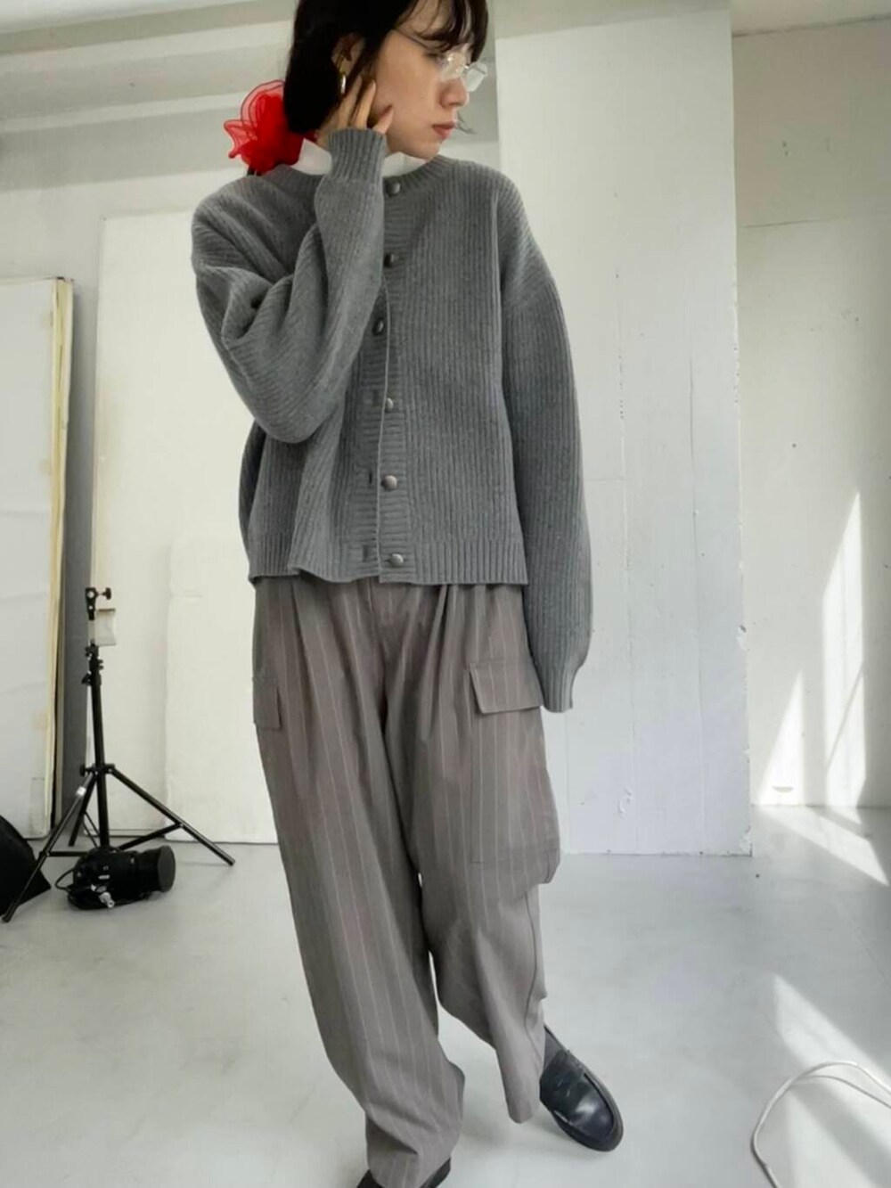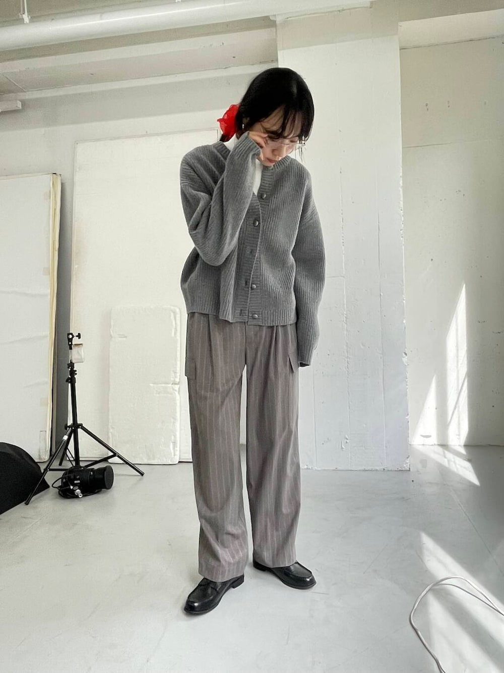 シンプルになりすぎないよう、メガネとシュシュで顔周りにアクセントを置きました。