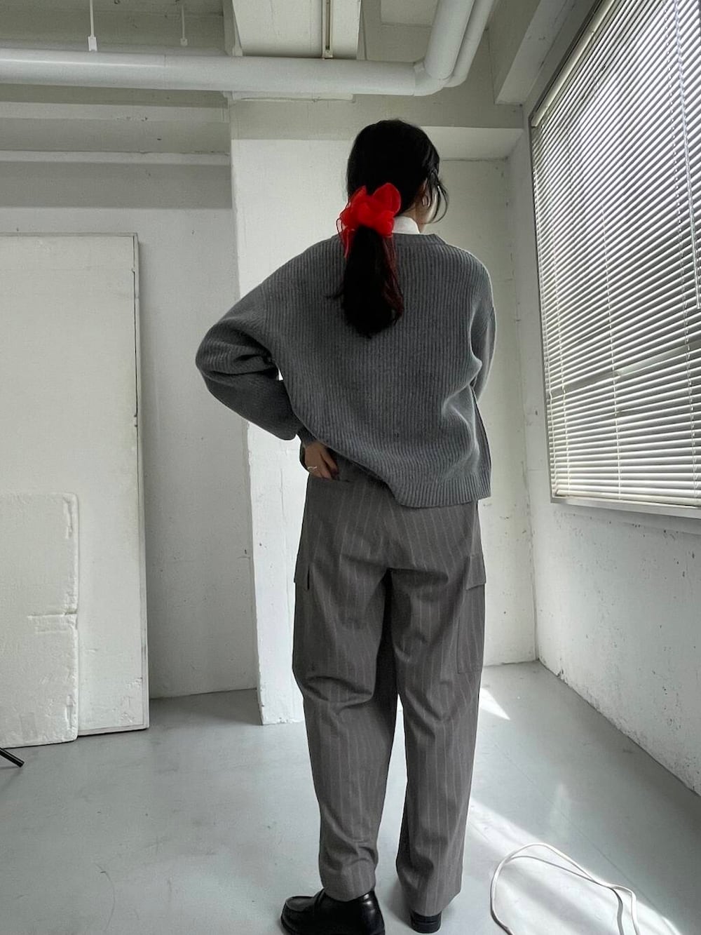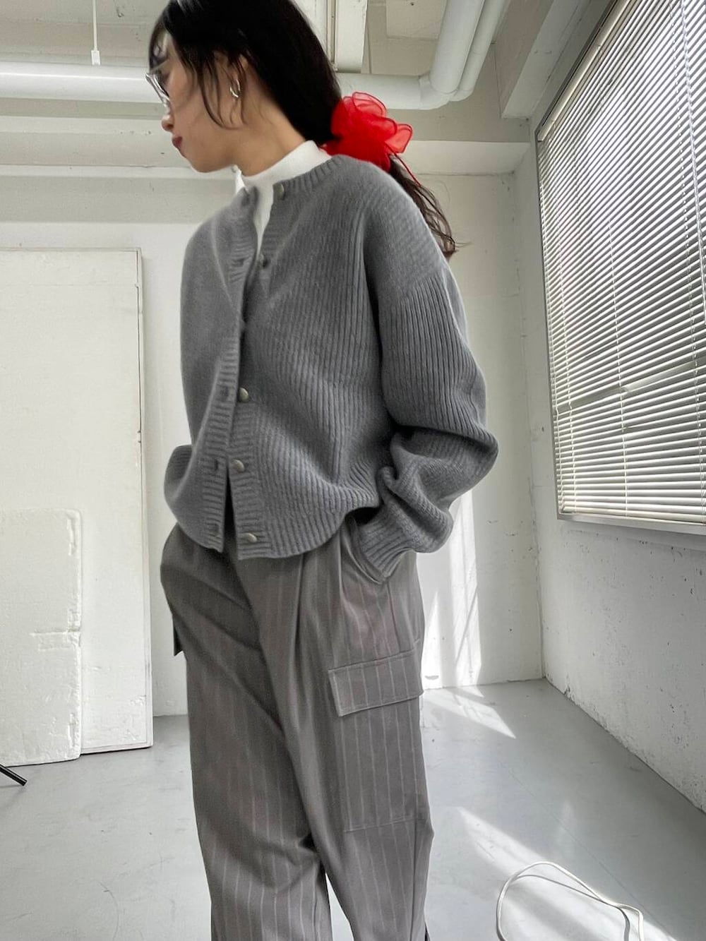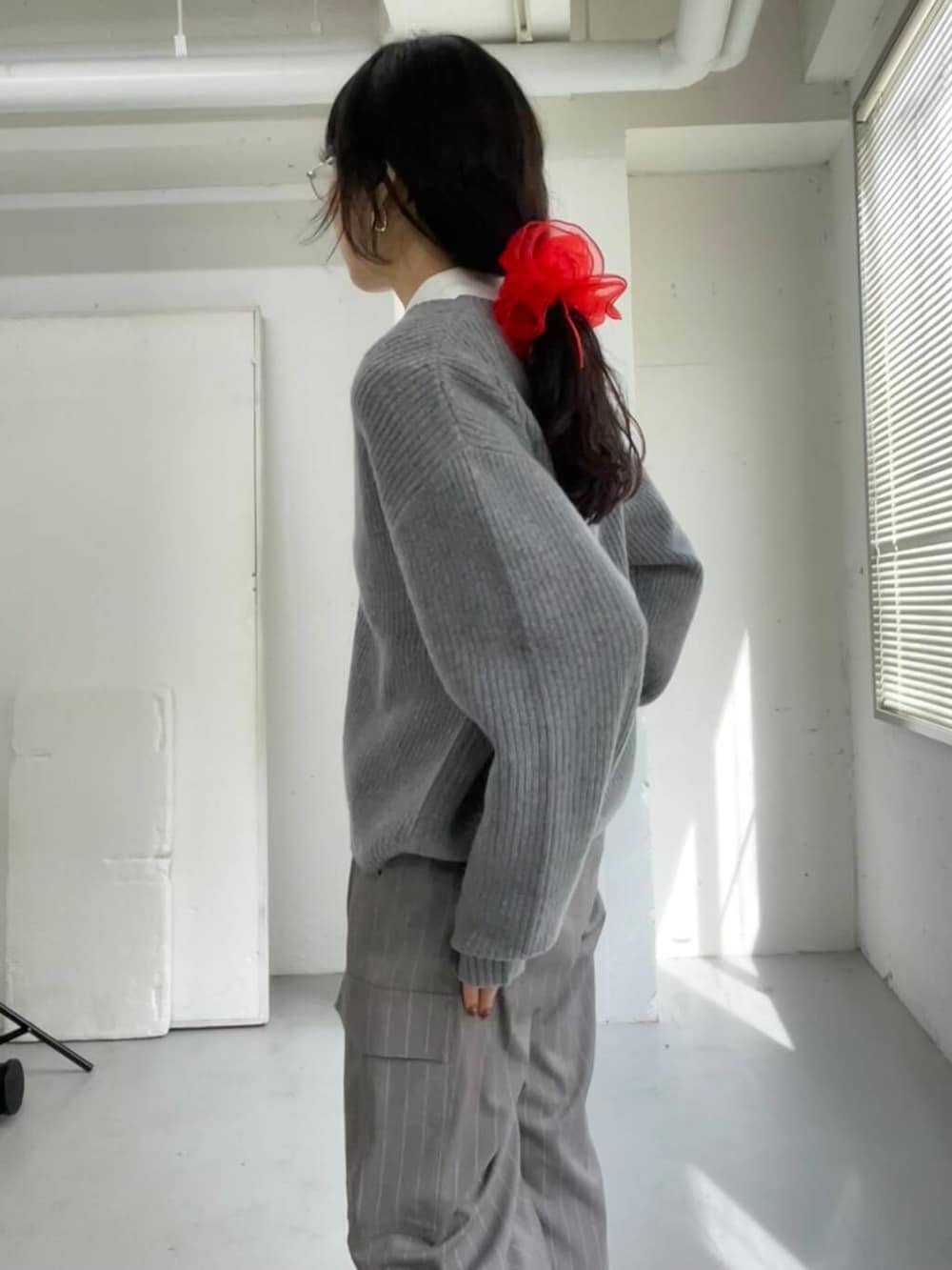 シンプルになりすぎないよう、メガネとシュシュで顔周りにアクセントを置きました。