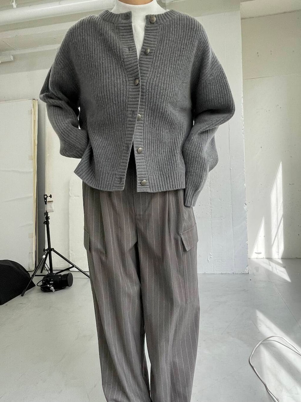 ハミルトンウールのカーディガンが膨らみがあるので、ボトムは落ち感のあるストライプパンツをセレクト。