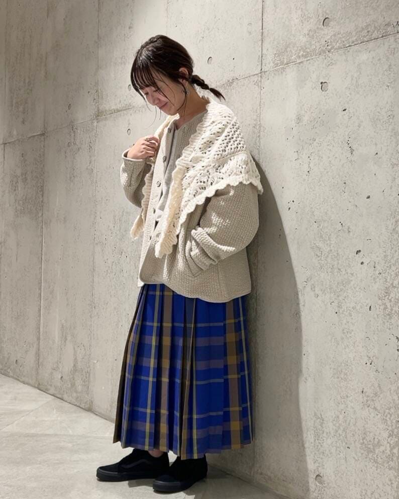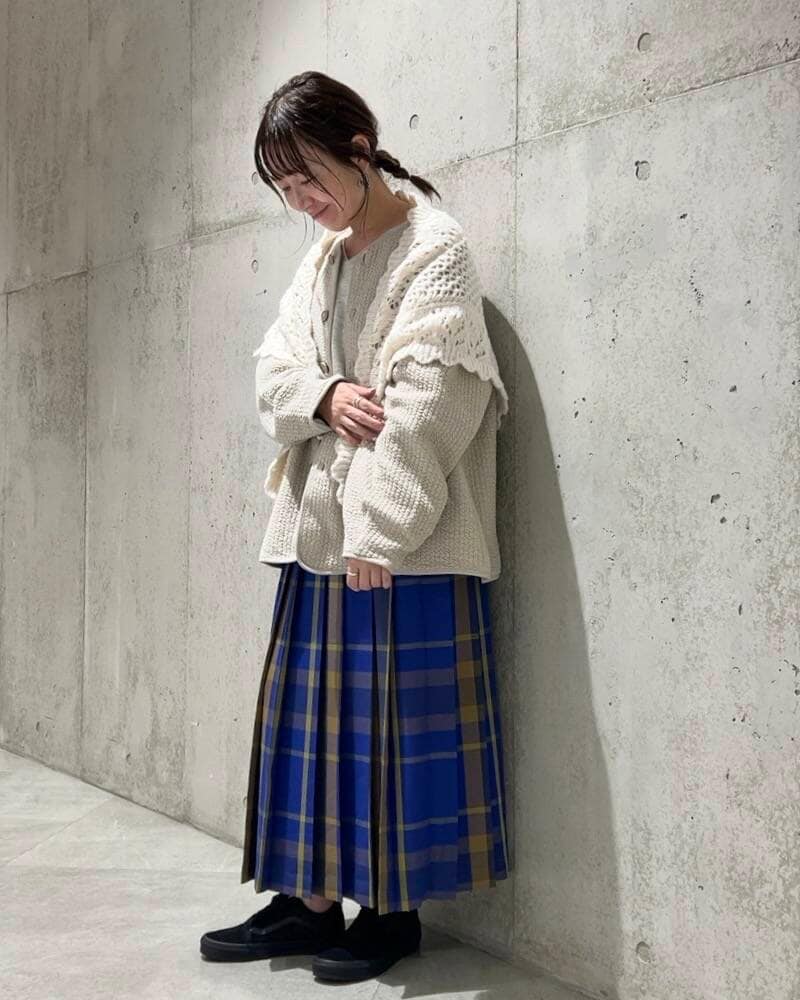 今回は、チェック柄のプリーツスカートをアクセントにしたコーディネート。