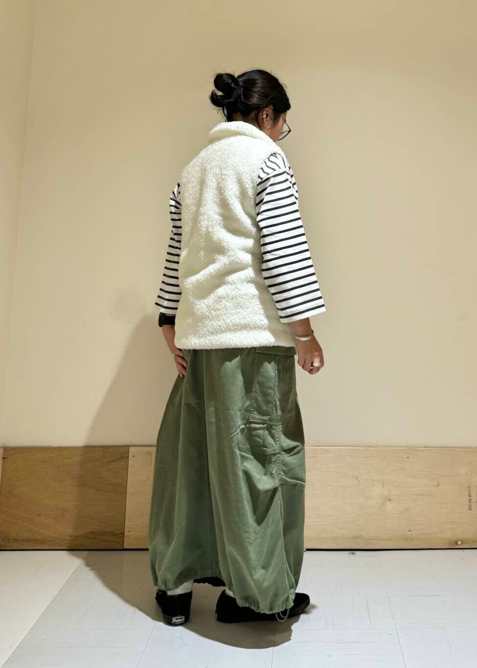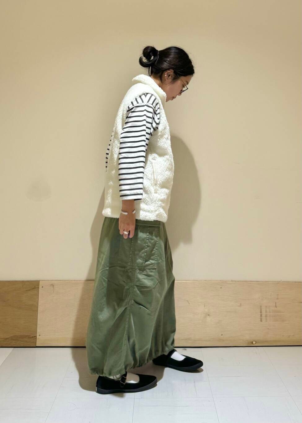 絞って履くとバルーンスカートの様なシルエットがかわいいのでおすすめです◎