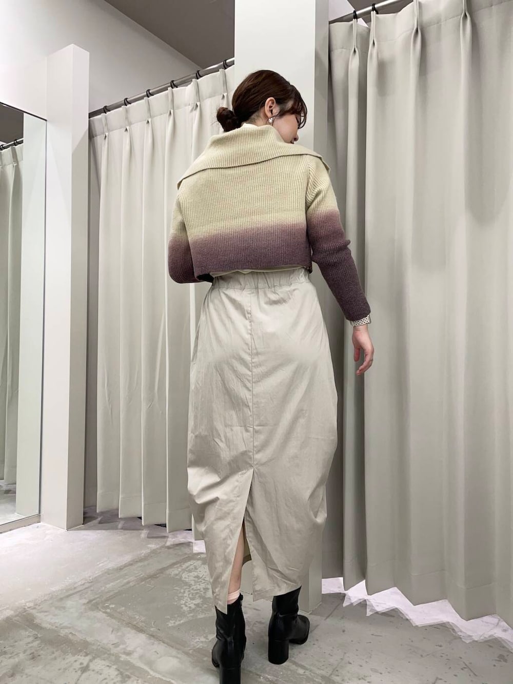 グラデーションが特徴的なクロップドニットは、襟が大きいので小顔効果抜群ですෆ.*・゚