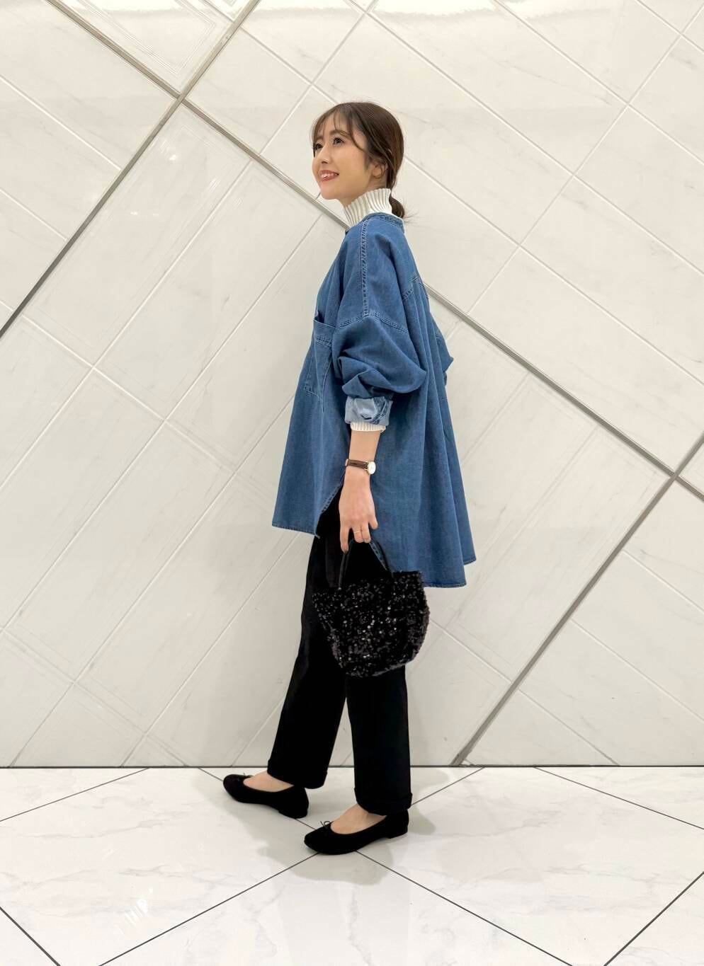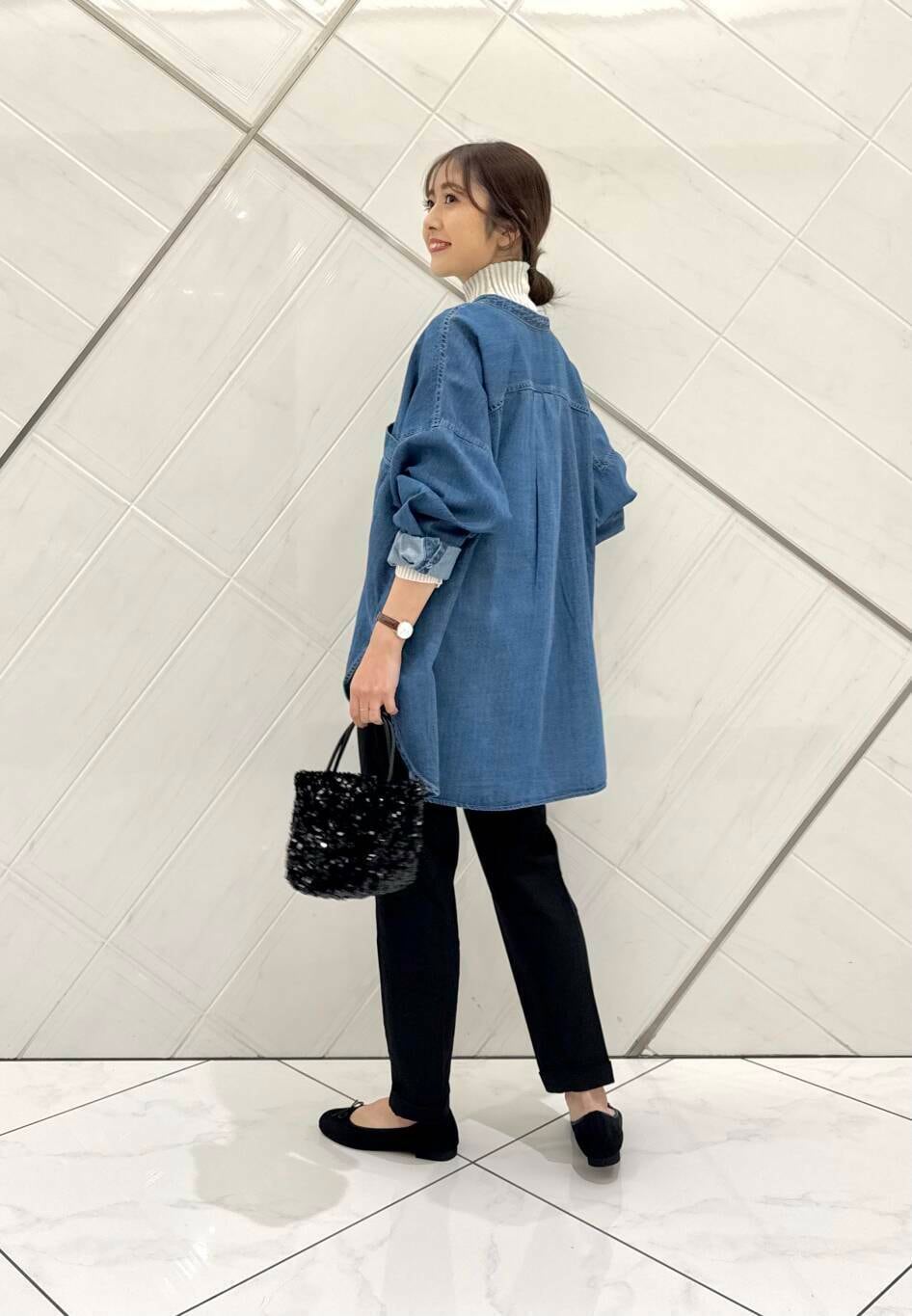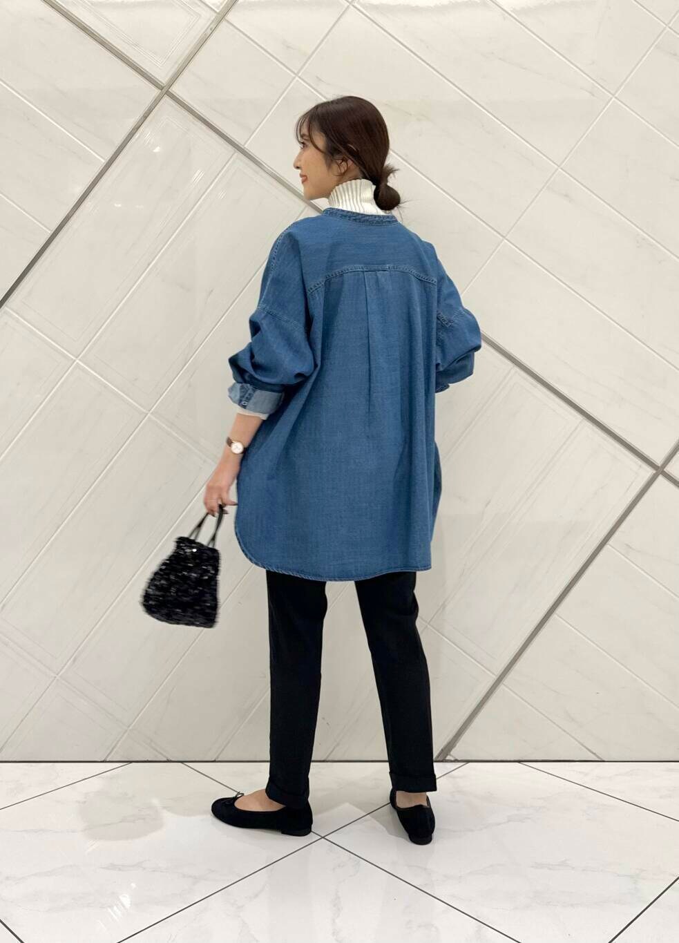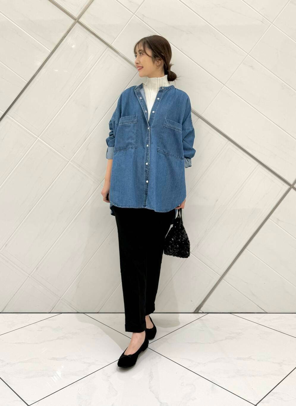 今回はタートルネックのインナーをプラスし、テーパードパンツを合わせてすっきりとしたスタイリングにしてみました。