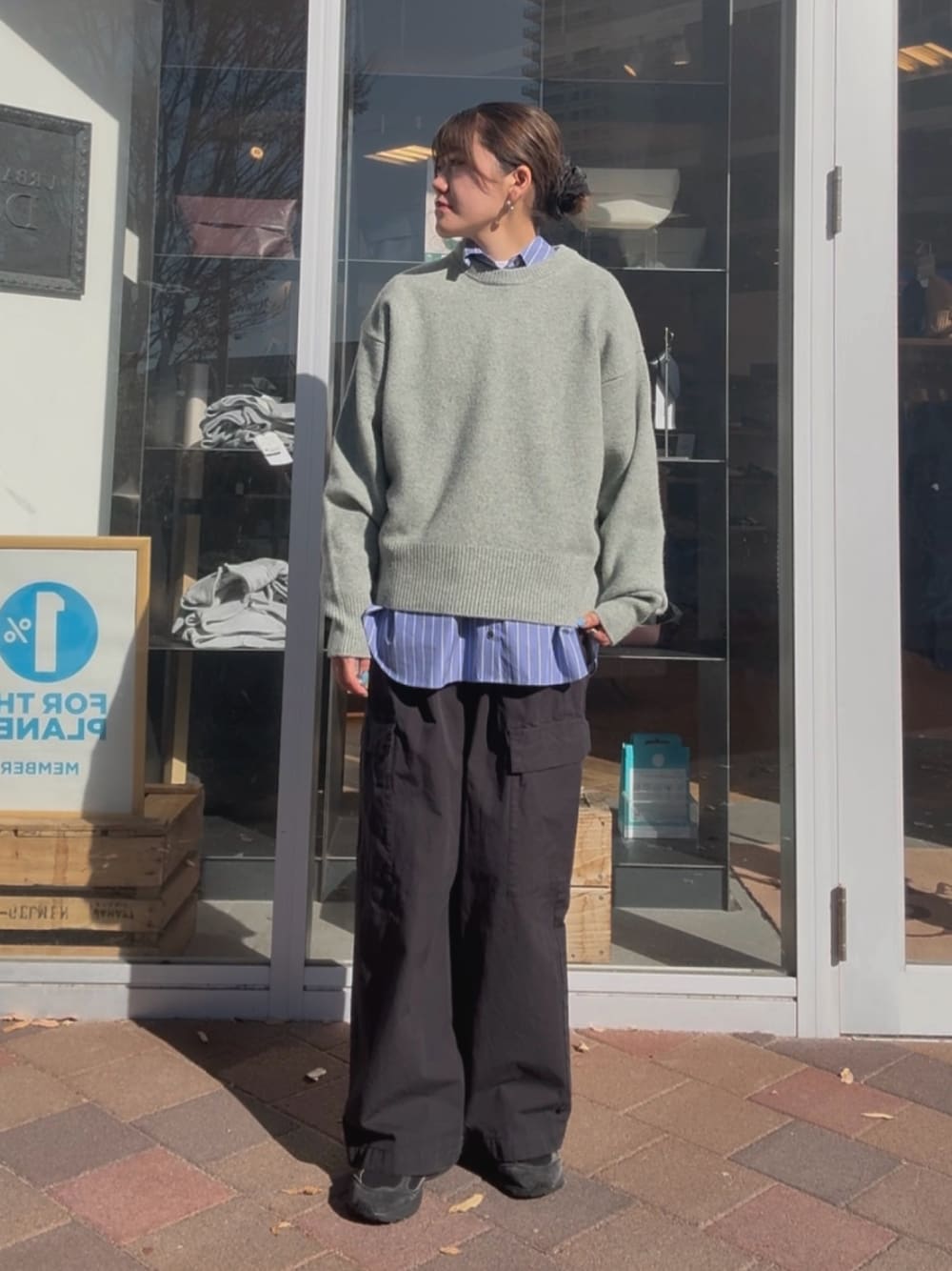 形もデザインもベーシックですが、少しボリュームのあるトップスなのでスカートを少しタイト目なスッキリしたバランスでコーディネートしてみました!!