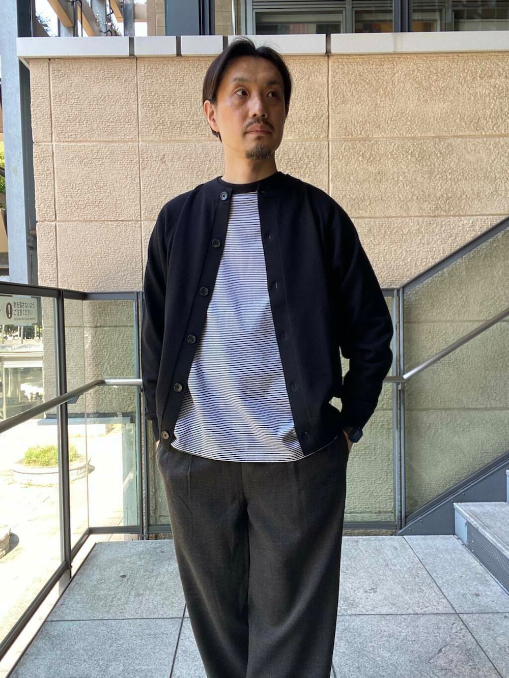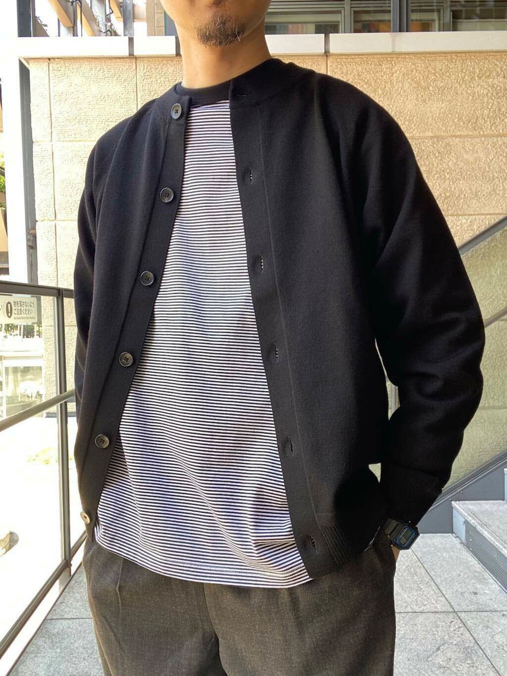 すっきりとしたクルーネックデザインがカジュアルにマッチし、羽織りにはもちろんボタンを閉じて一枚でも様になります。