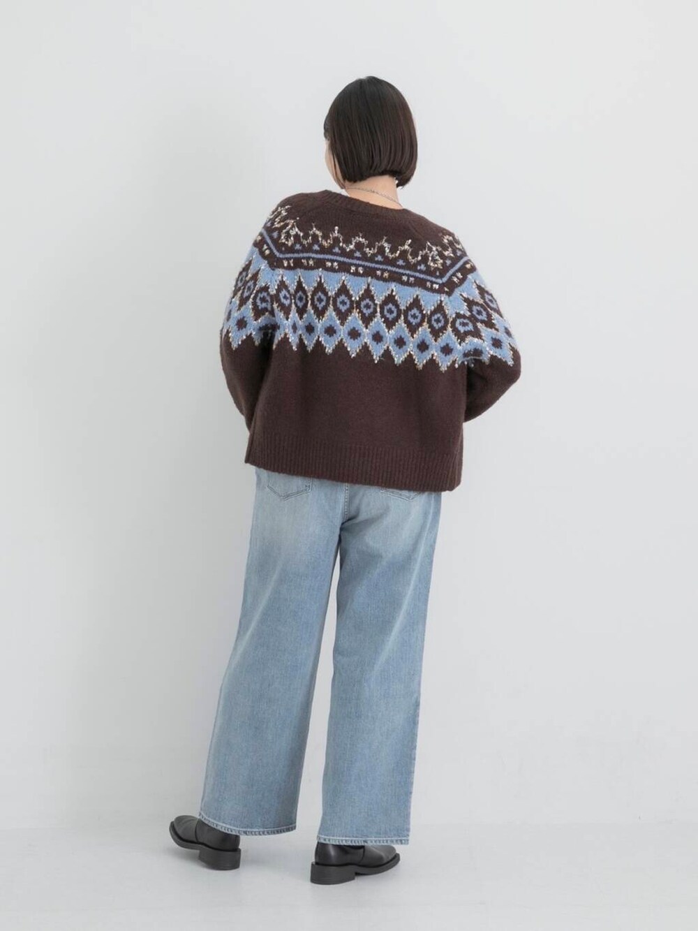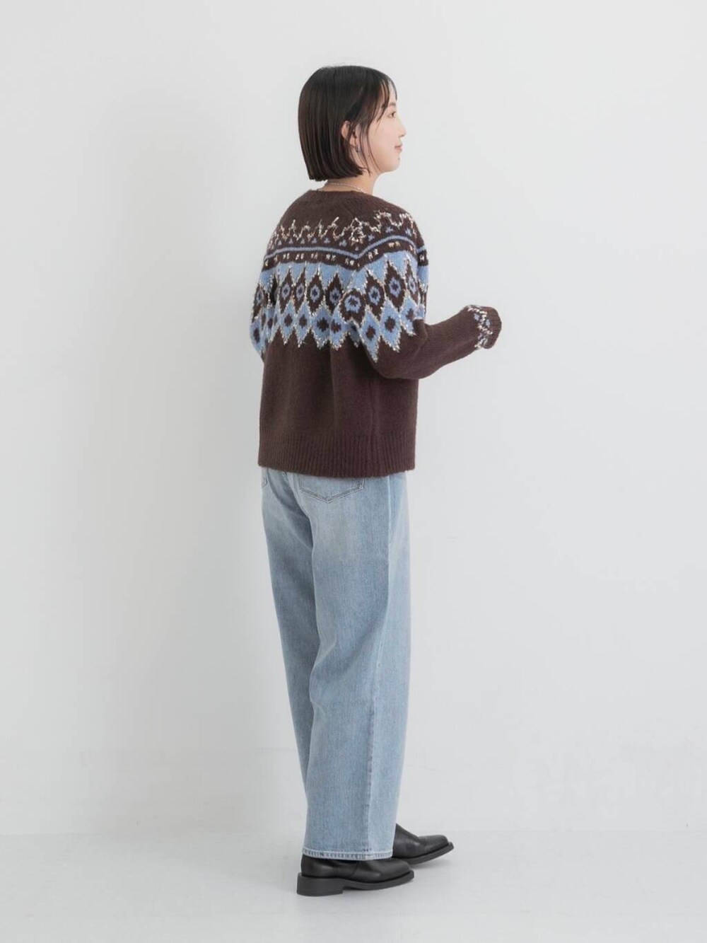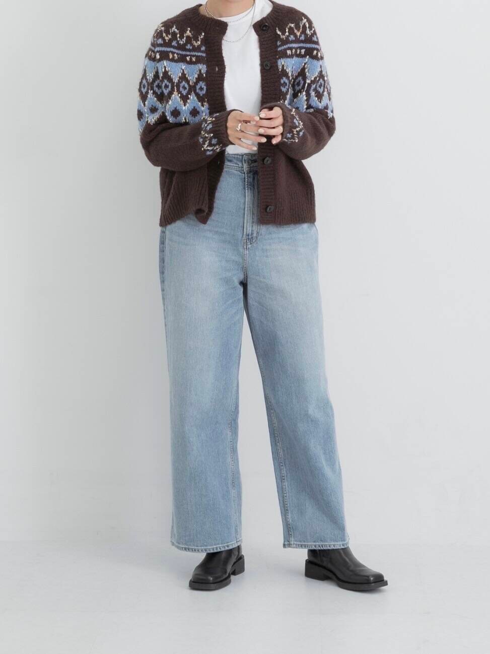 冬らしい柄編みのカーディガンが主役のスタイリングです。