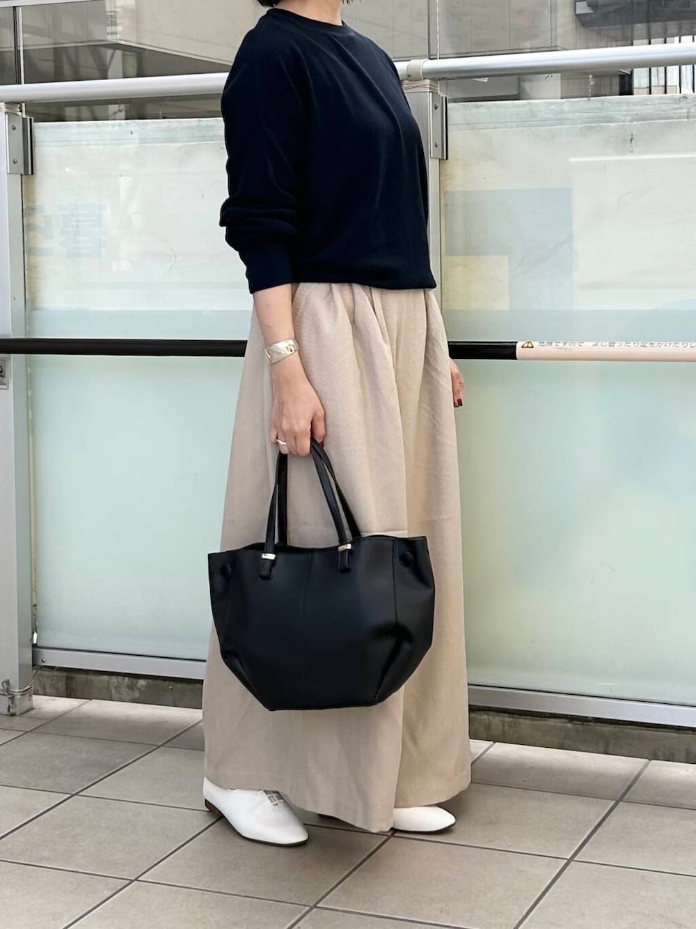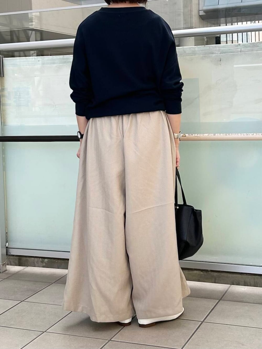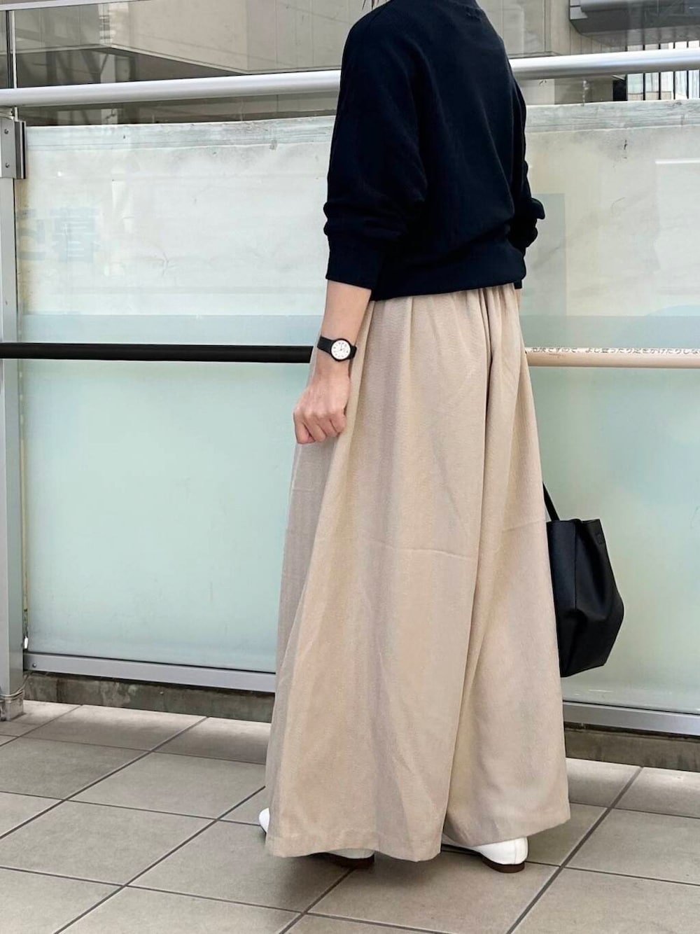 ボトムにボリュームがあるのでトップスはスッキリと見えるものを合わせました。