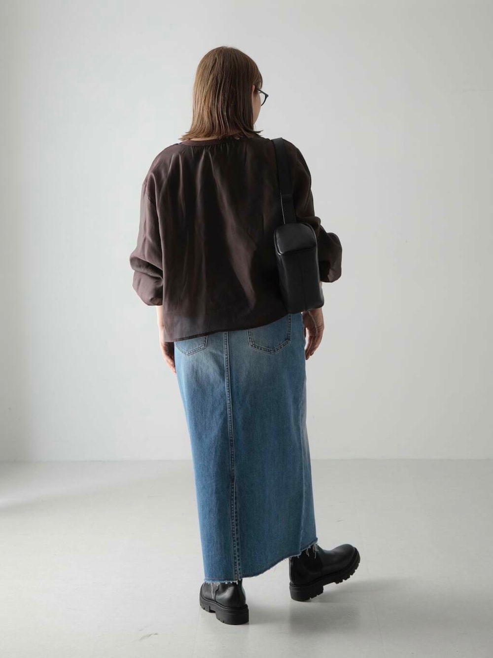 ラフすぎないようにミニバッグ、メガネ、ネックレスを。