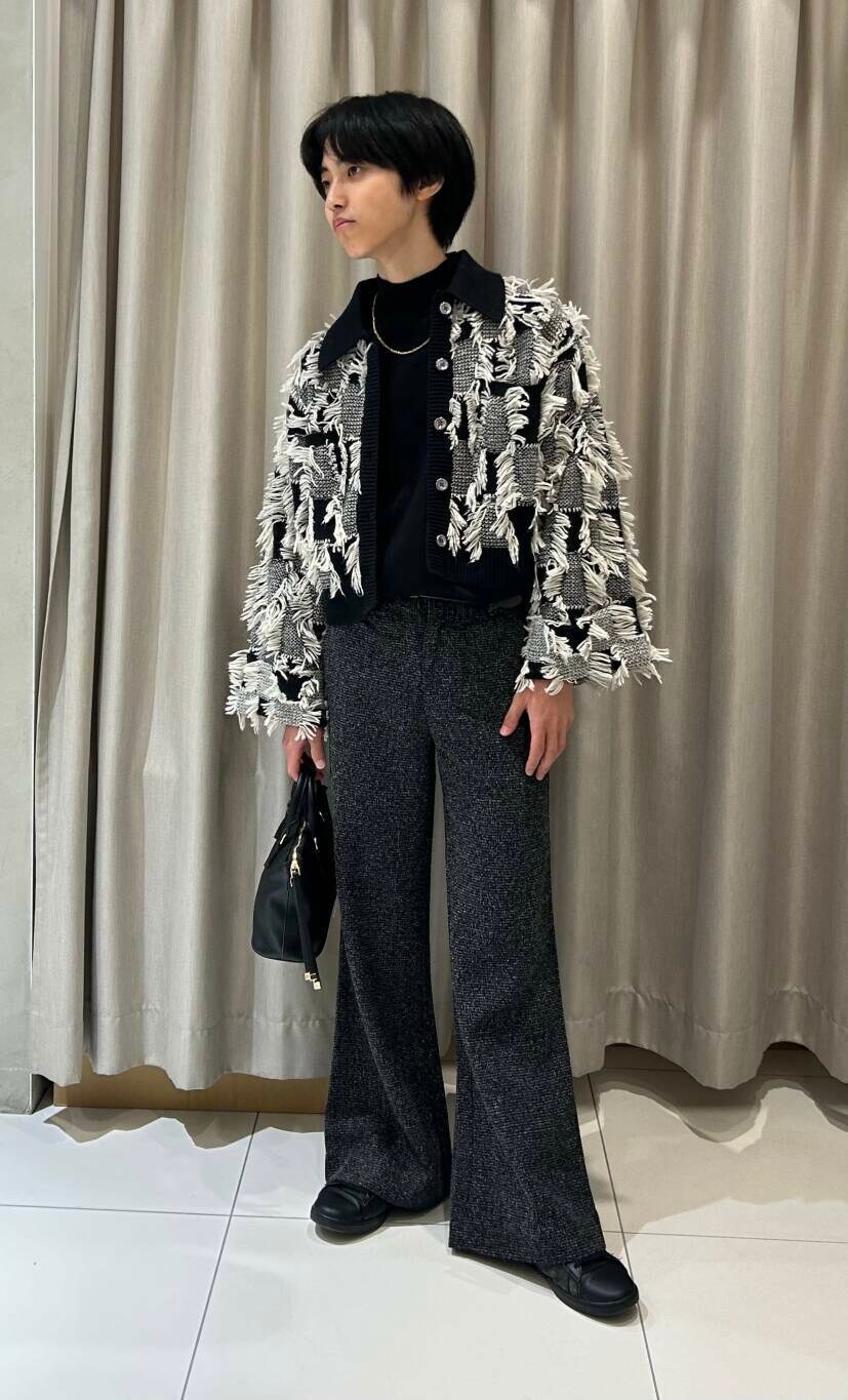 今回はモノトーンでエレガントにまとめてみました!フレアパンツを使っているのでスタイルが良く見え、ツイードパンツ持っていない方にはこれ1つでとてもおしゃれになると思います!レディースのフリンジニットジャケットも着てるのでぜひ試してみてください!