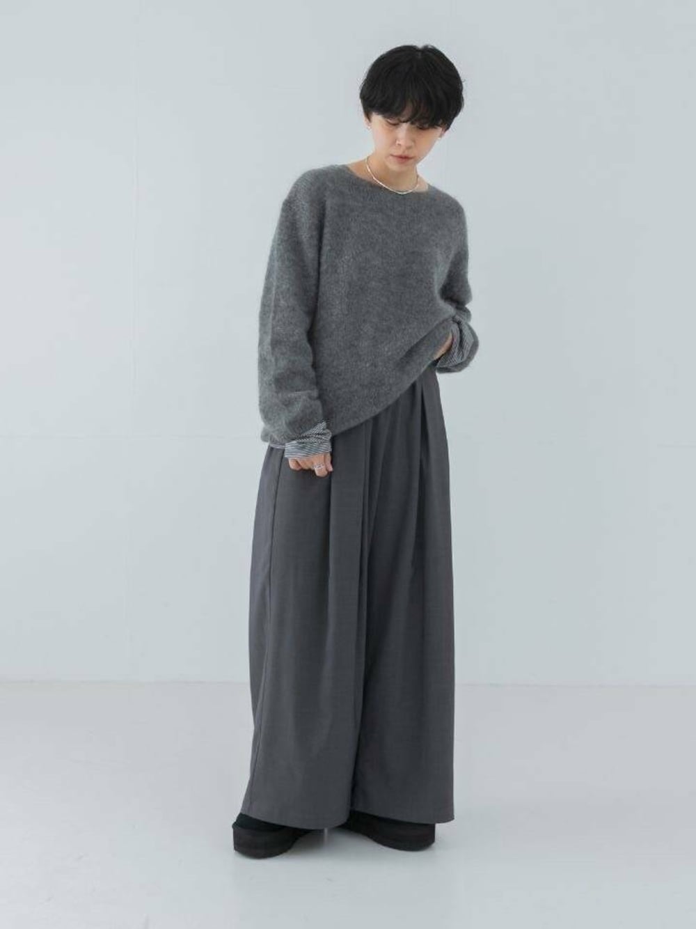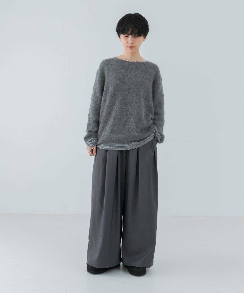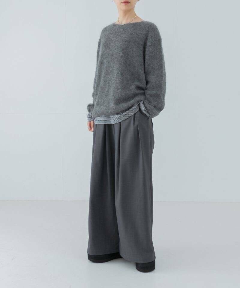 歩く度に動きの出るシルエットはそのままに、高級感のある梳毛調ポリエステルでお作りしています。シワになりにくく、マシンウォッシャブルが可能と実用性が高いのも嬉しいポイント。