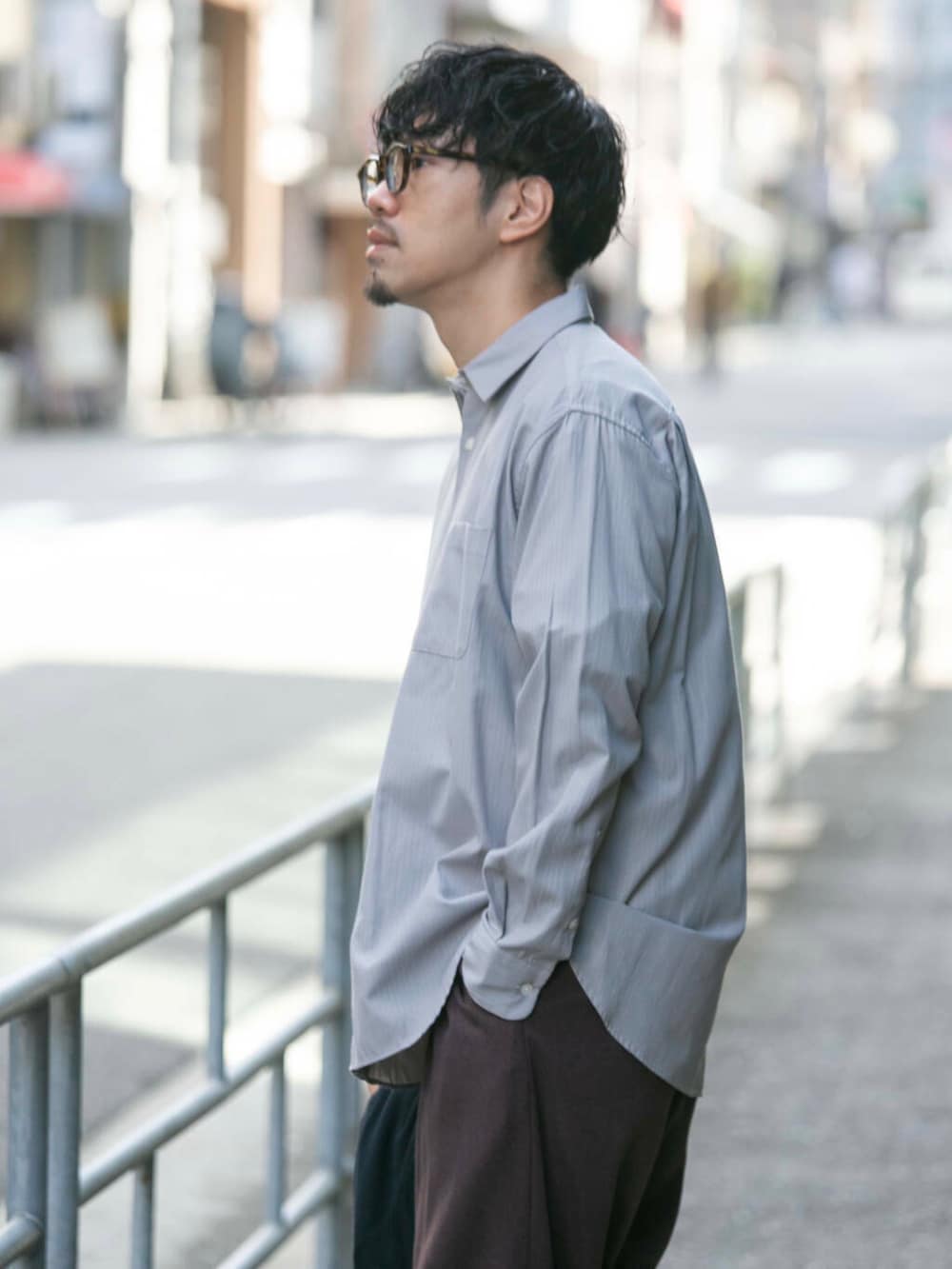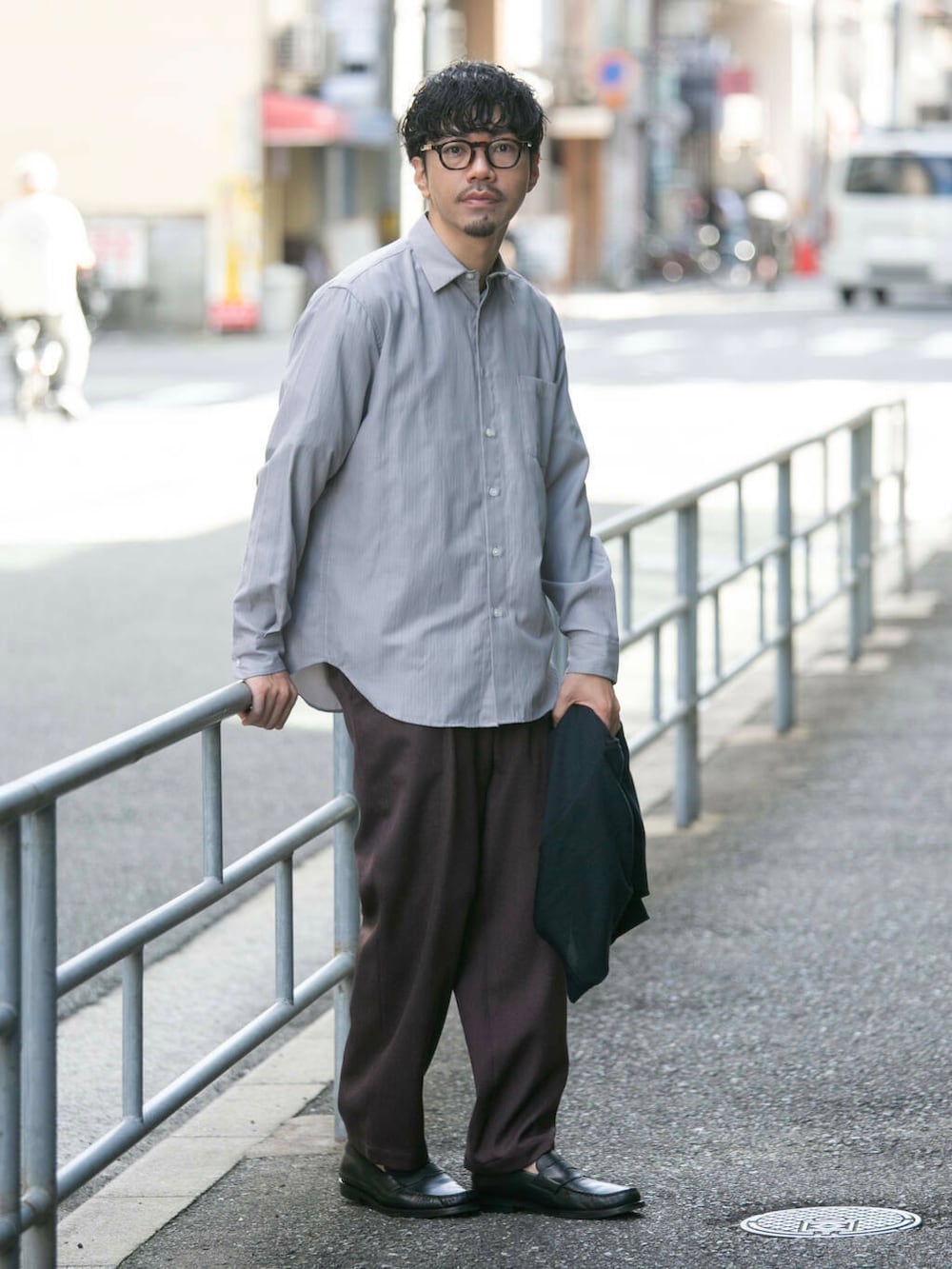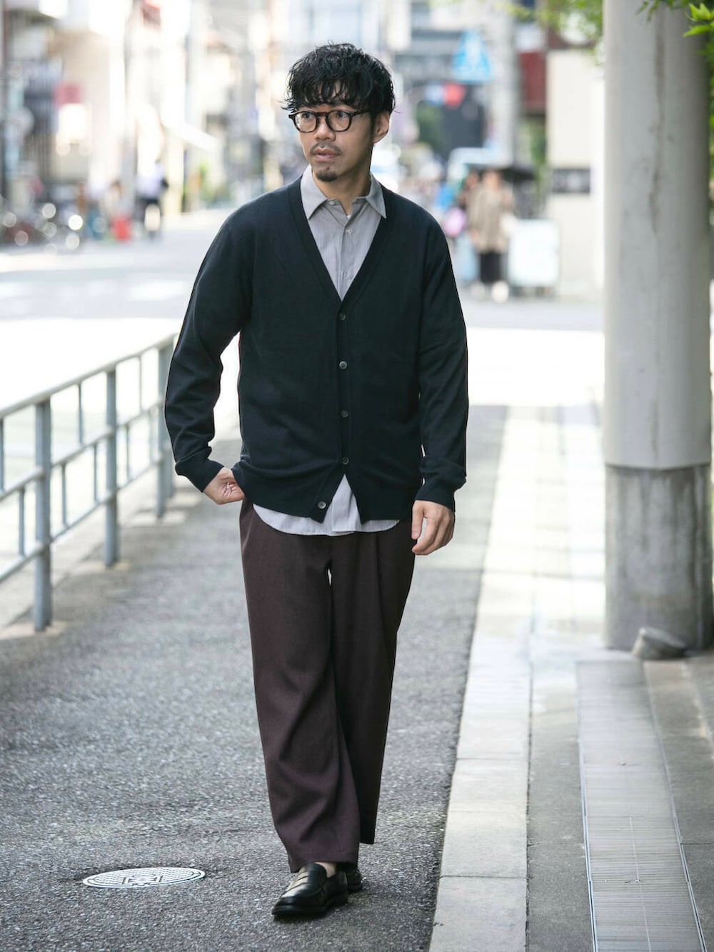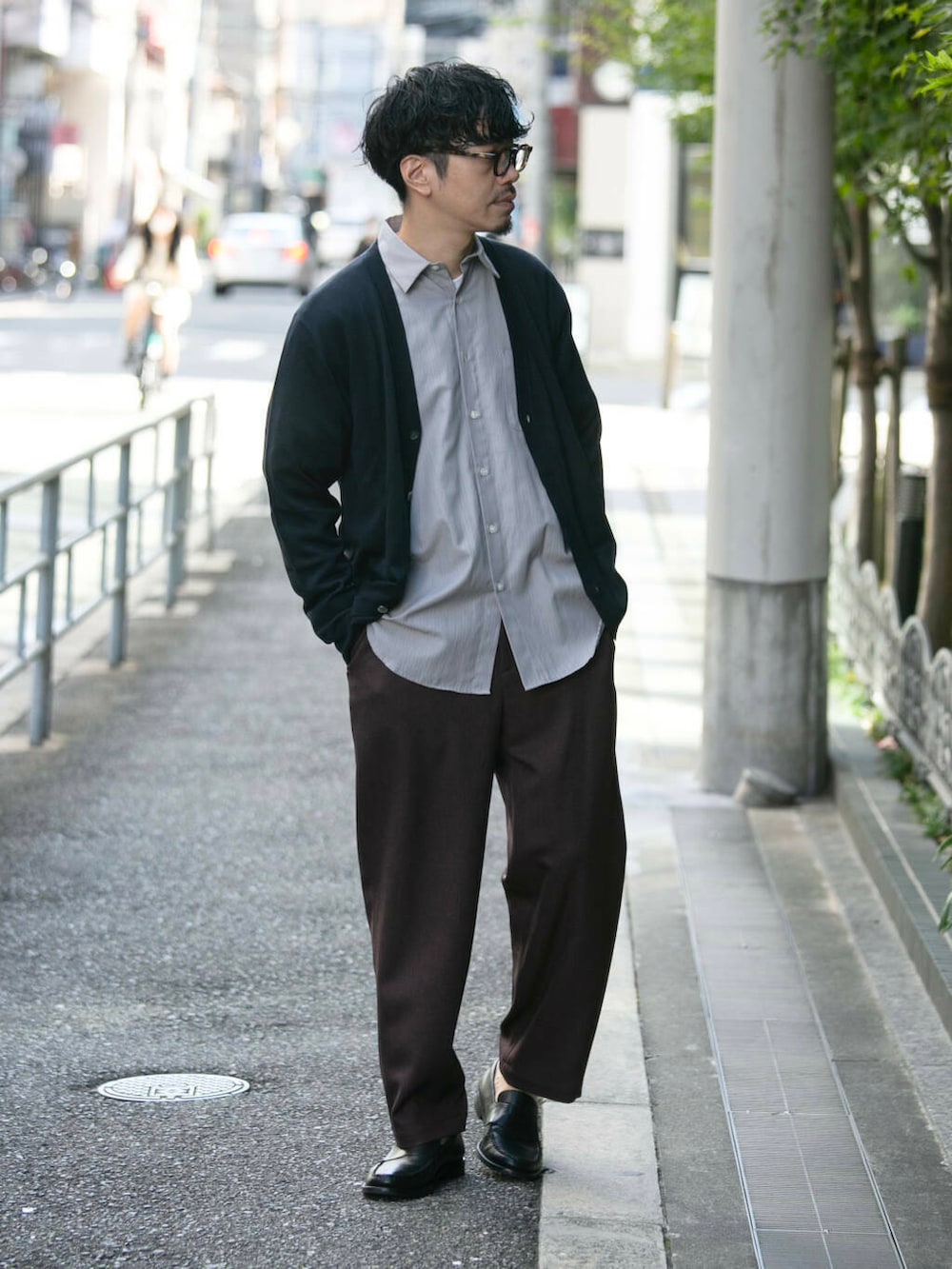 ②パンツ単体でカーディガン&シャツで少しキレイめに