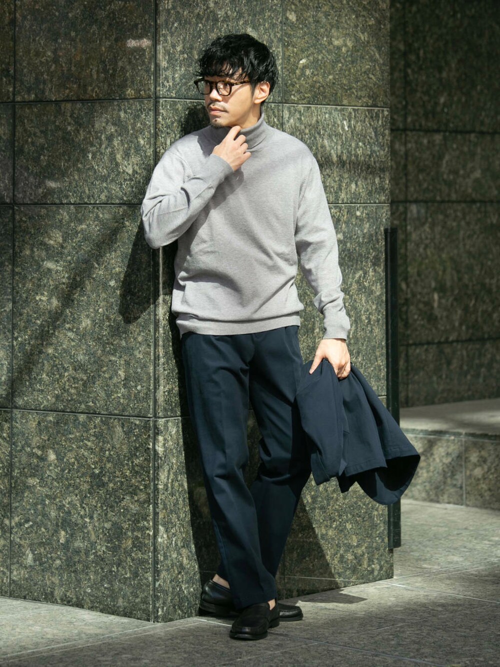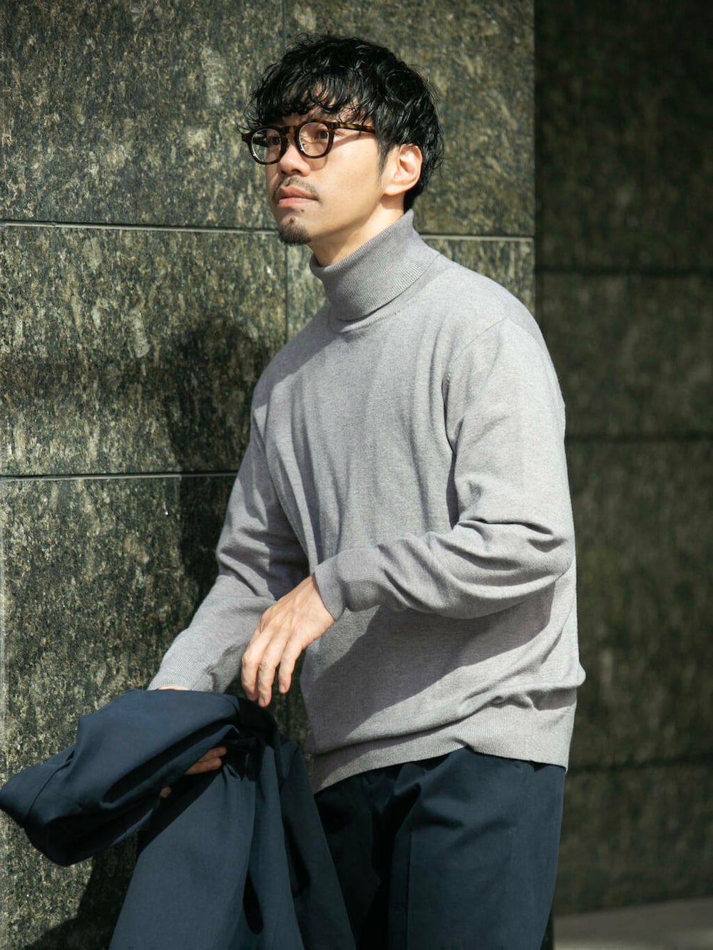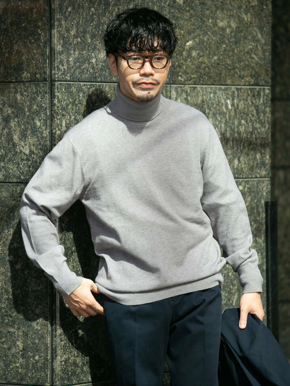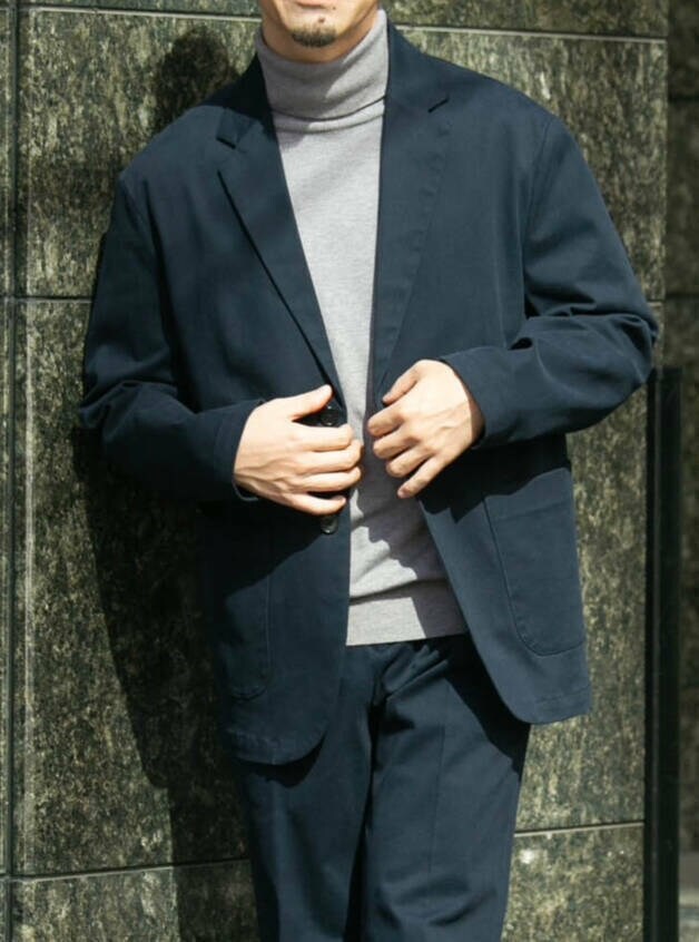 セットアップの素材感とタートルネックで季節感を出してシーズンチェンジを演出