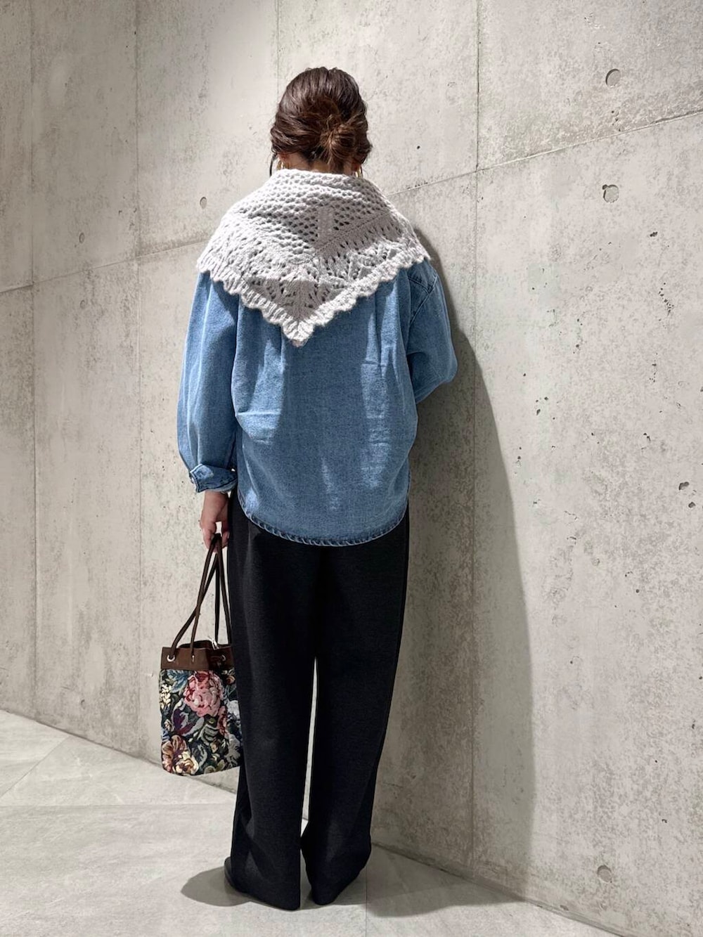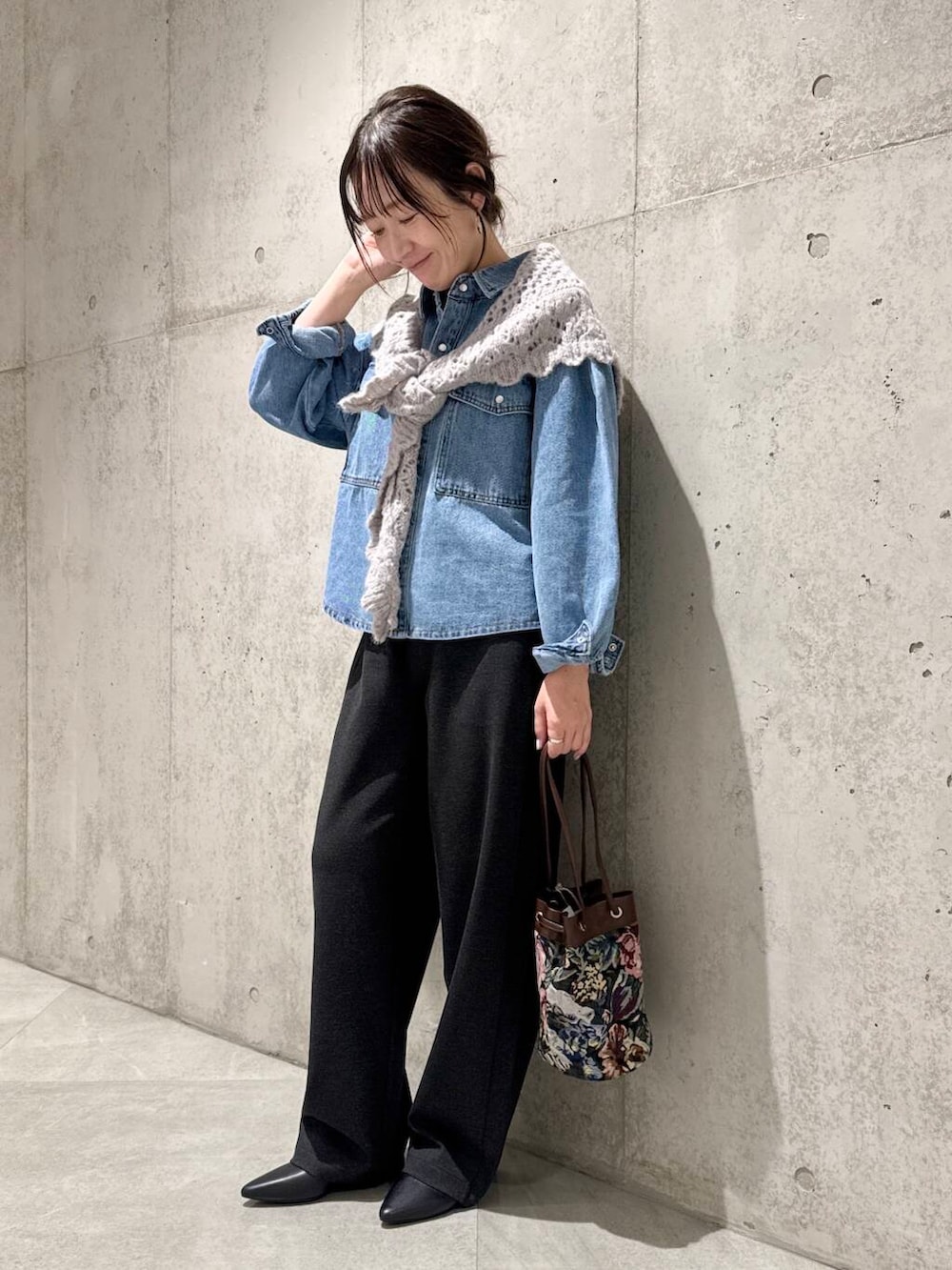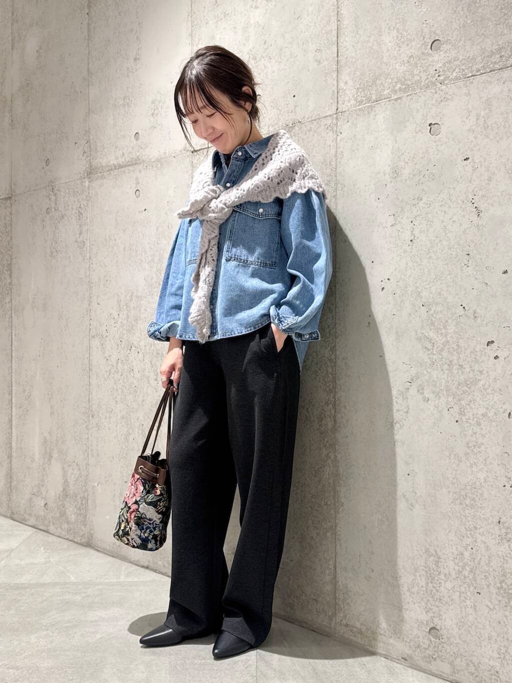 ニットのストールをアクセントに。