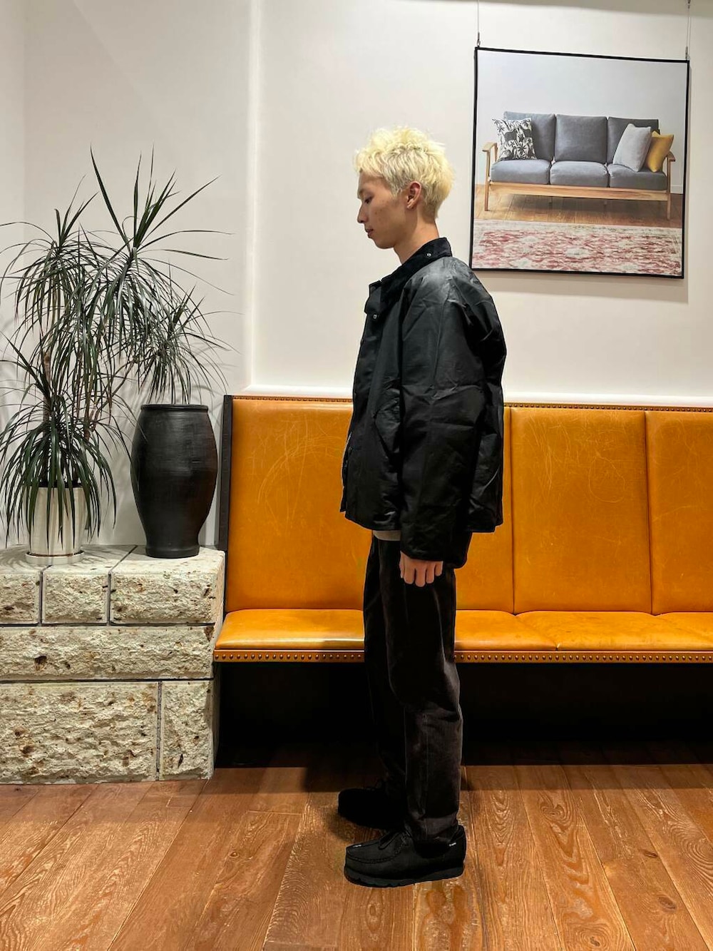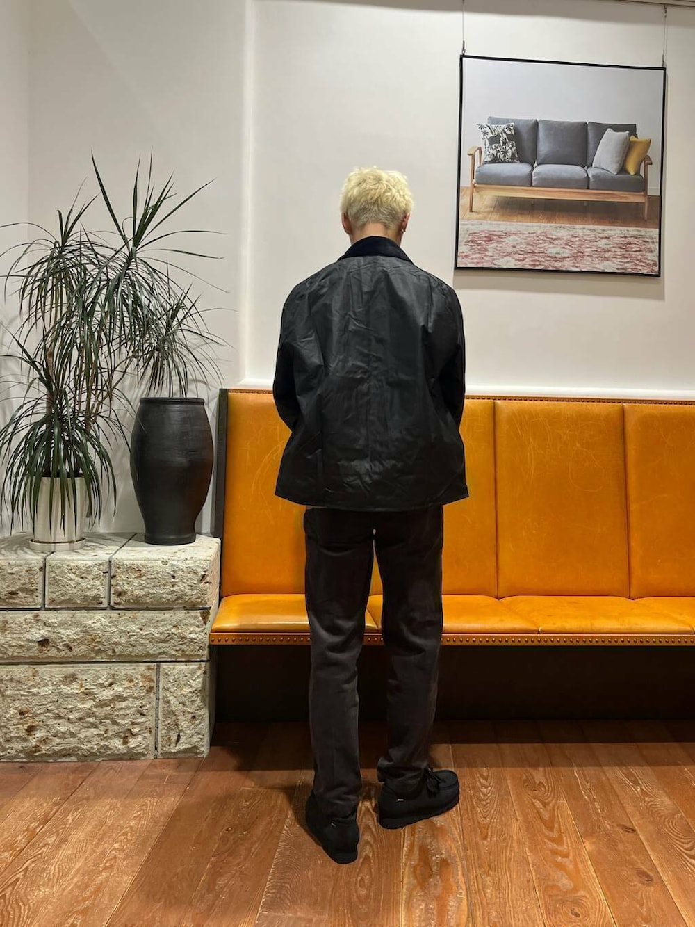Barbour TRANSPORT WAX JACKET とミラノリブニットで綺麗めカジュアルに合わせています