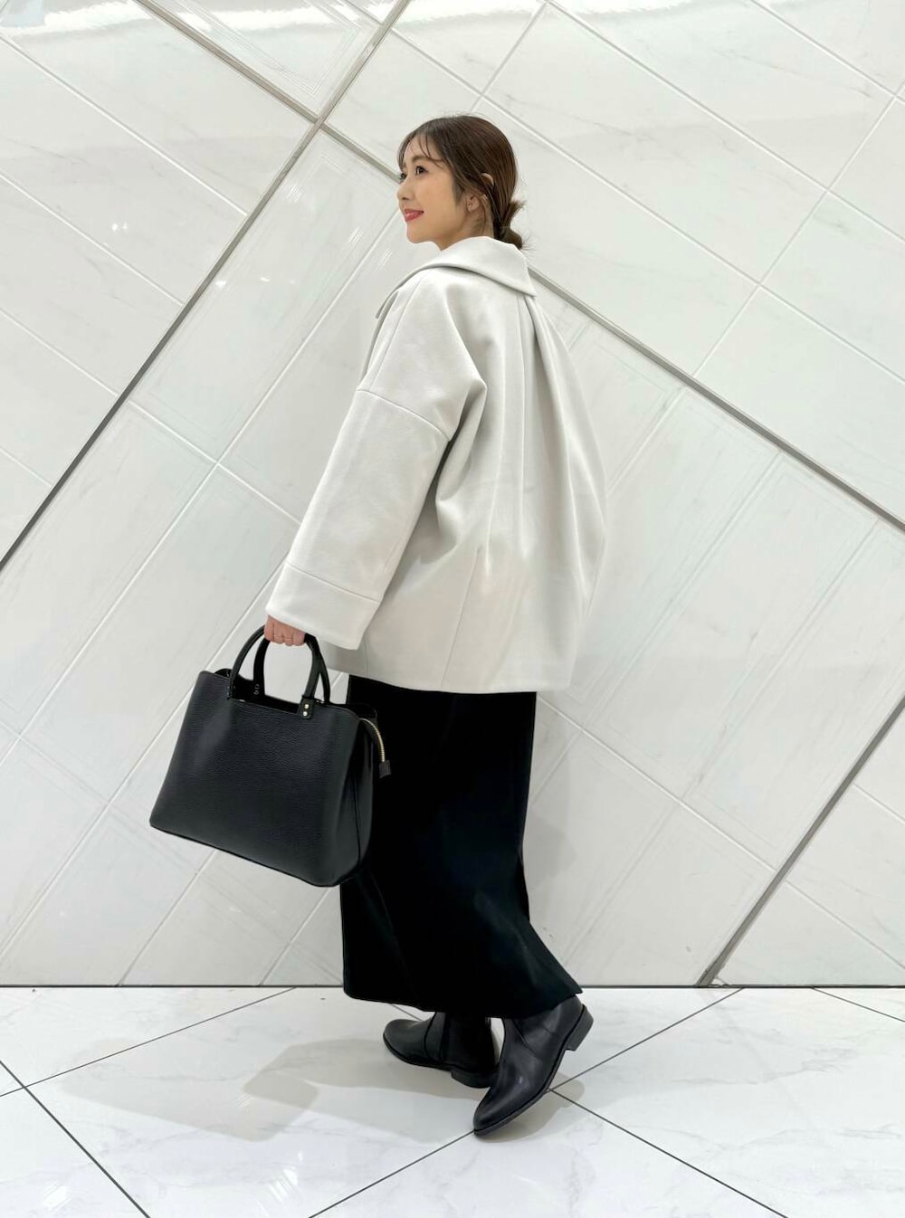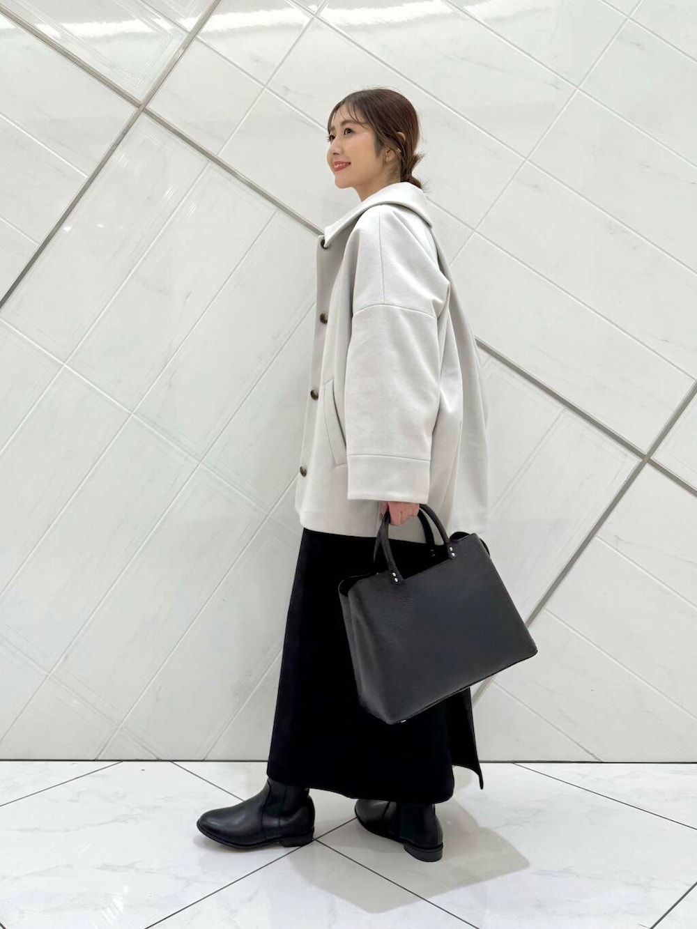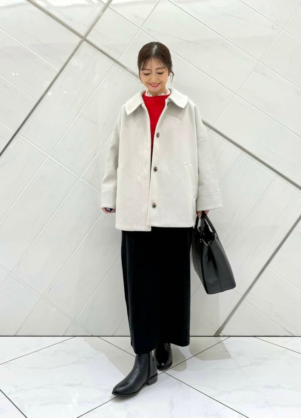 ニットの上からでも楽に羽織ることができるくらいゆとりのあるサイズ感でヒップが隠れる着丈です。