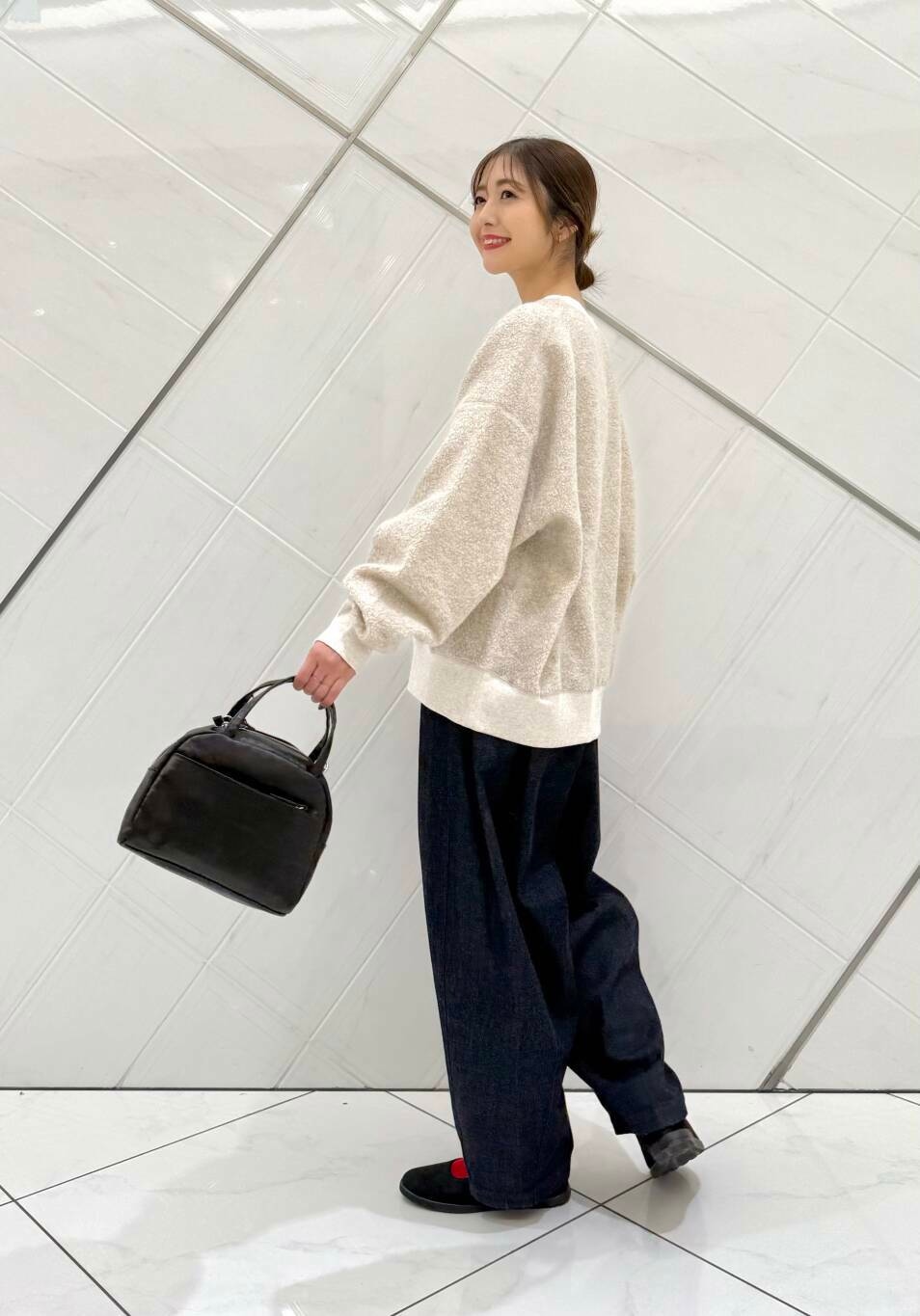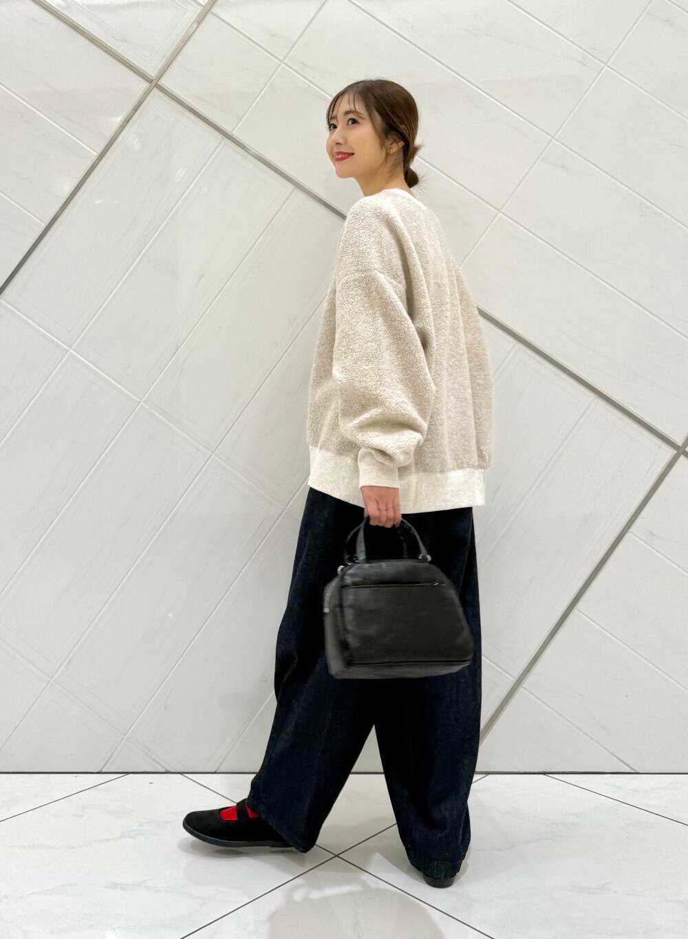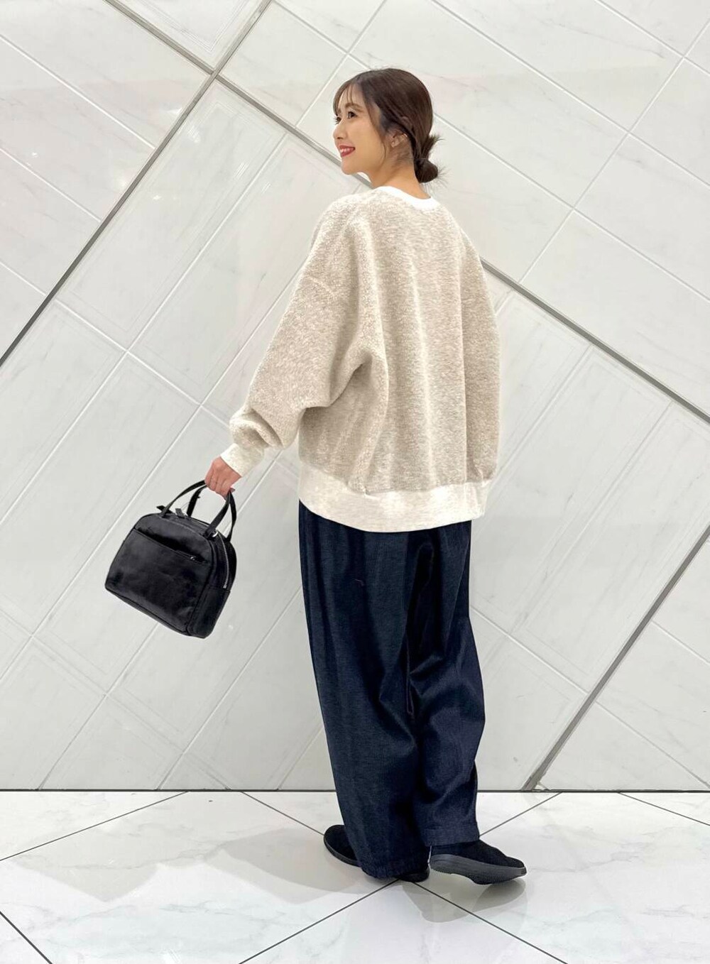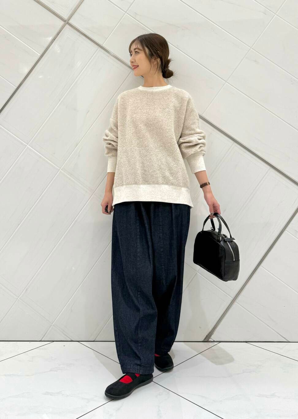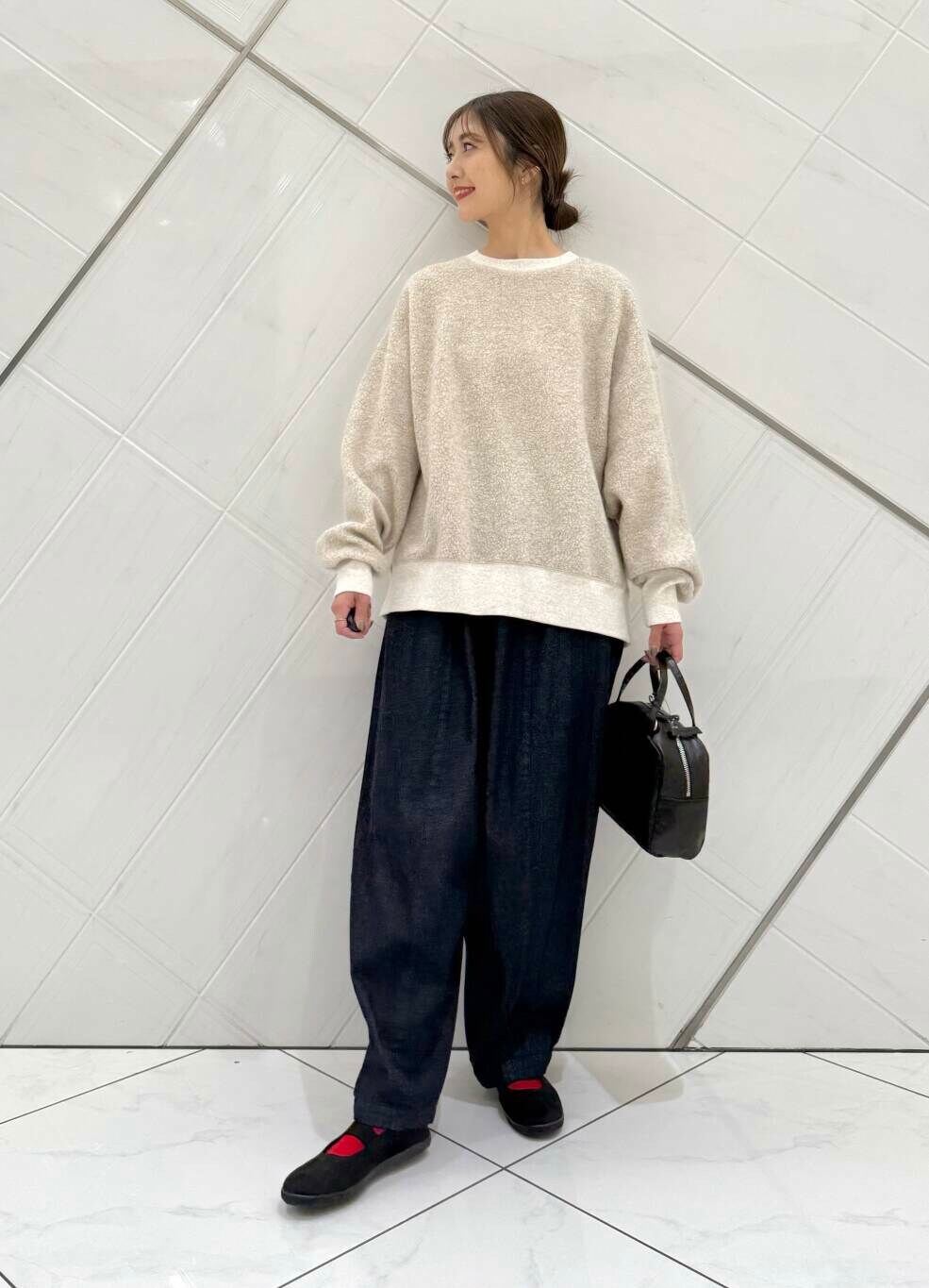 ボトムはボリュームのあるゆったりとしたシルエットで着丈が短めなのでバランスよく着ていただけると思います。