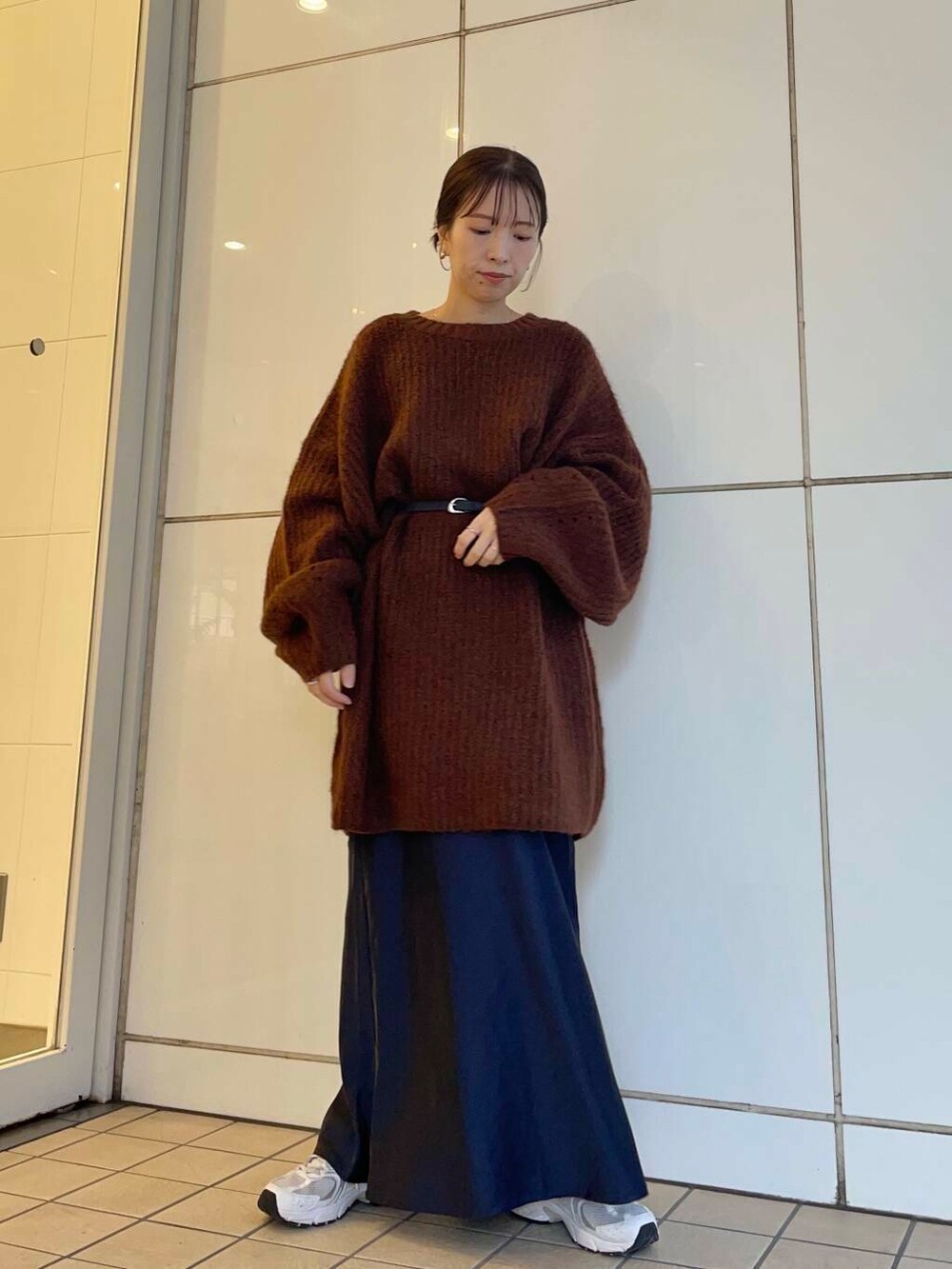 ニットは淡い色を選びがちですが、ブラウンが気になったのでサテンスカートと合わせて大人コーデにしてみました◎