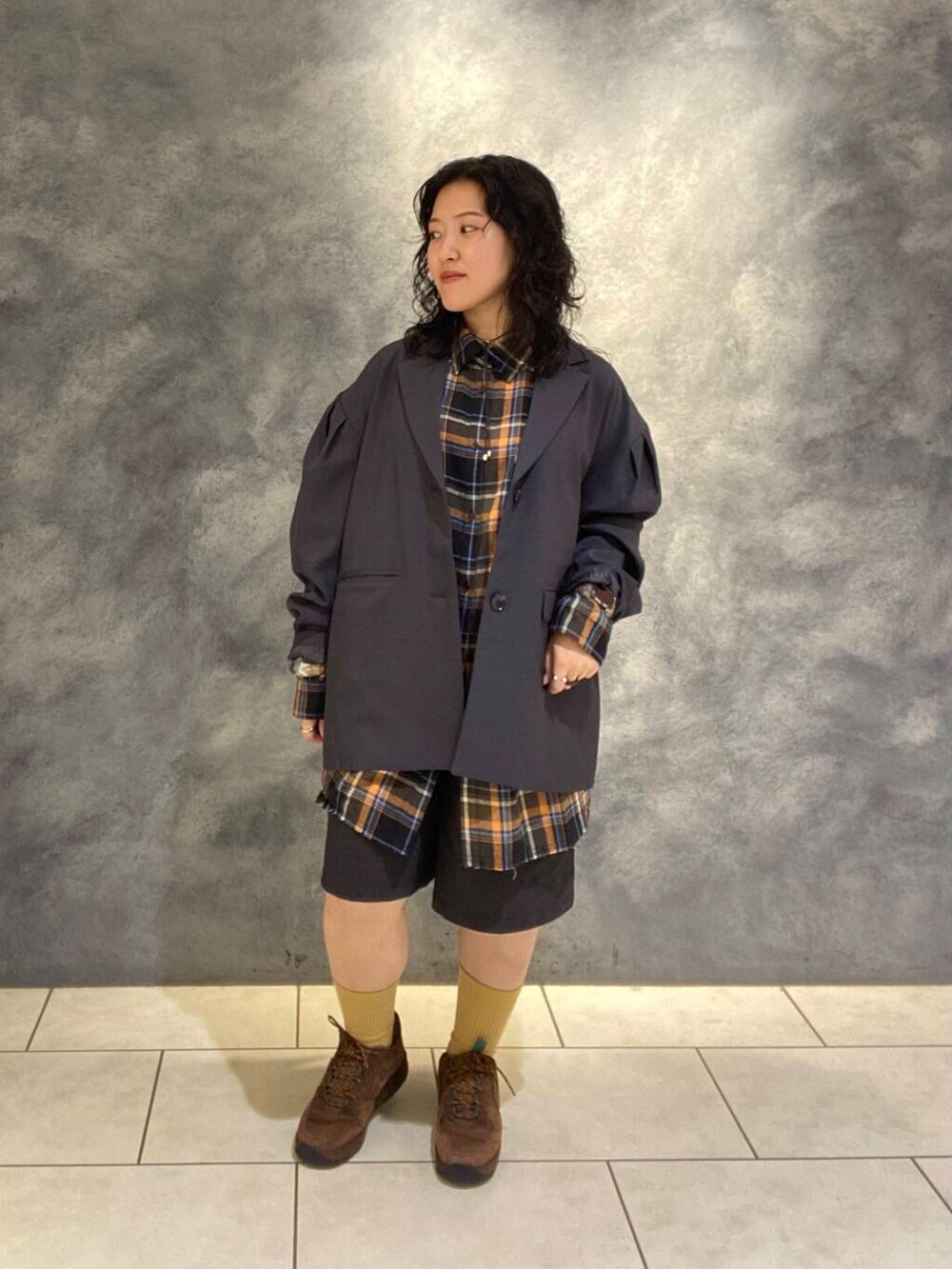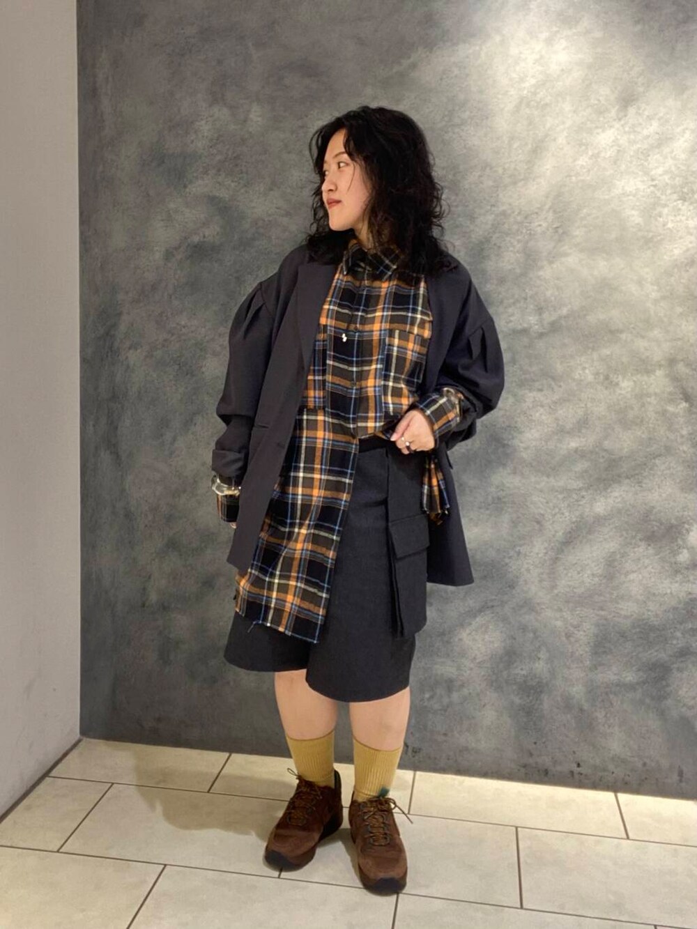 こっくり秋らしいカラーのシャツ×ぽふっとしたシルエットが可愛いジャケットの組み合わせ🥹❤️