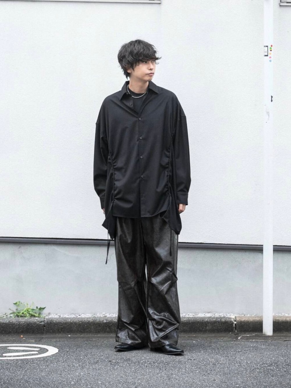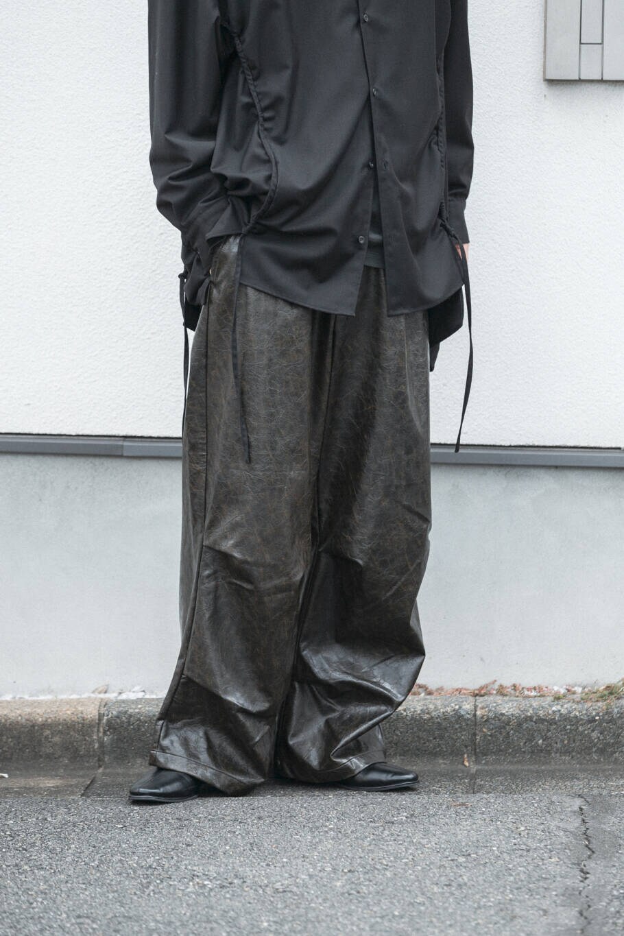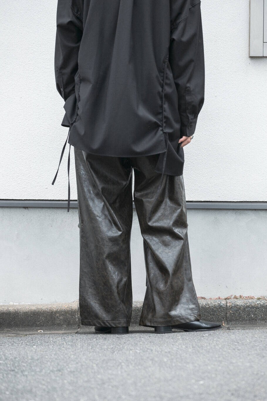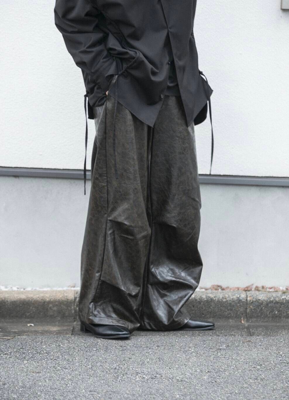 フェイクレザーの素材感がブラックのワントーンコーデにも動きをつけてくれますよ!