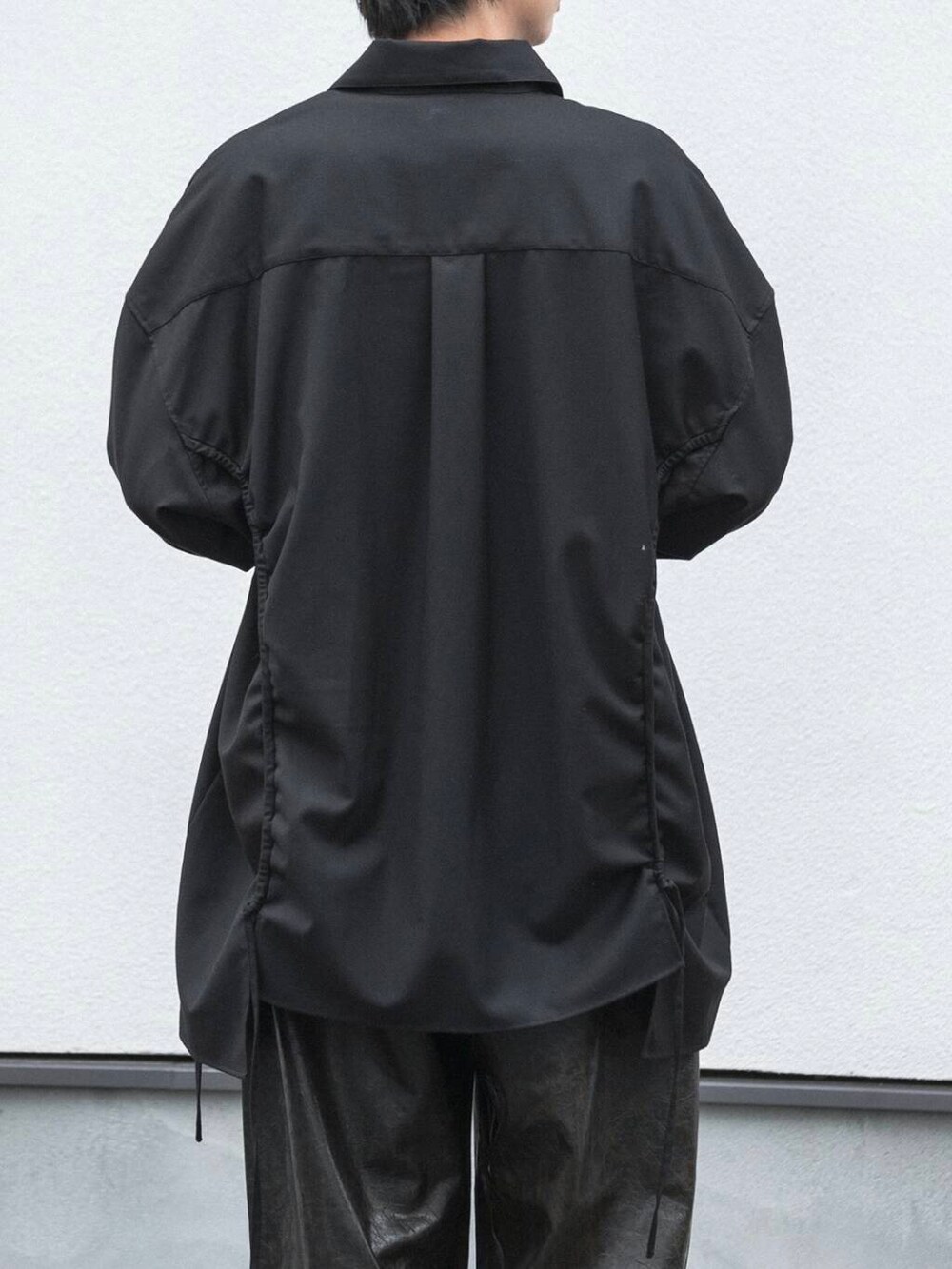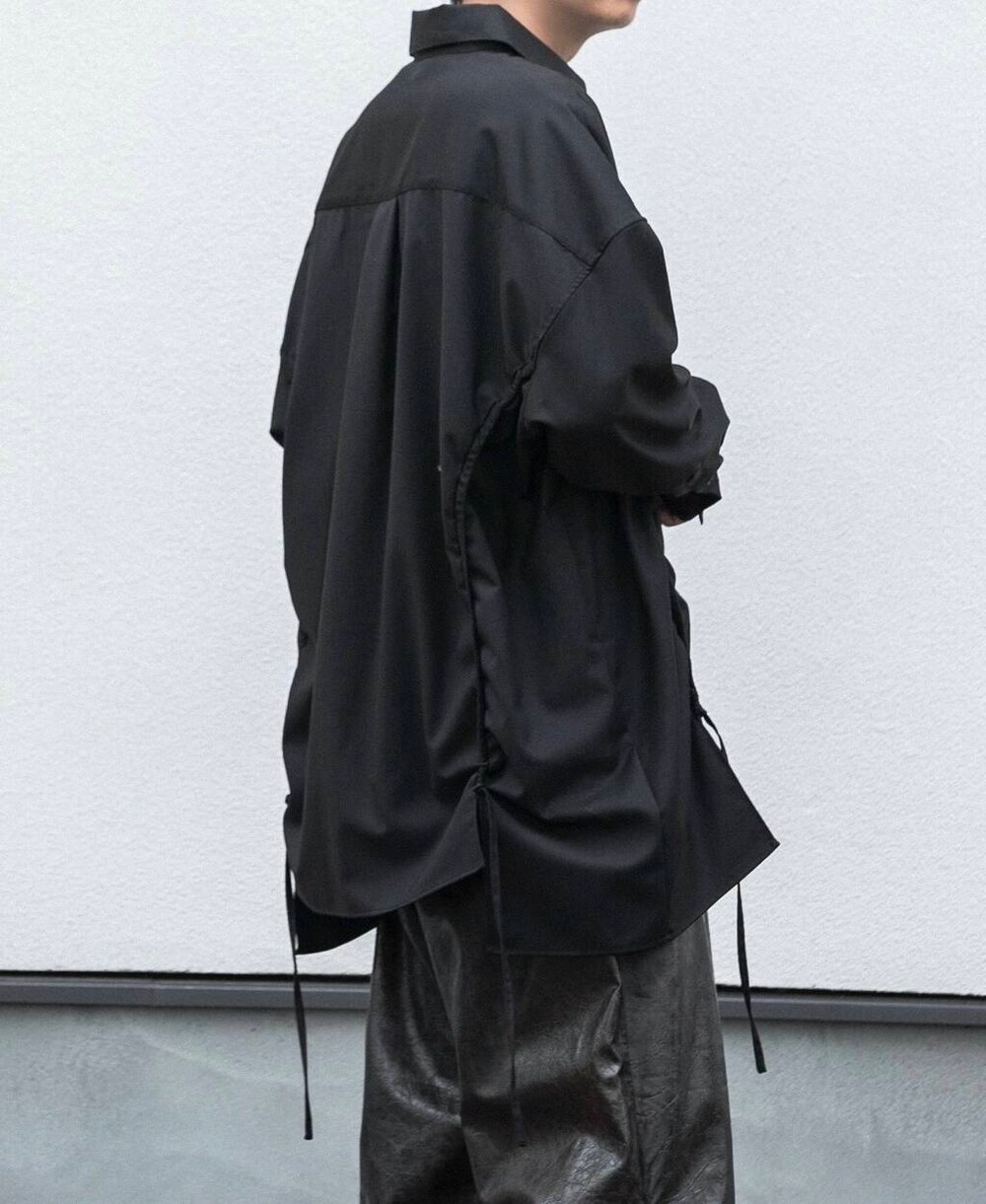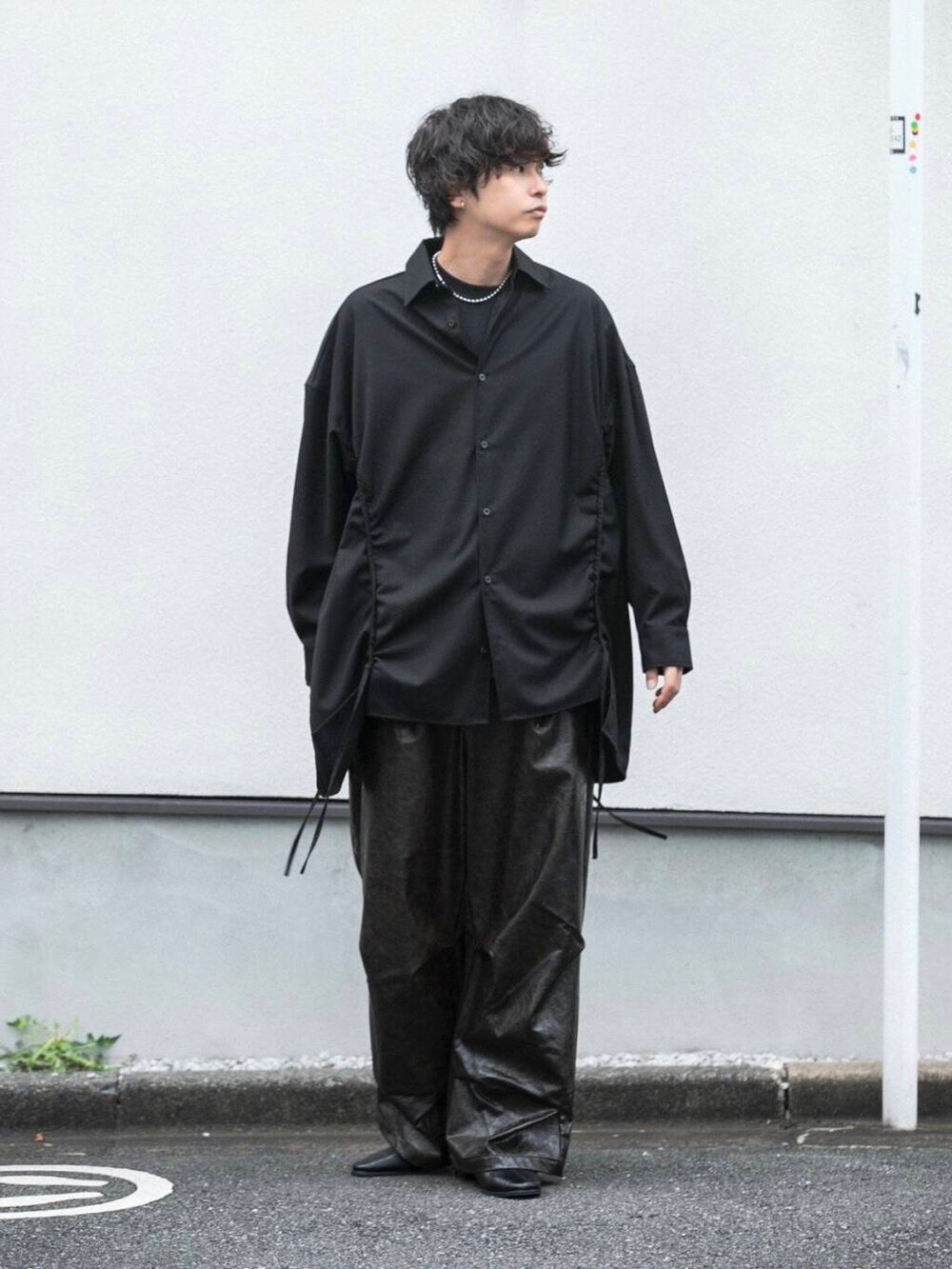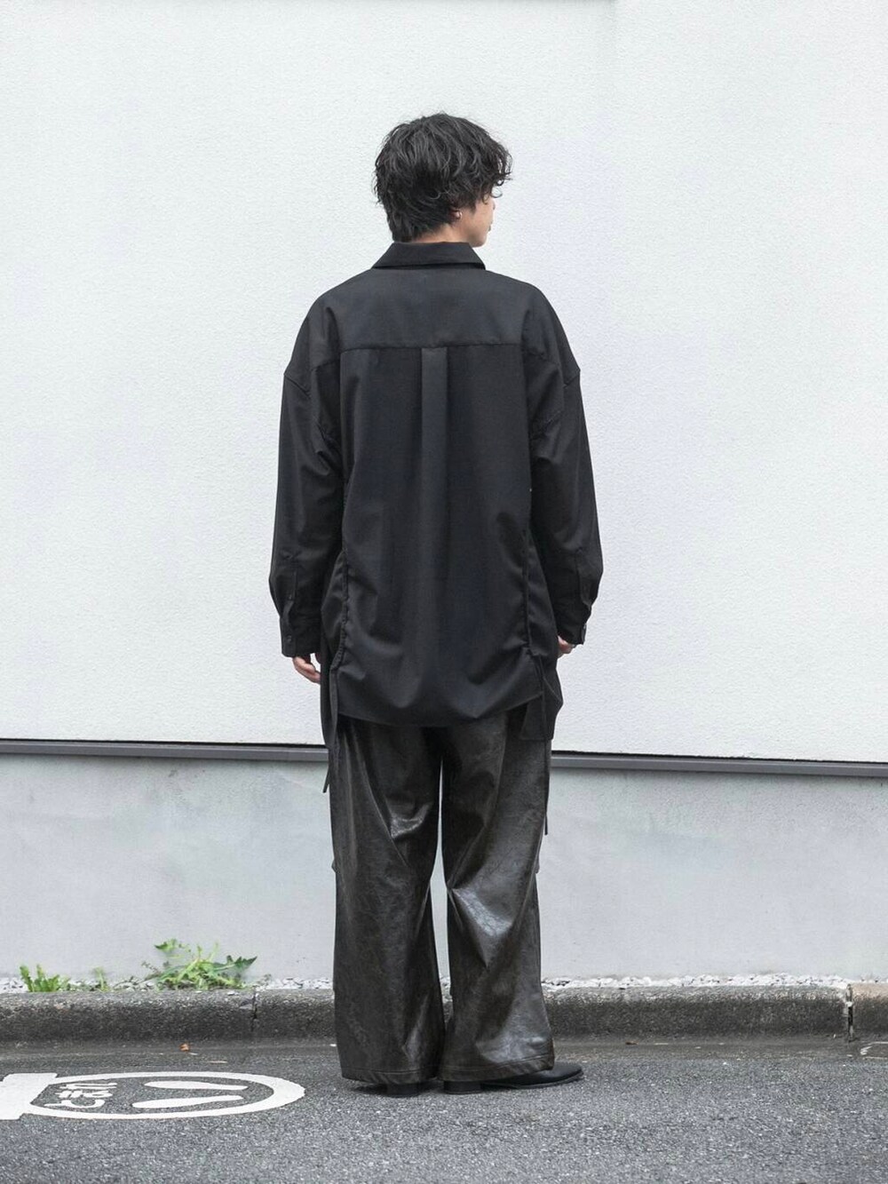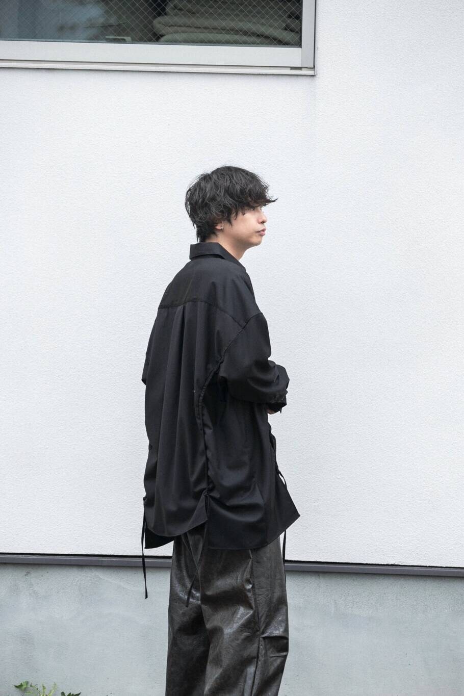 フェイクレザーの素材感がブラックのワントーンコーデにも動きをつけてくれますよ!