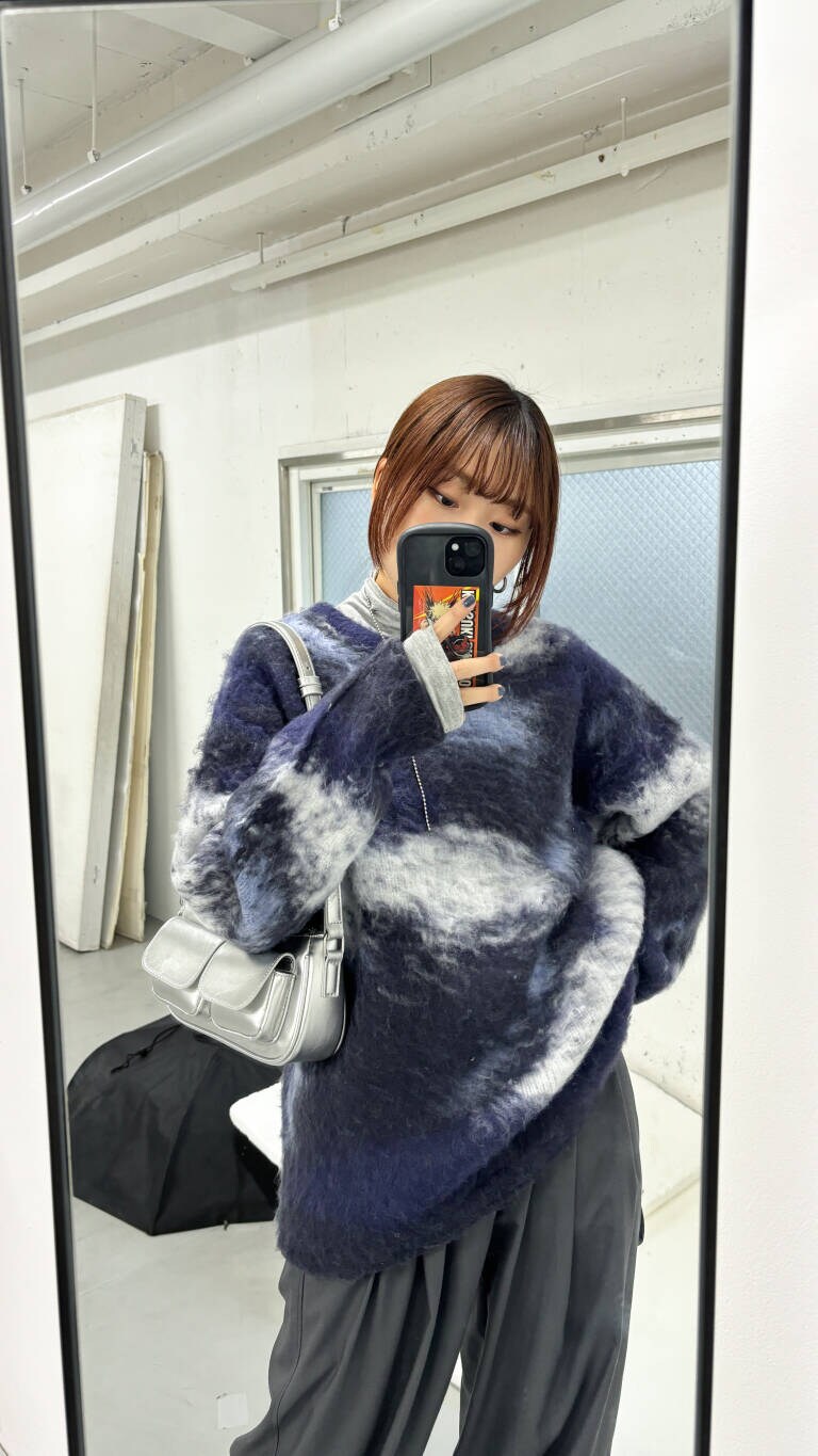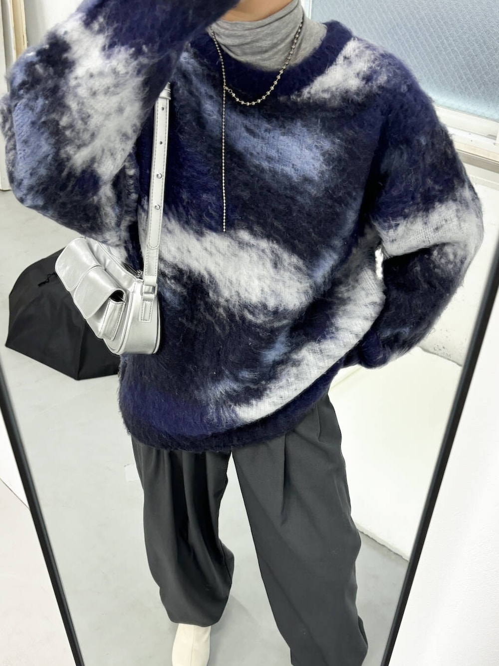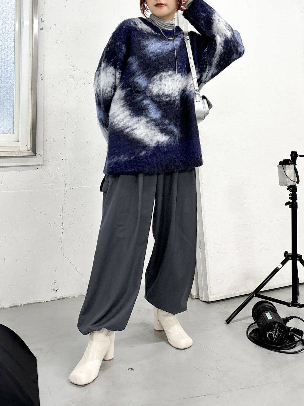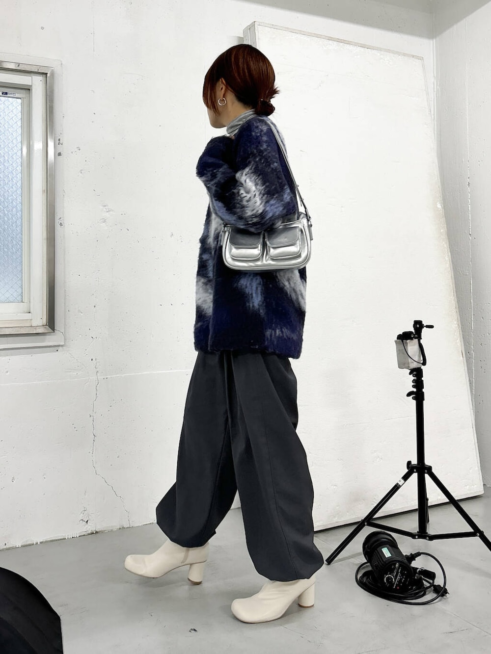 無彩色系のアイテムと合わせてニットが目立つように〇