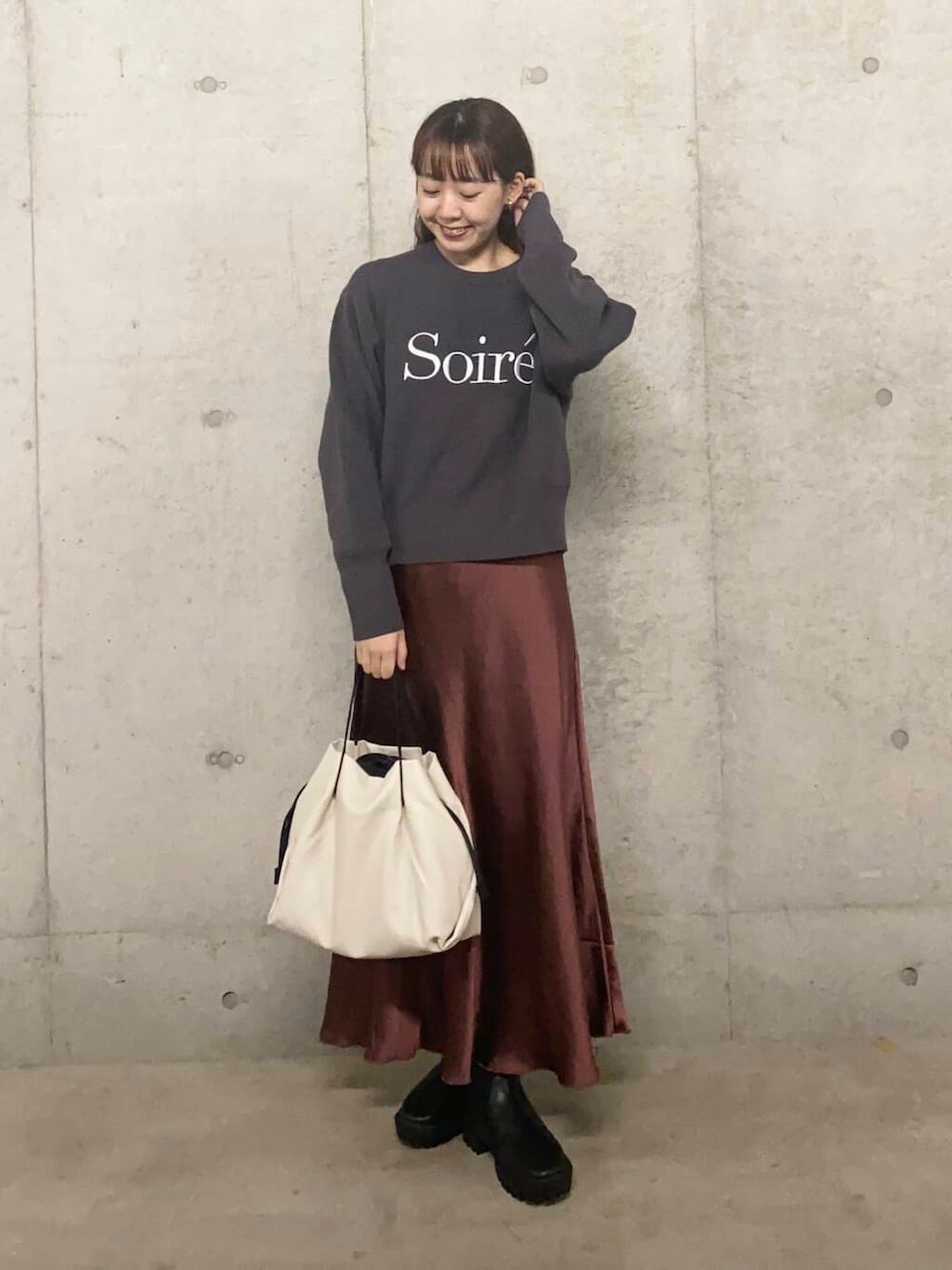 ロゴセーターはかなりカジュアルな印象が強いアイテムですが、サテンのスカートと合わせるだけで一気に大人スタイルに大変身です🥺✨️