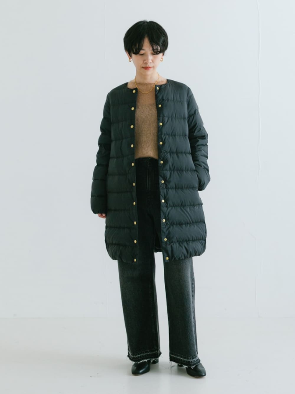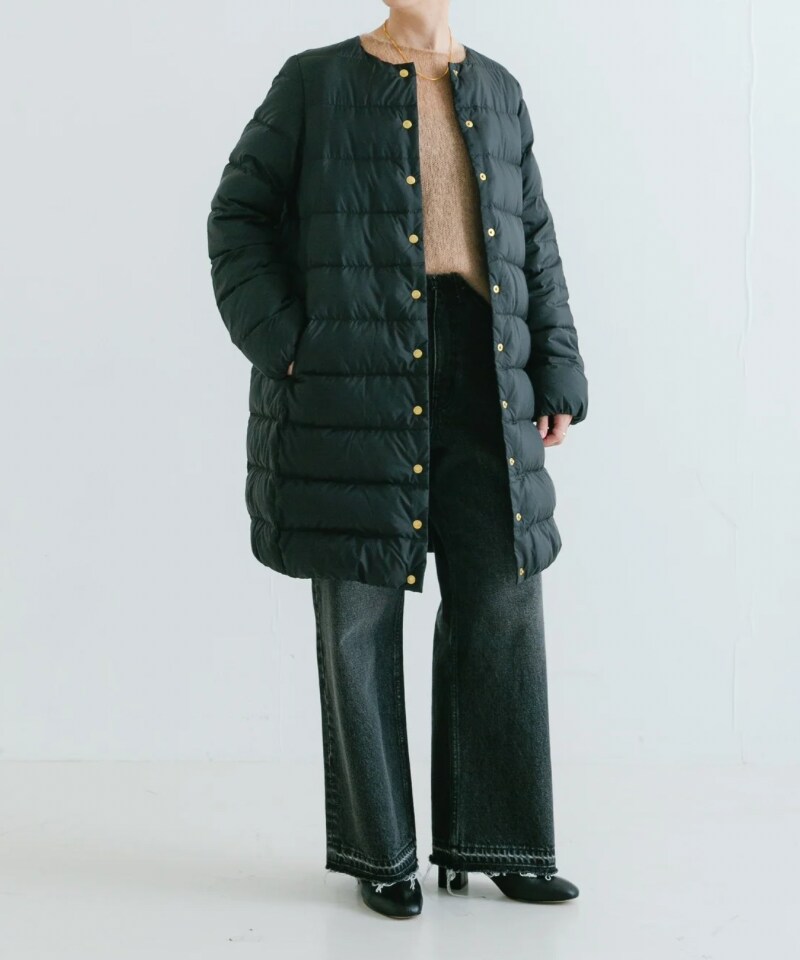 ノーカラーなのでマフラーやストールを巻いてももたつかず、すっきりとした首元に仕上がります。