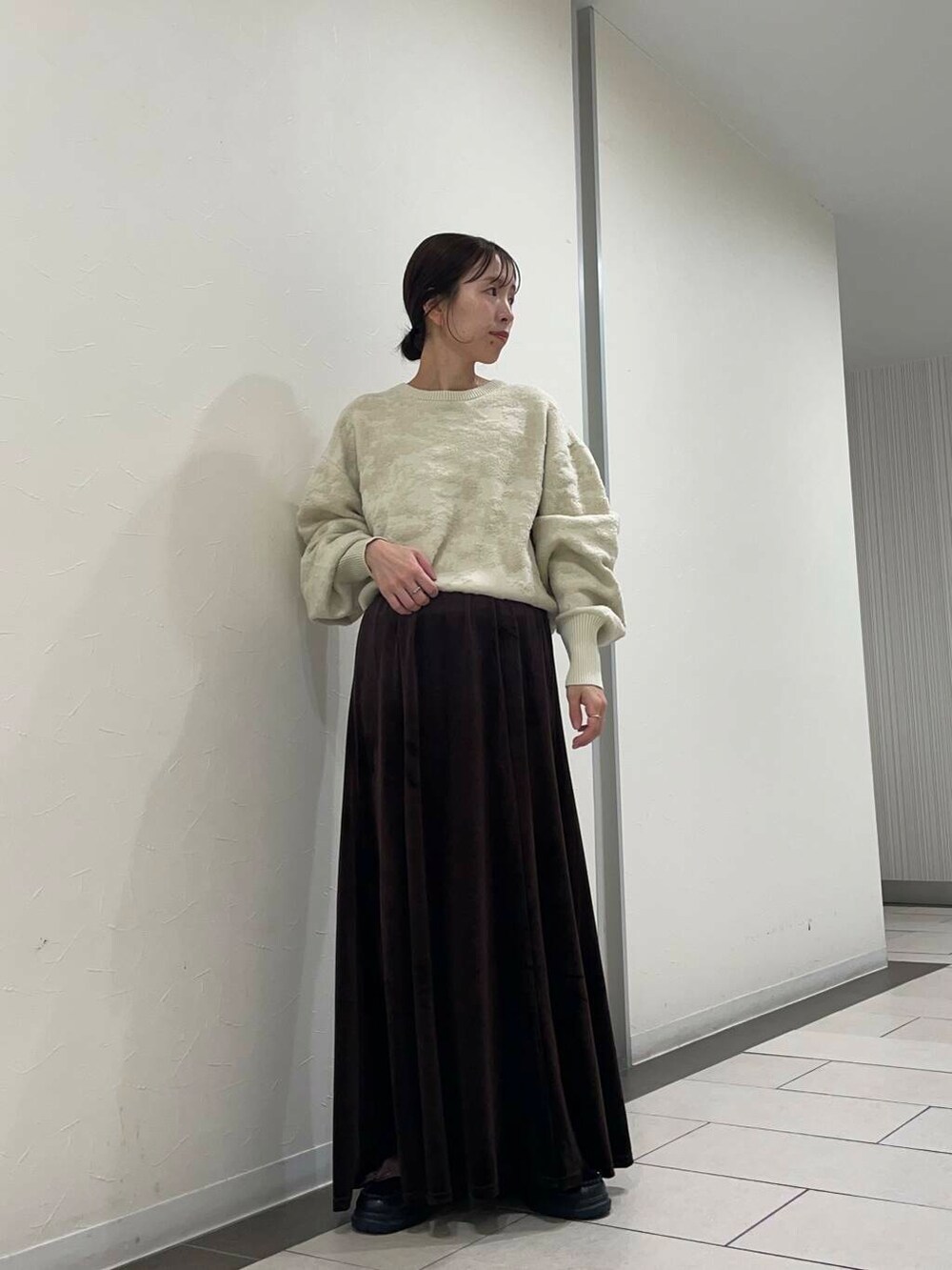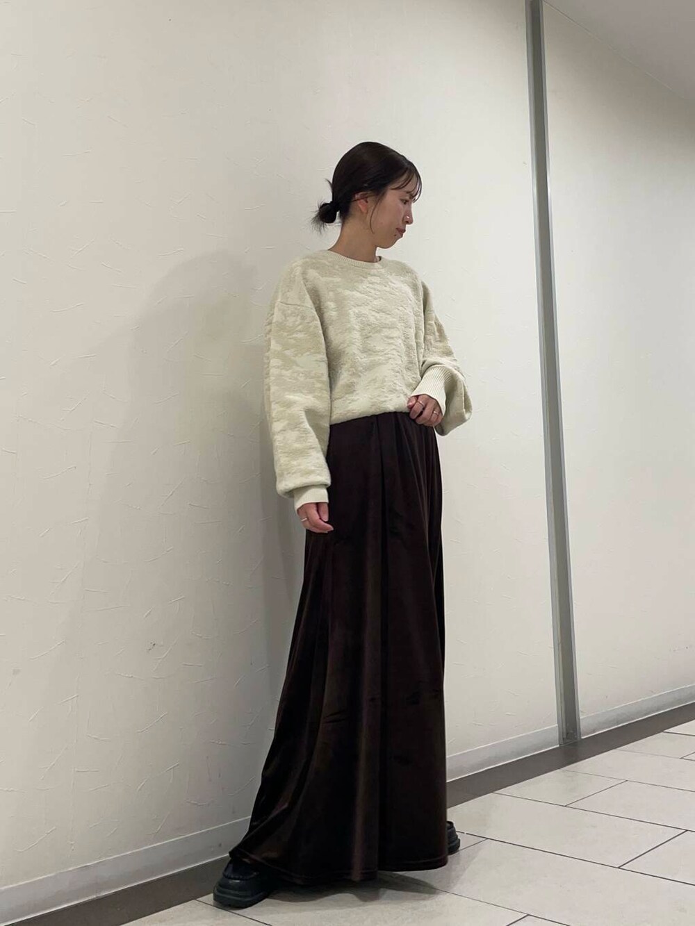 ベージュだとマーブル柄が同系色で馴染む色合いなのでベロアスカートと合わせてめりはりをつけました◎