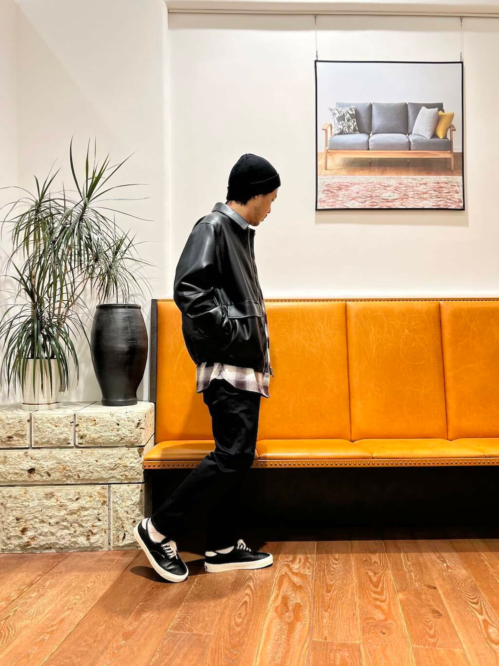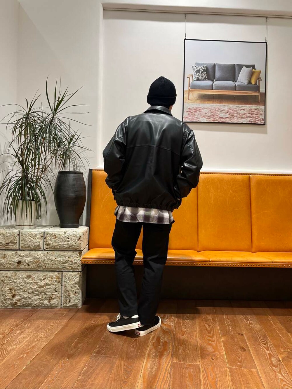 フェイクレザーを使用したジャケットにオンブレチェックのオーバーシャツを合わせ裾からのレイヤードがアクセントになるコーディネートへ。