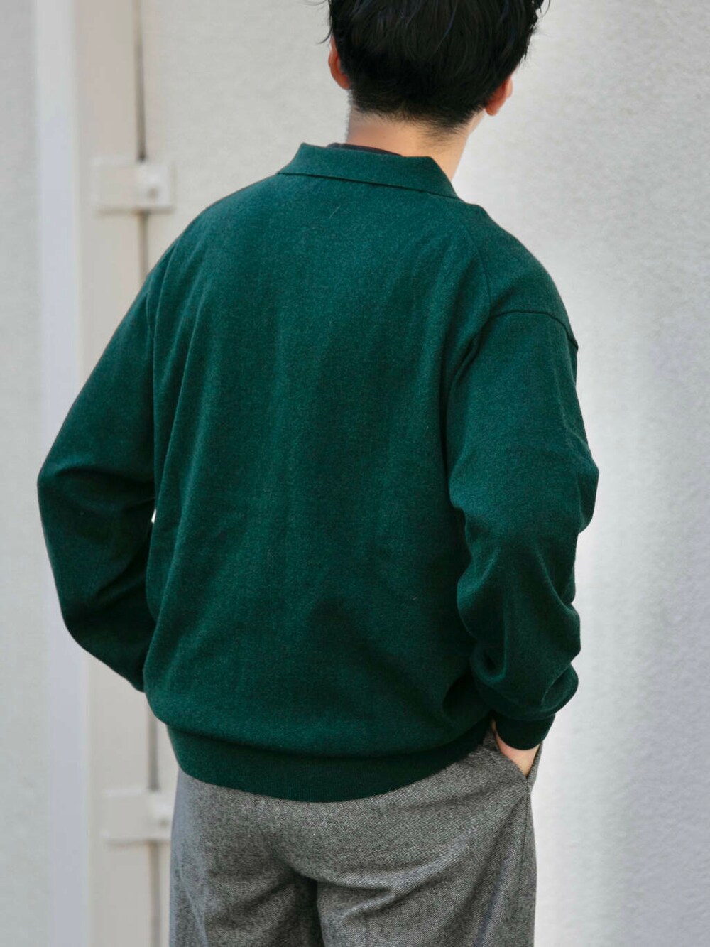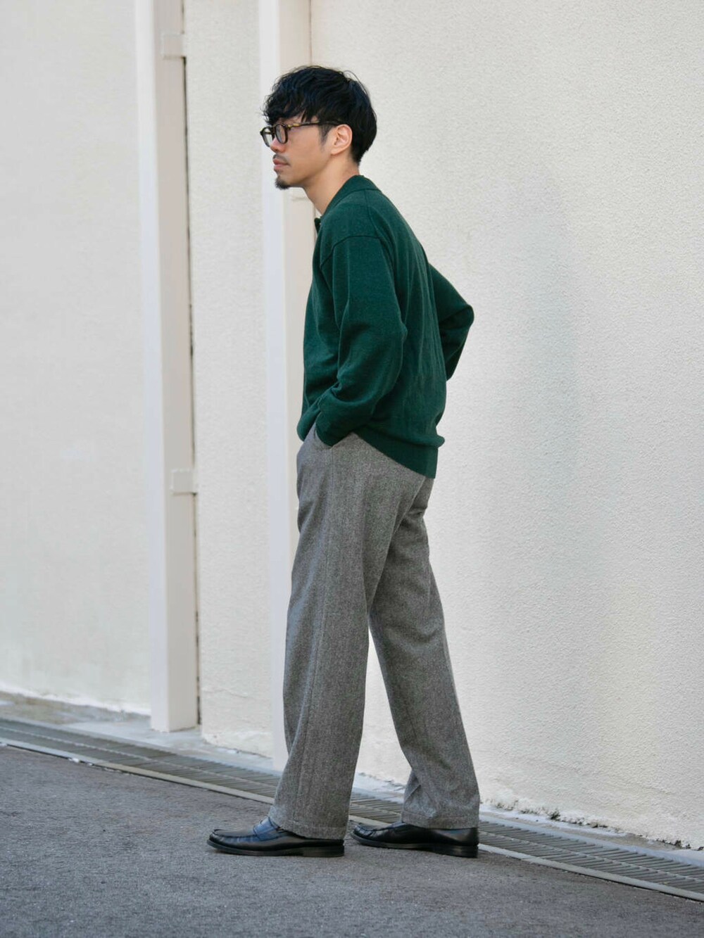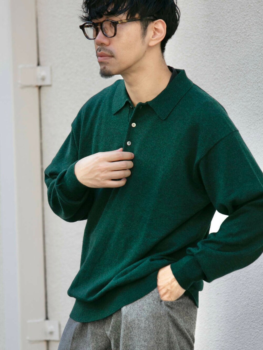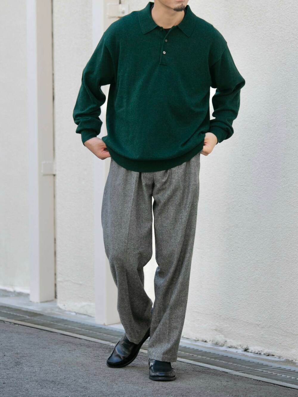 グリーンのニットポロシャツを主役にツイードパンツと合わせて!