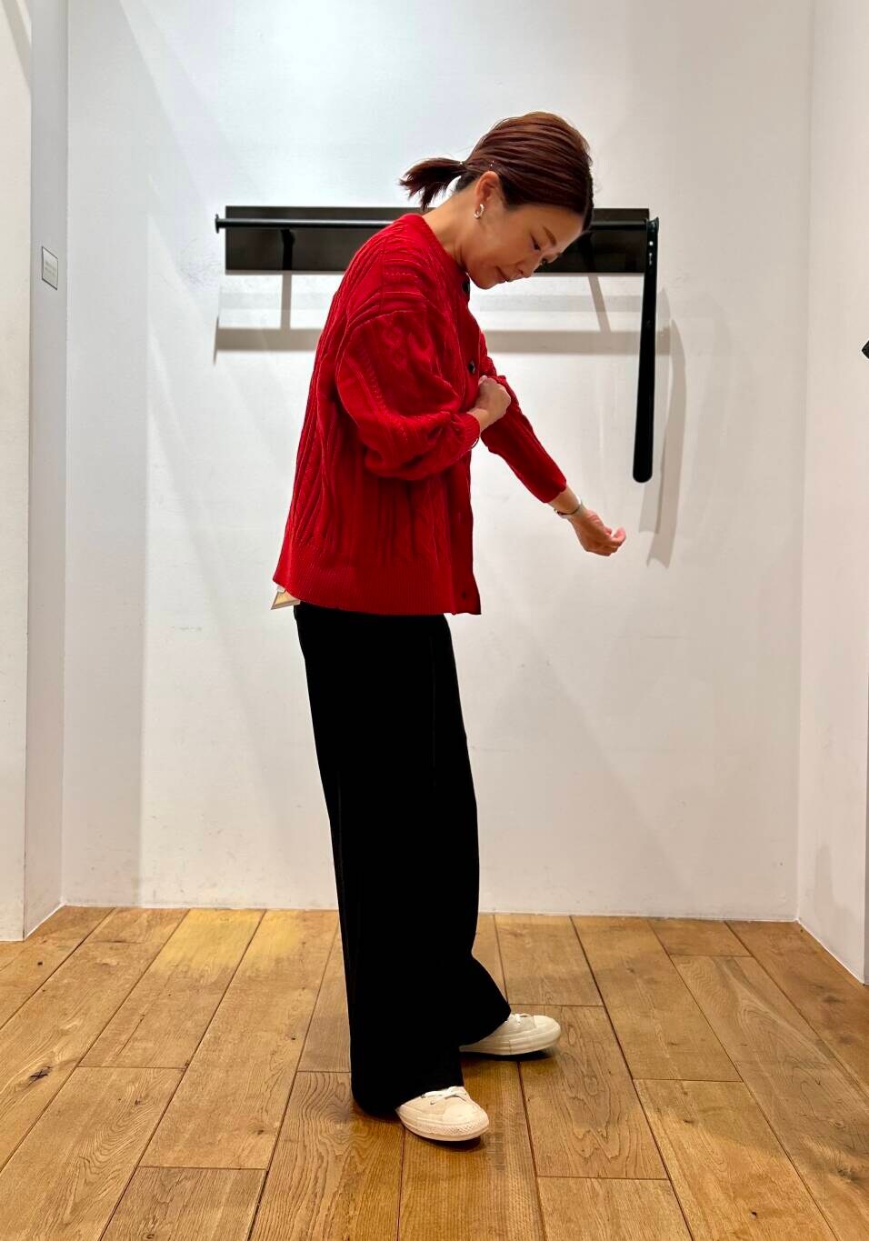 ビビットな赤のアラン柄のカーディガンは、アクセントになるのでオススメです!