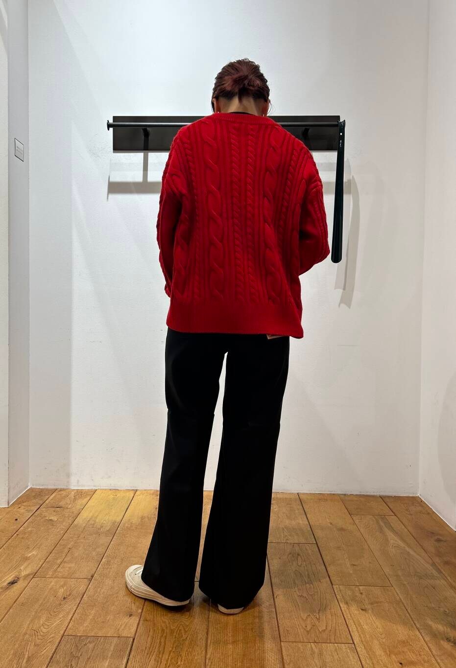 柔らかな印象のケーブル編みに、ビビットな赤がポイントのカーディガンは肌寒くなるこれからの時期にオススメです。