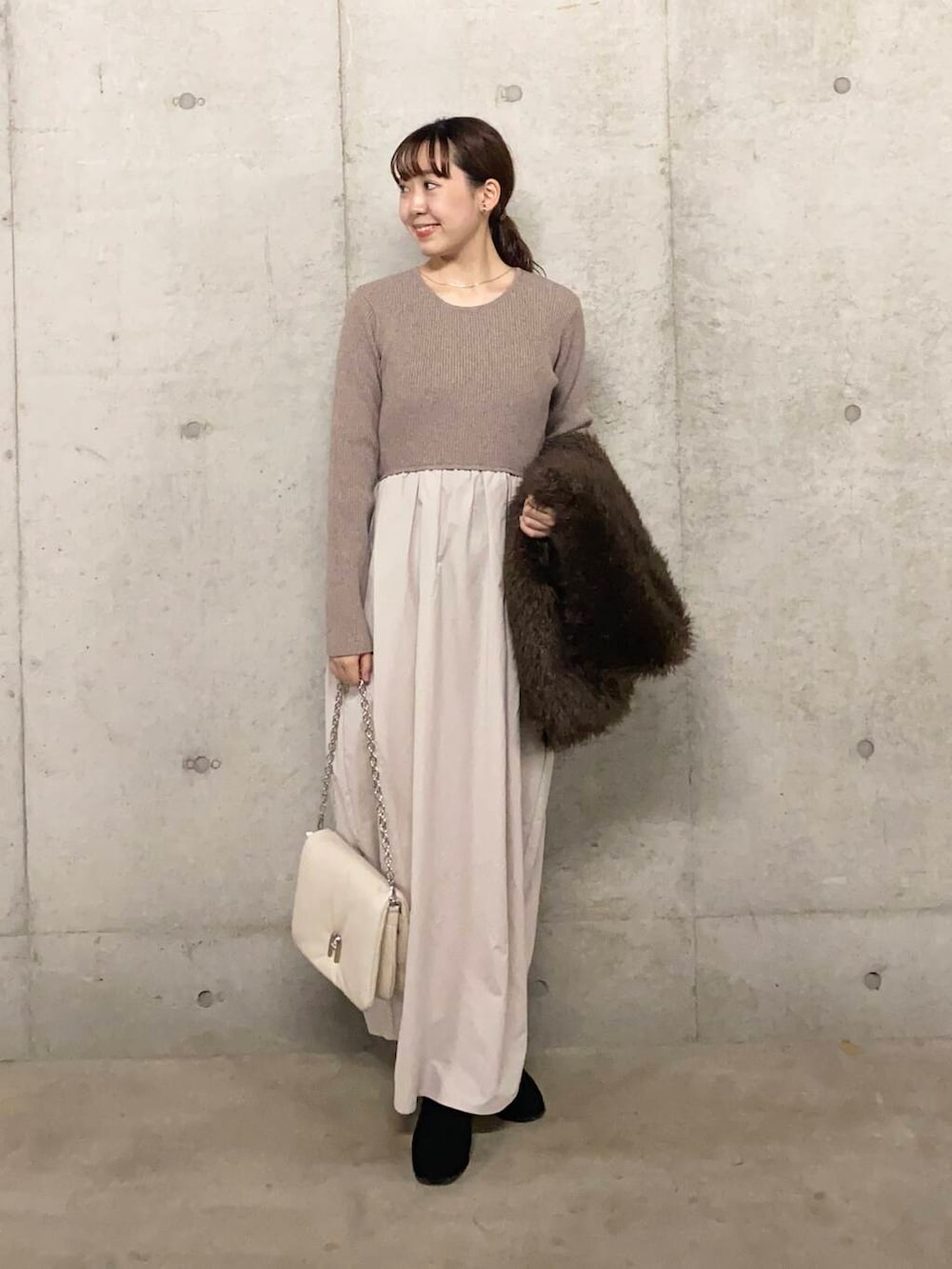 1枚着るだけでドレッシーな印象のワンピースを、ロング丈のファーベストでカジュアルダウンさせてみました🥺