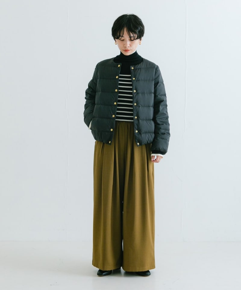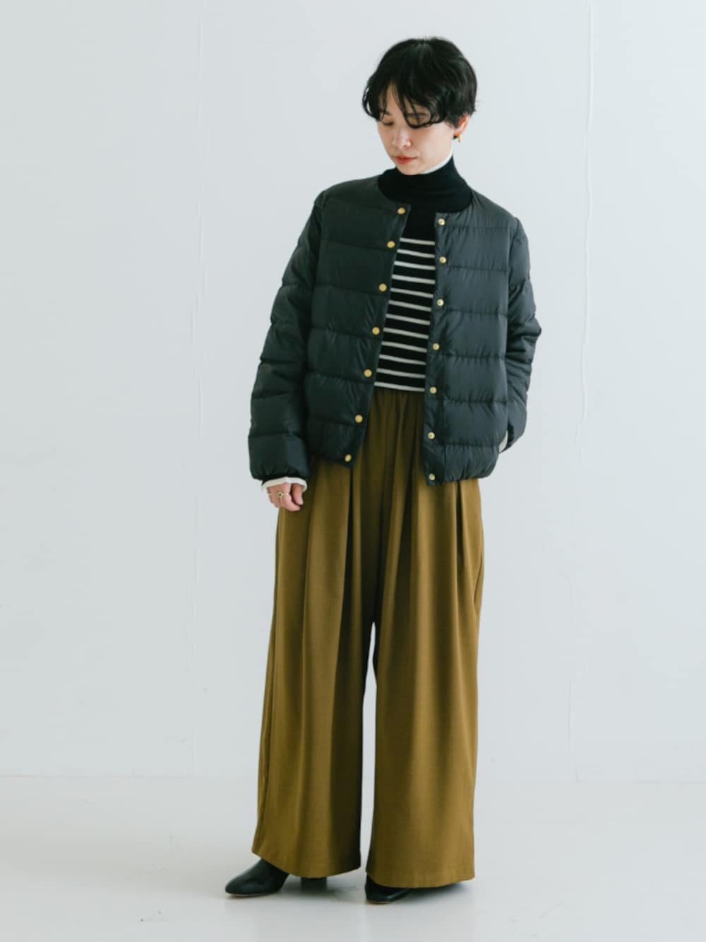 ノーカラーなのでマフラーやストールを巻いてももたつかず、すっきりとした首元に仕上がります。