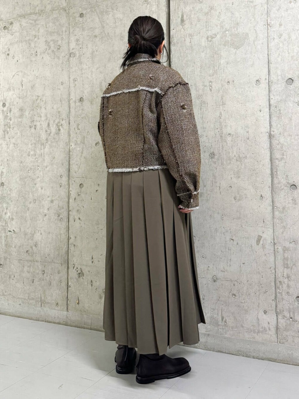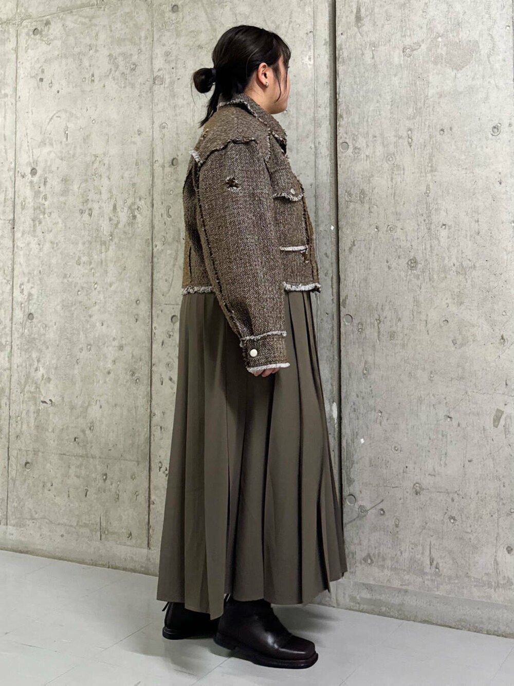 ツイードジャケットはダメージ加工されたデザインが珍しく、カジュアルにも着ていただけるアウターになってます!
