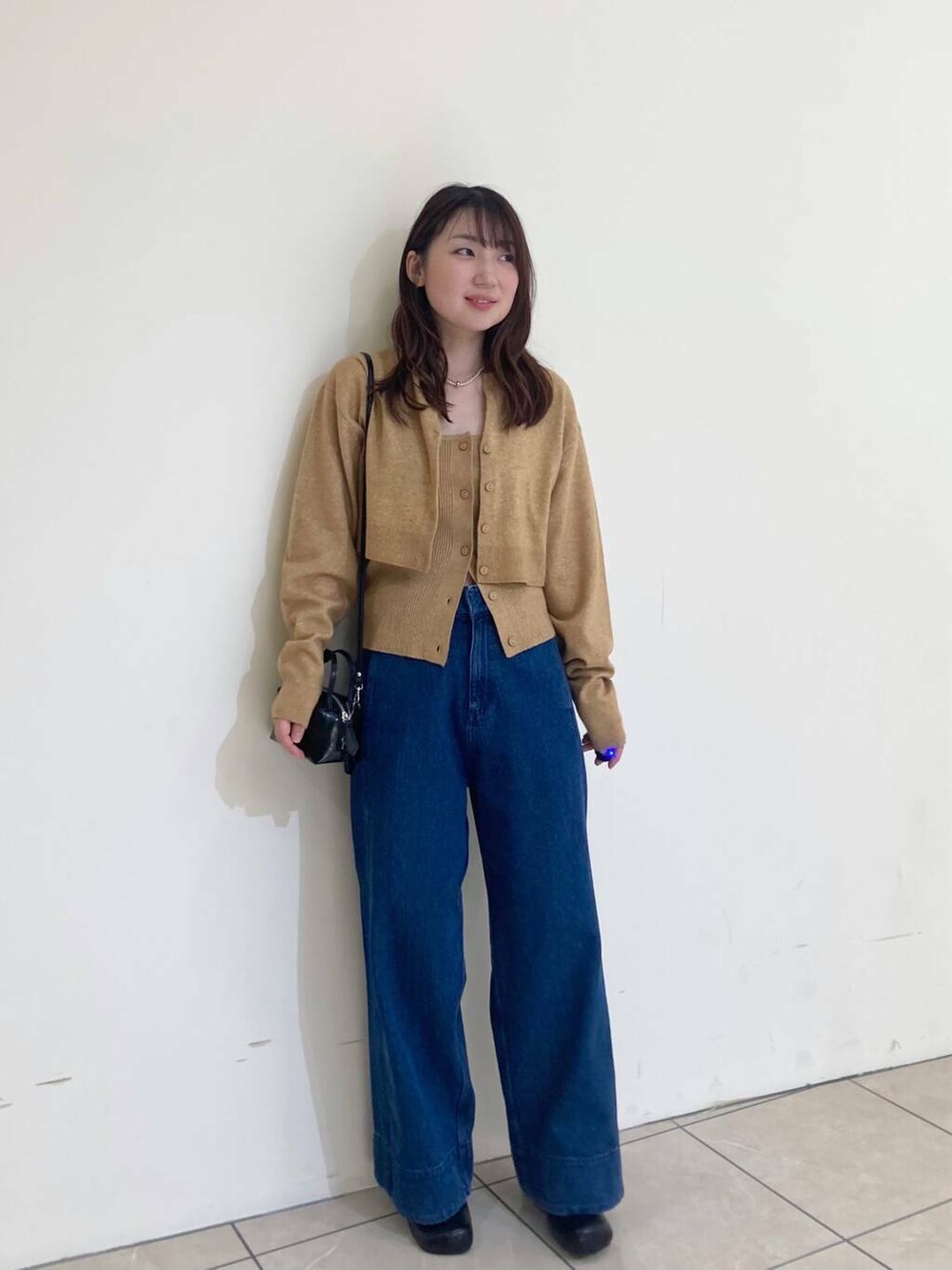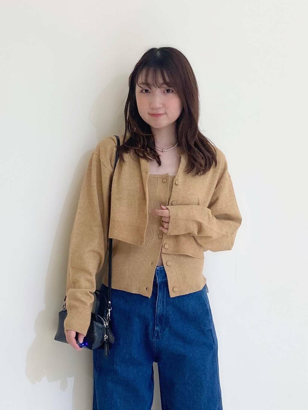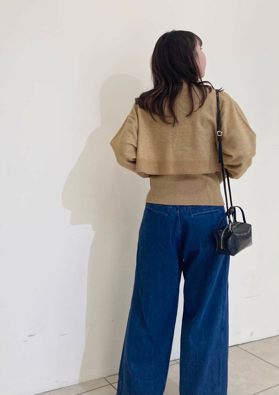 短丈のカーディガンと身体にフィットしてくれるビスチェのバランスで、すっきり見えが叶います✨