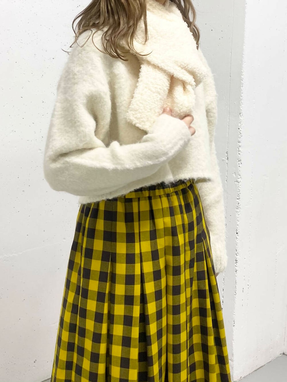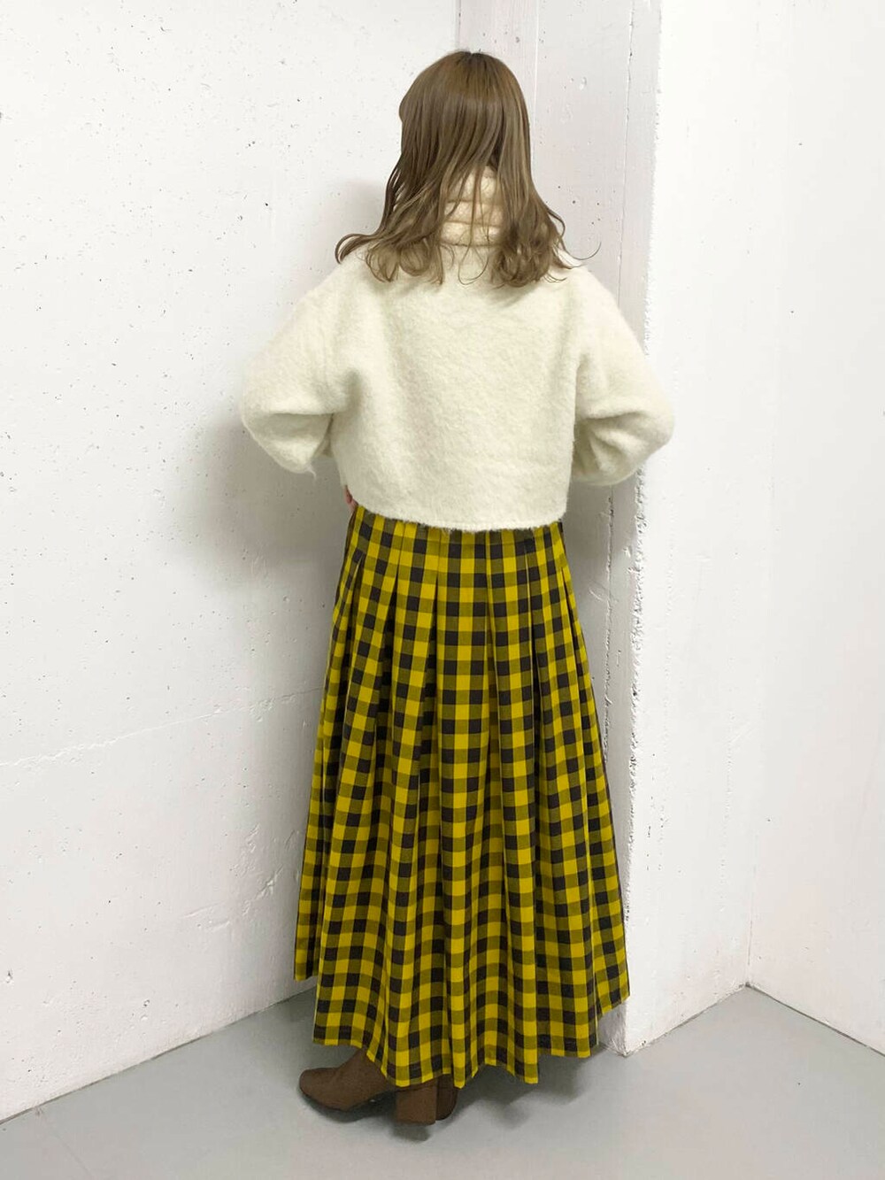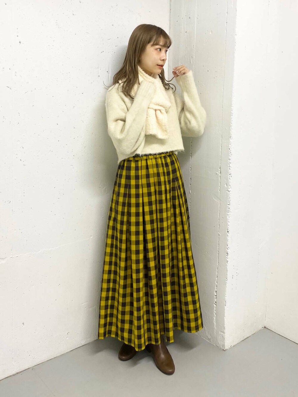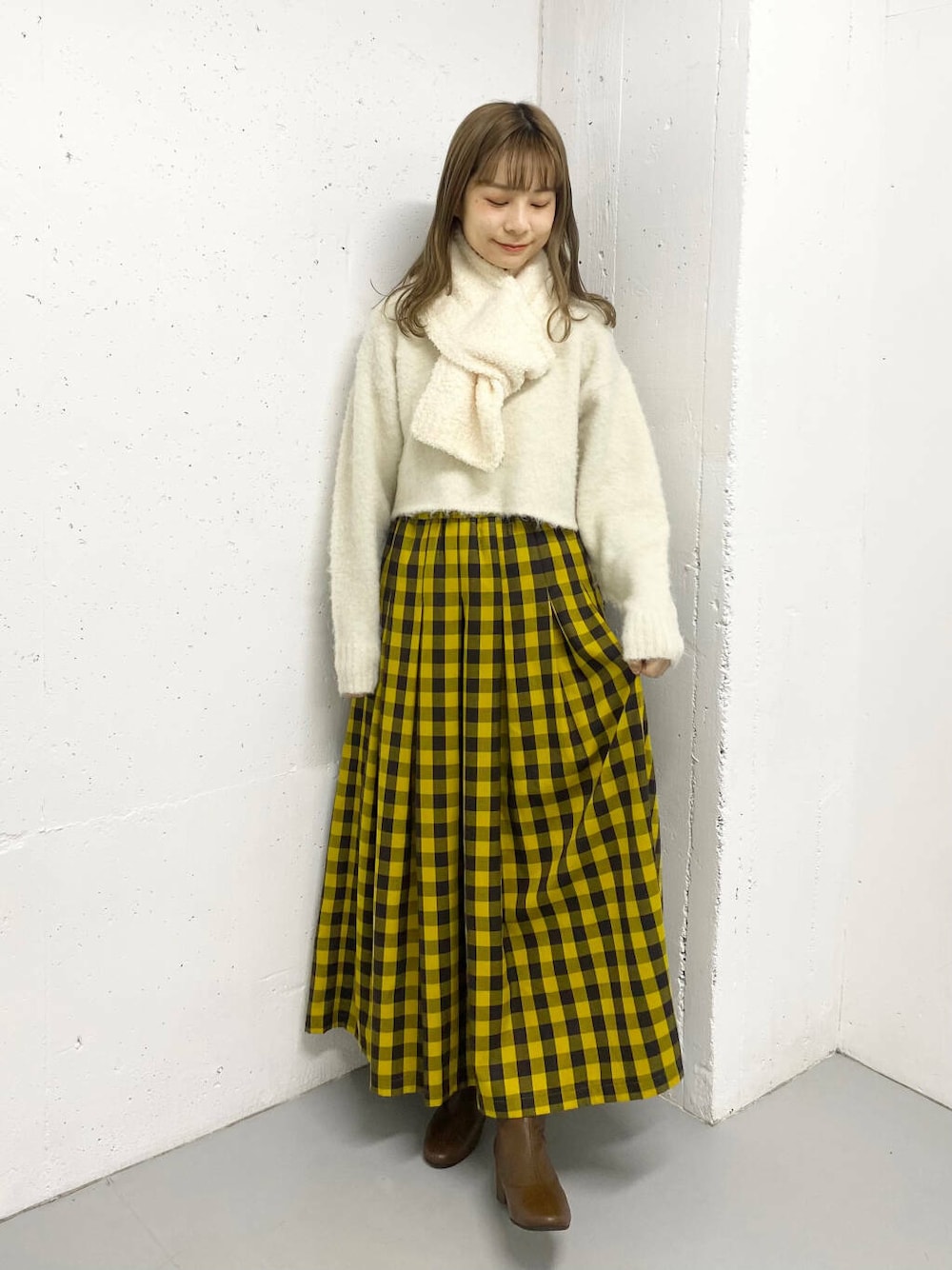マスタードカラーのブロックチェックが目を惹くロングスカートが主役のコーデ!