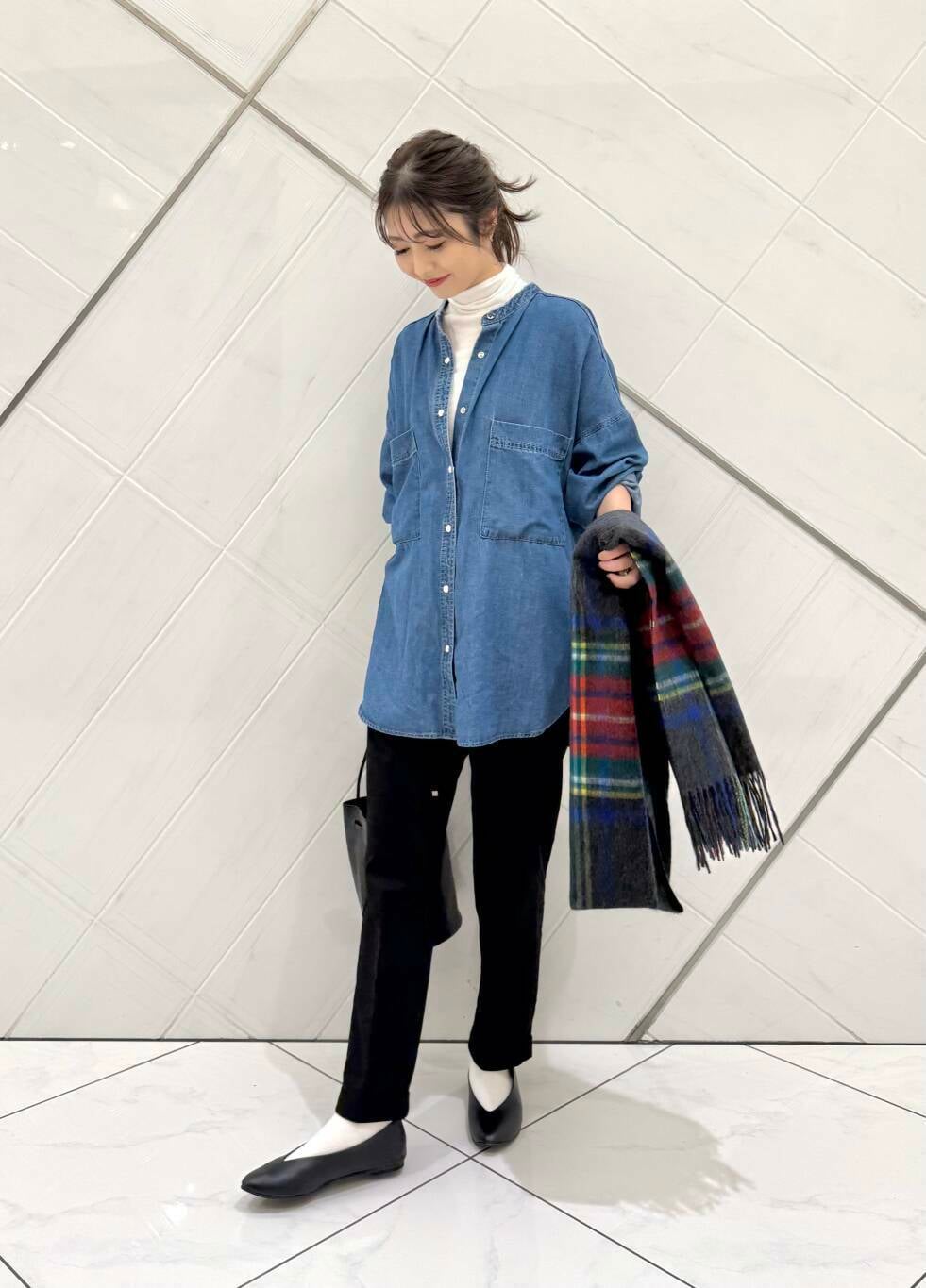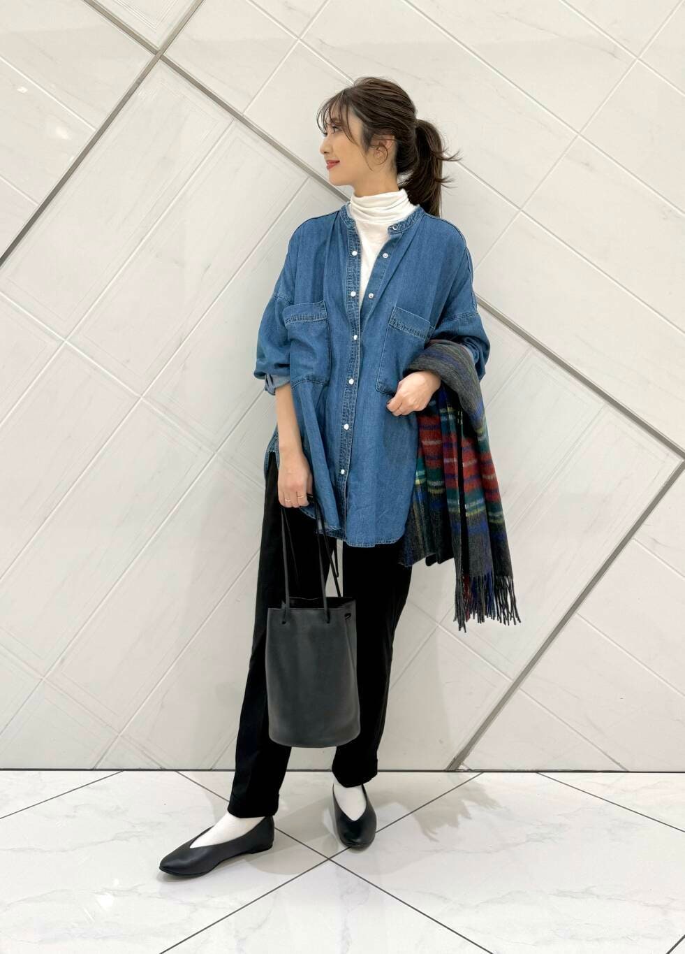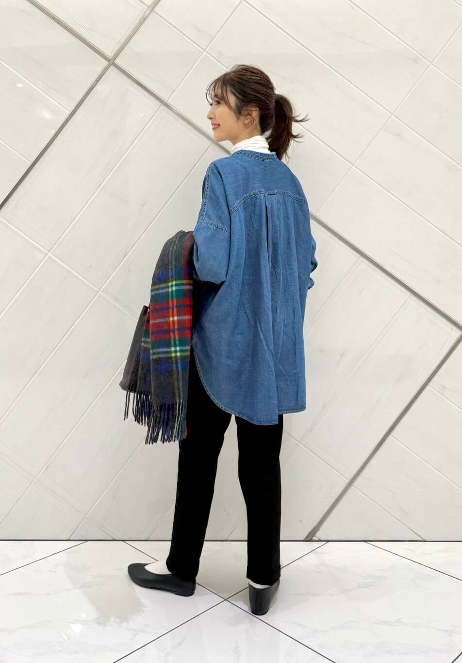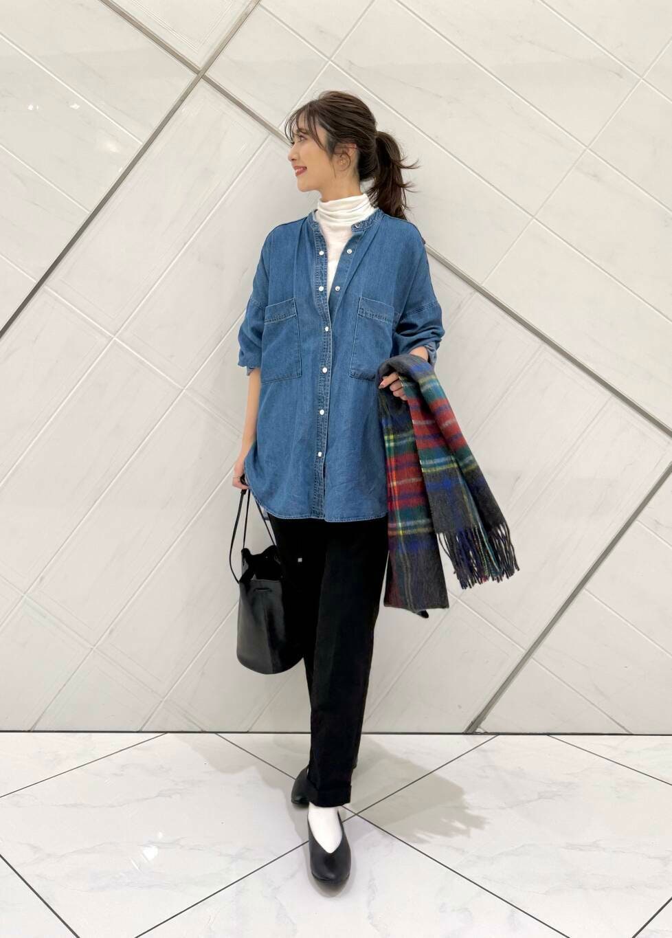 デニムシャツは薄手でとても軽い着心地で全体的にゆったりとしたサイズ感なので中にも着込むことができ、インナーとして上からニットやスウェット合わせも可愛いです。