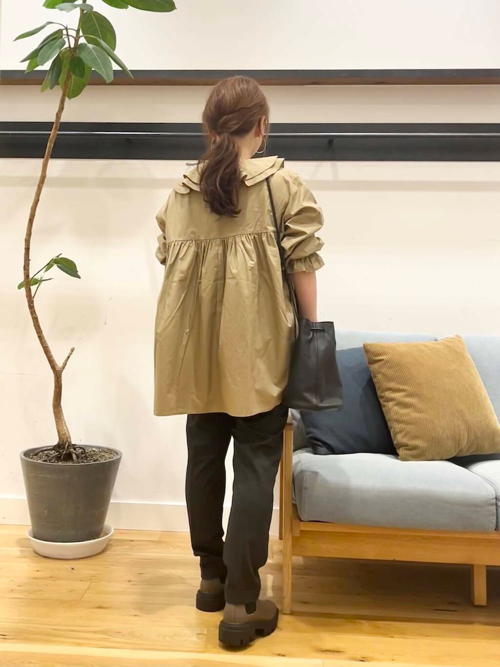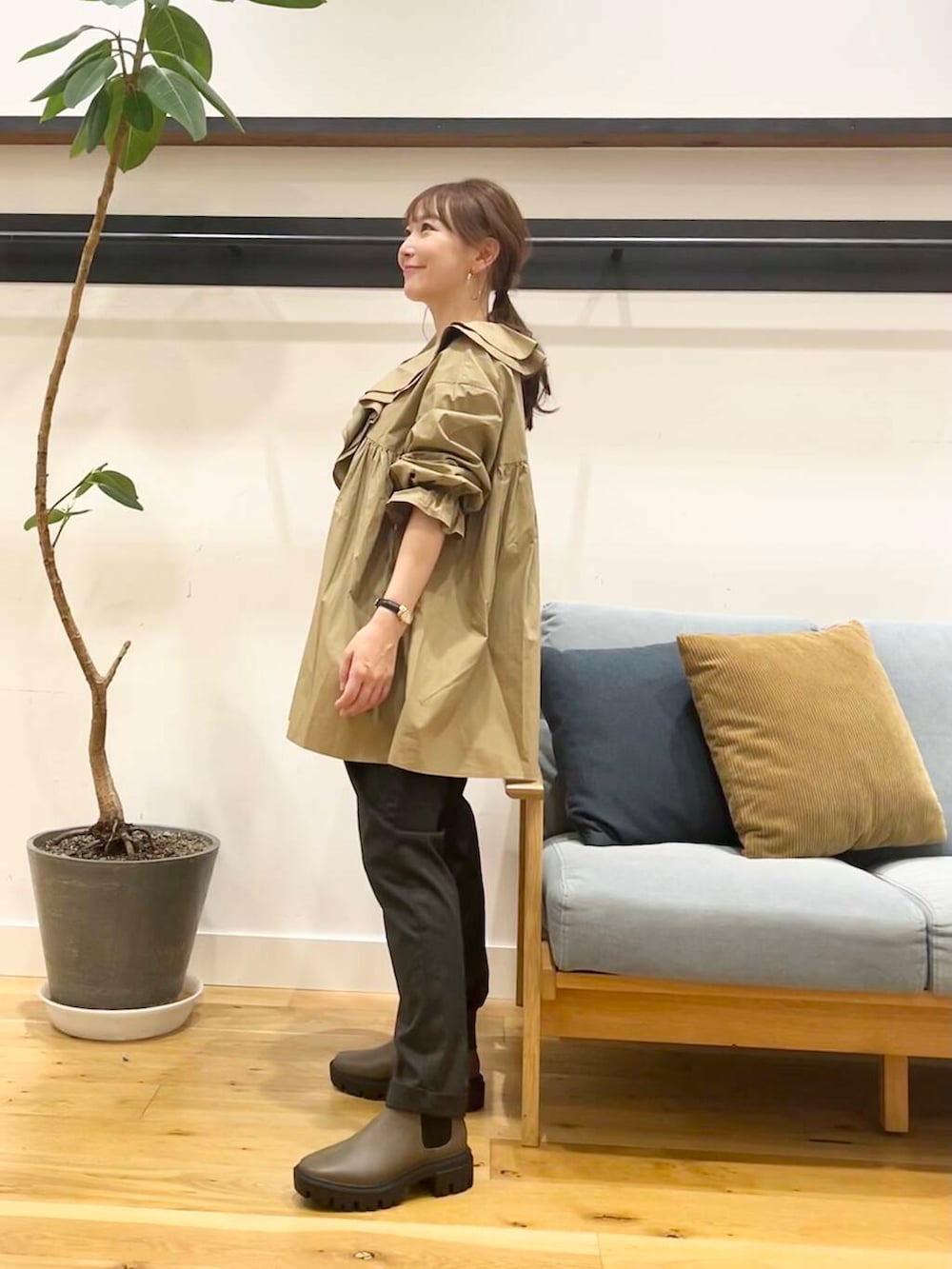 今回は小柄さんもスッキリ履けるツイルストレッチテーパードイージーパンツを合わせています。