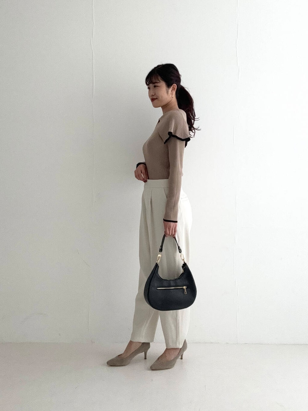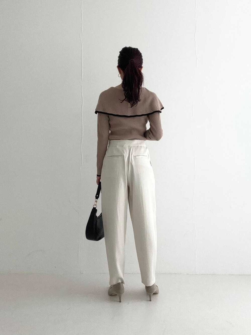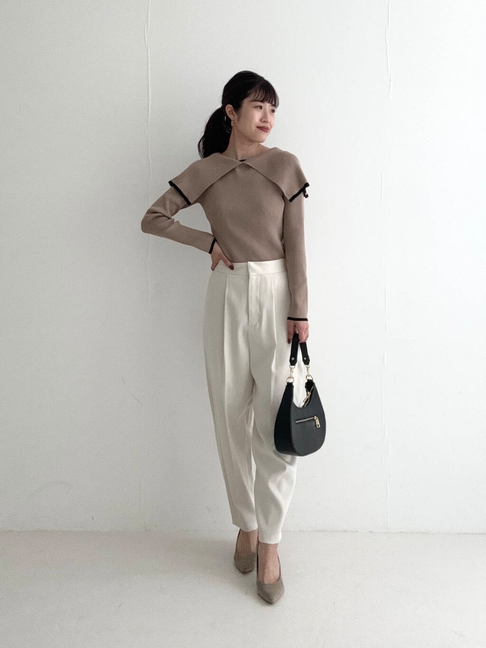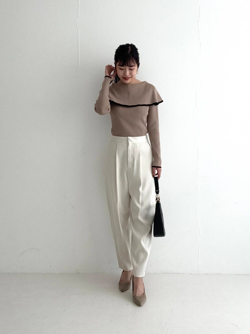 ボリュームのあるケープカラーと、程よくボディラインに沿うリブニットの組み合わせで