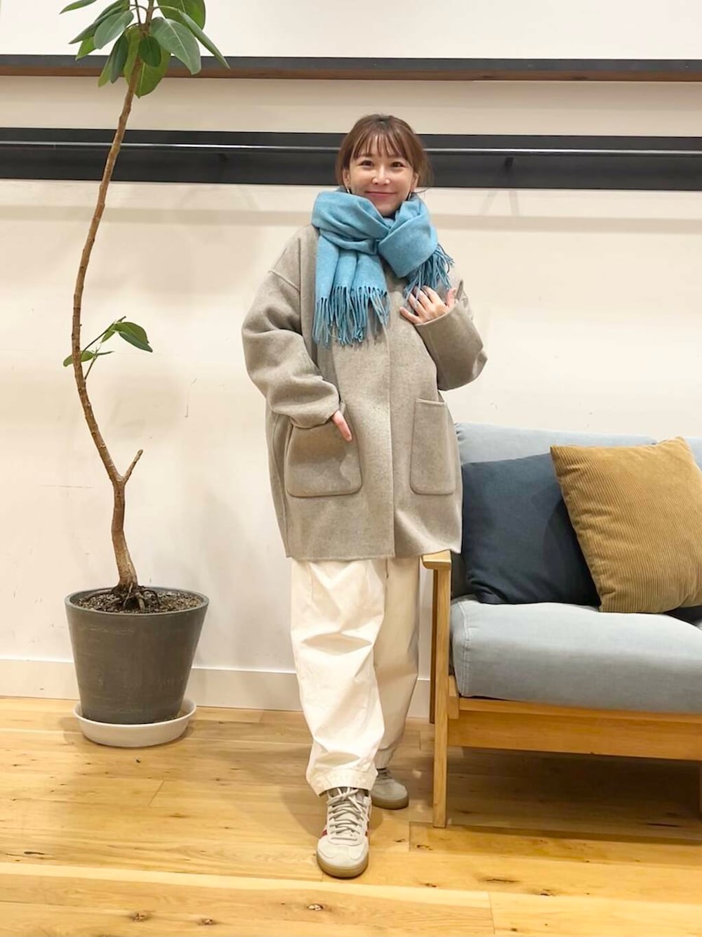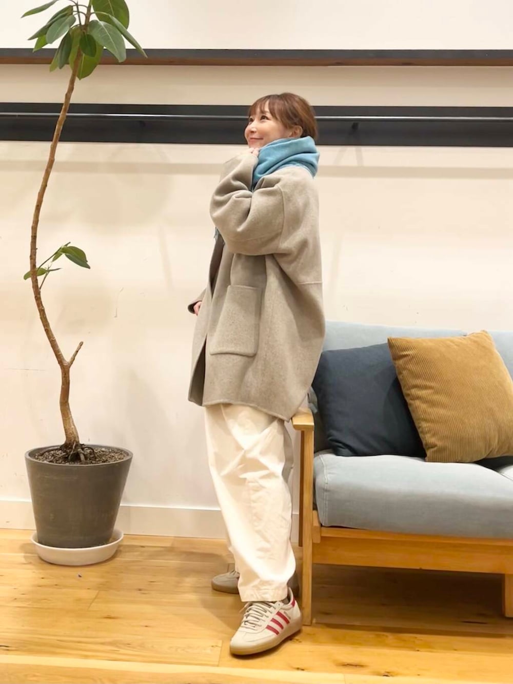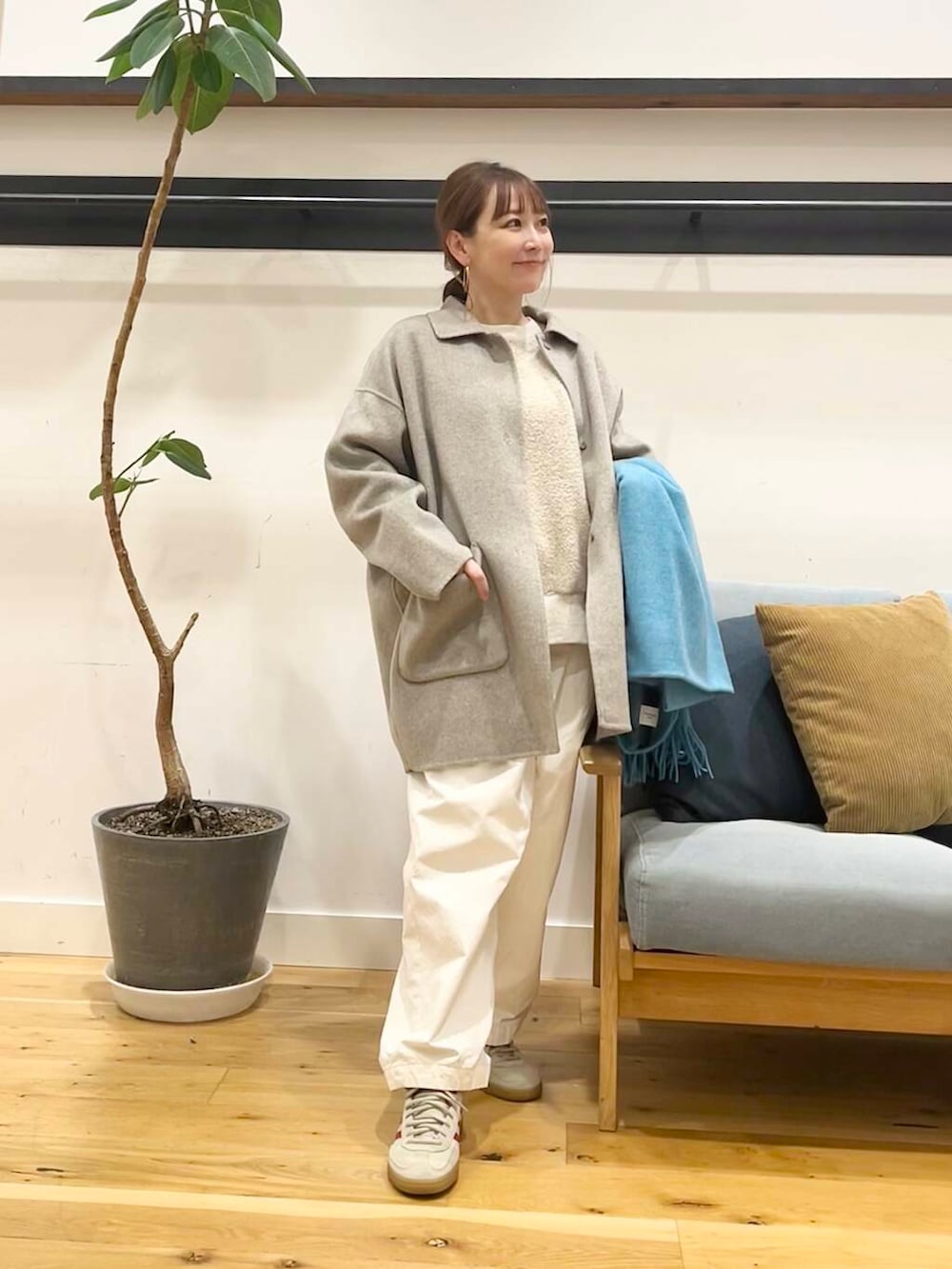 ウール独特のあったかそうな自然な色合い、着膨れするかと思いきや意外にもスッキリしたシルエットです。