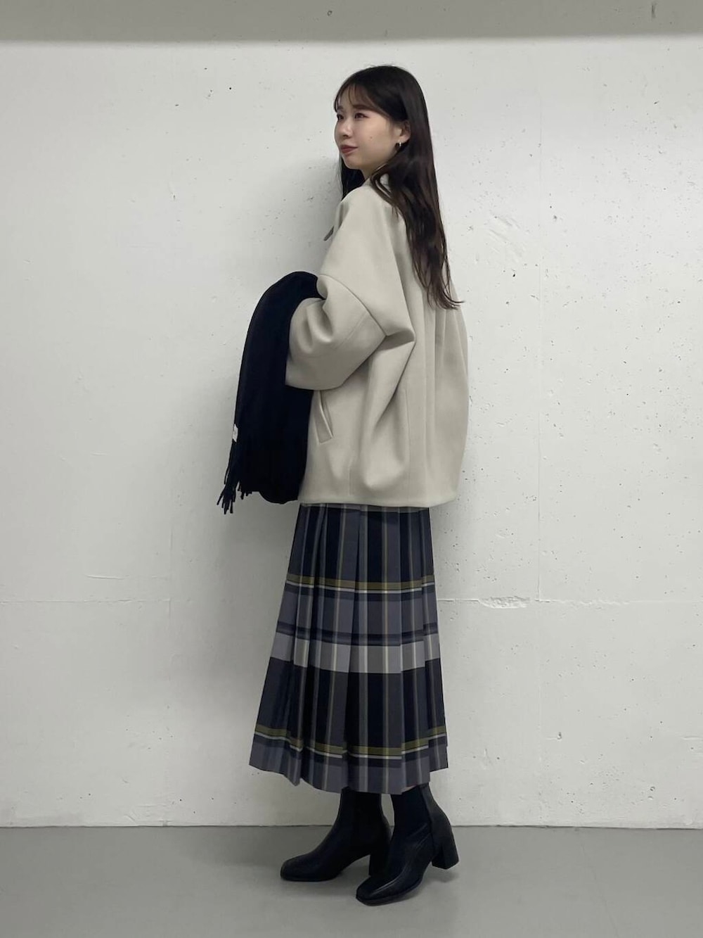 大きめの衿とコクーンシルエットがかわいいアウターをメインにスタイリングしてみました!