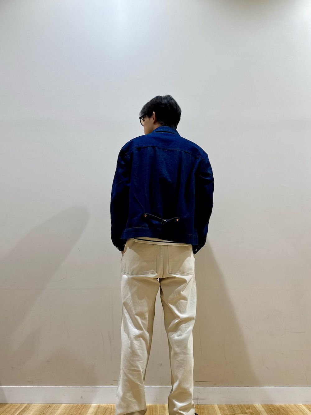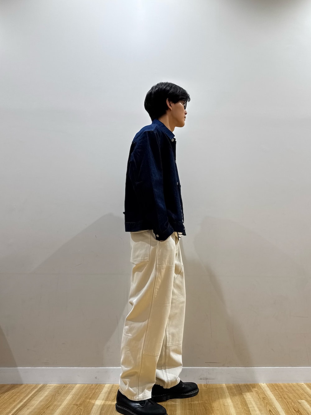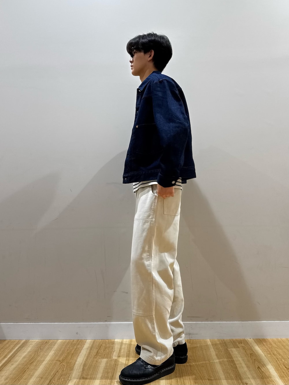 今回はデニムジャケットをメインに、インナーにボーダーのカットソーを入れることでフレンチな雰囲気が出ます。パンツはデニムでカチッと合わせてもいいですが、今回はオフホワイトのワイドパンツをチョイスして秋ということもあり軽さと抜け感を重視しました。80s〜90sに流行した王道スタイルで今でも鉄板なコーデです。