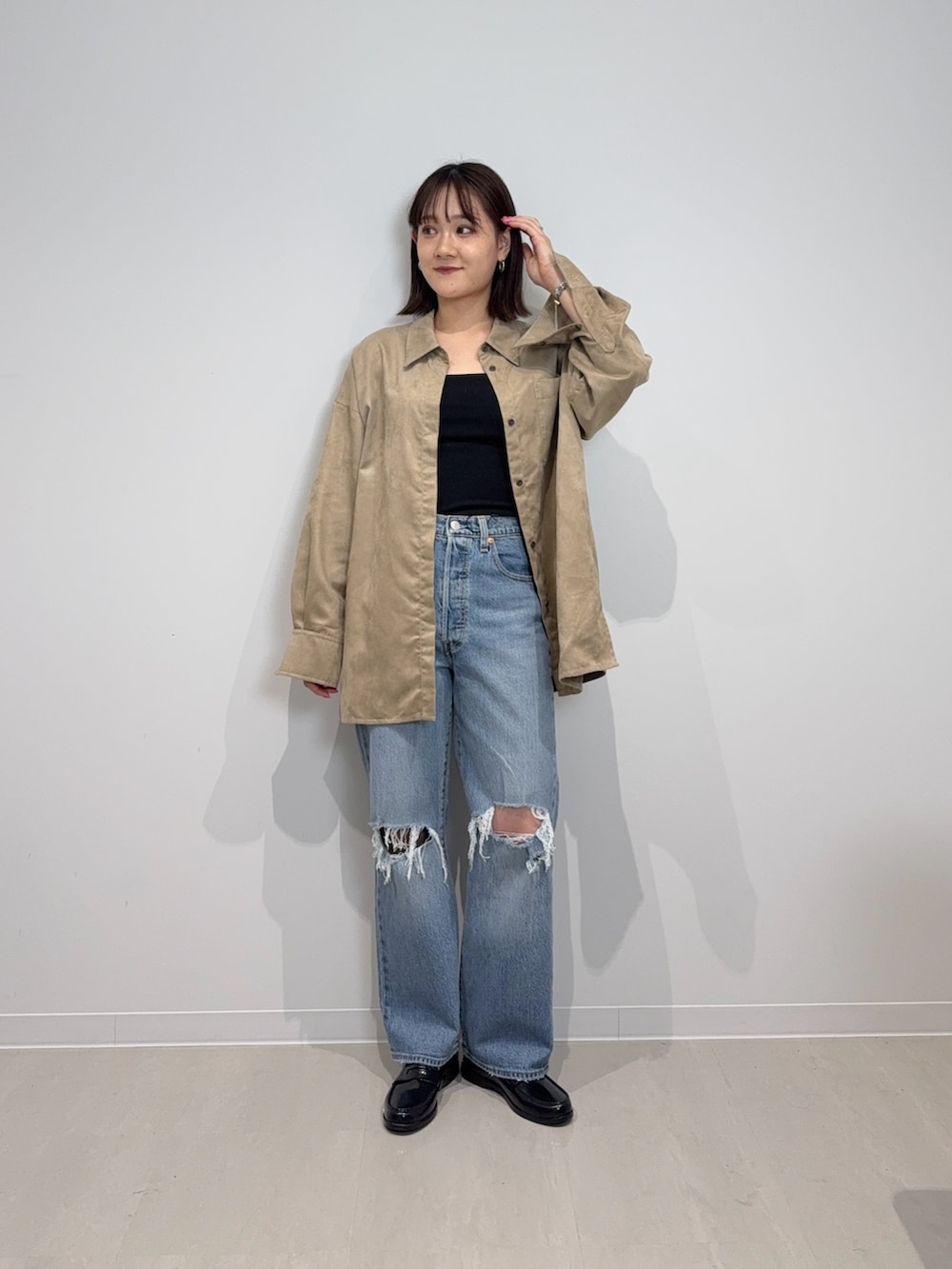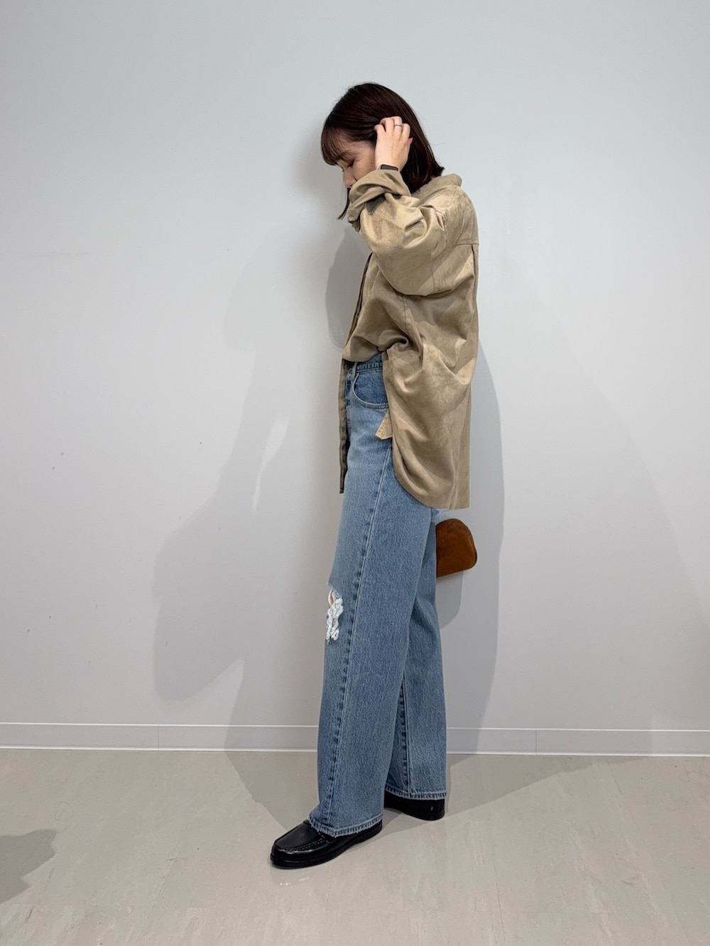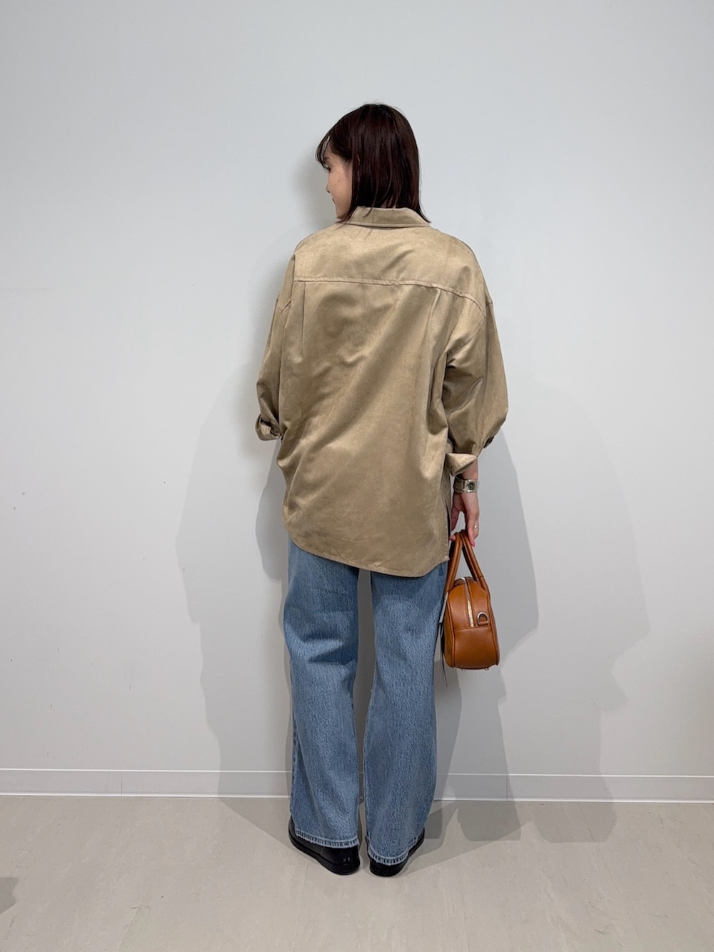 スエード素材のオーバーサイズシャツはメイン使い、前開きで羽織で使ってもどちらも可愛いです◎