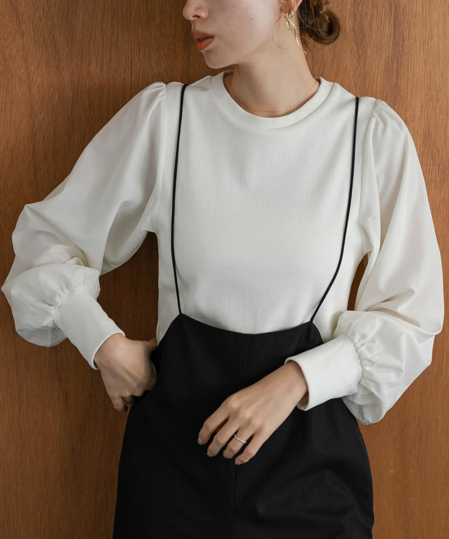 インナーに合わせた白いカットソーは、袖が布帛素材のパフになっていて、一枚でも着映えしますよ!