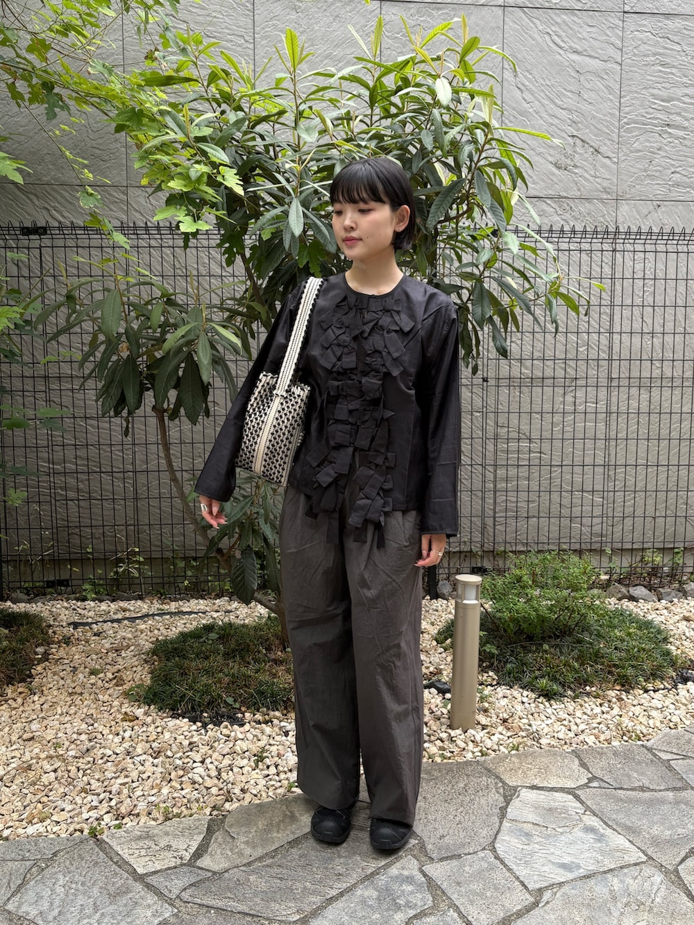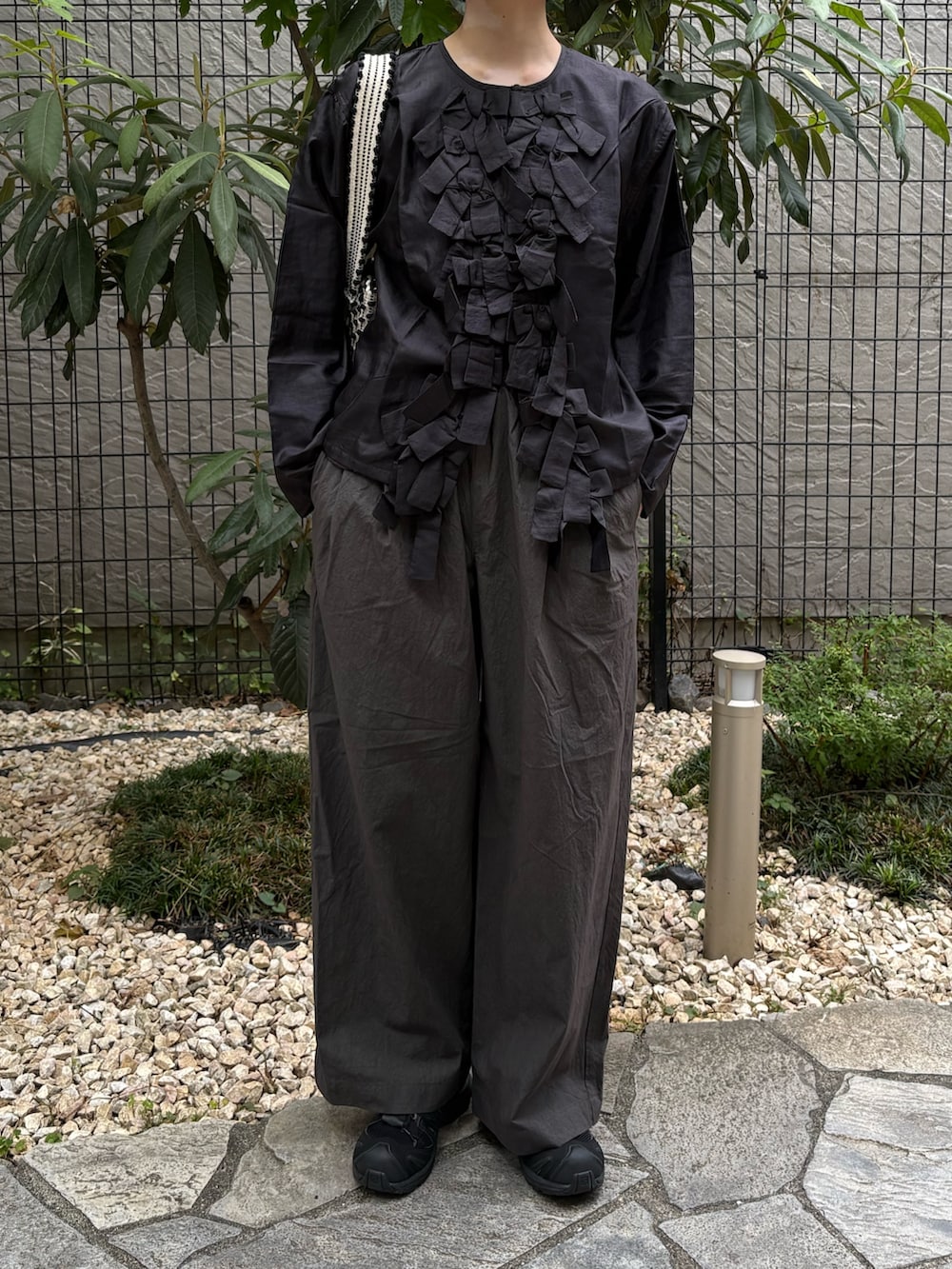 BUNONのリボンが施されたシルクのブラウス。いま時期から羽織で着られて、前を留めても、インナーにカットソーやニットを合わせても可愛い◎