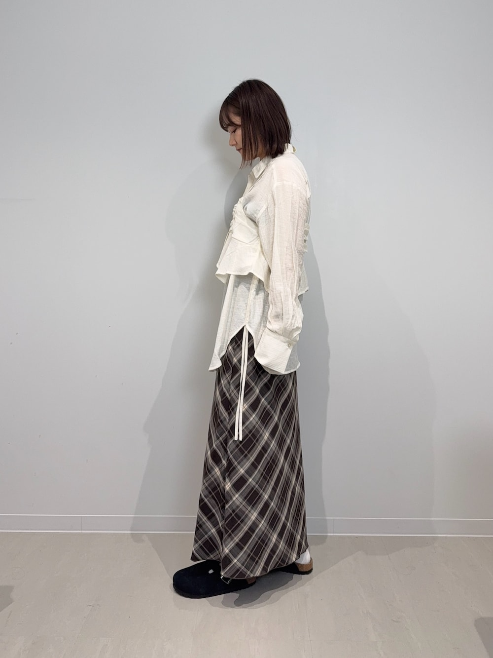 ビスチェSETのシャツは、表面感があり丈が長めなデザインですが落ち感があるのでスッキリ見えます!ビスチェは単体使いも出来るのでシャツを羽織で使っても◎