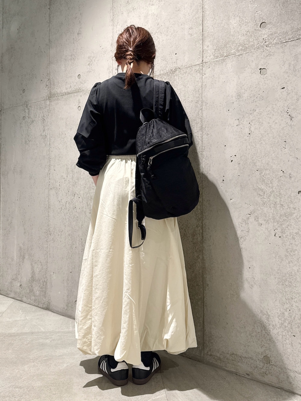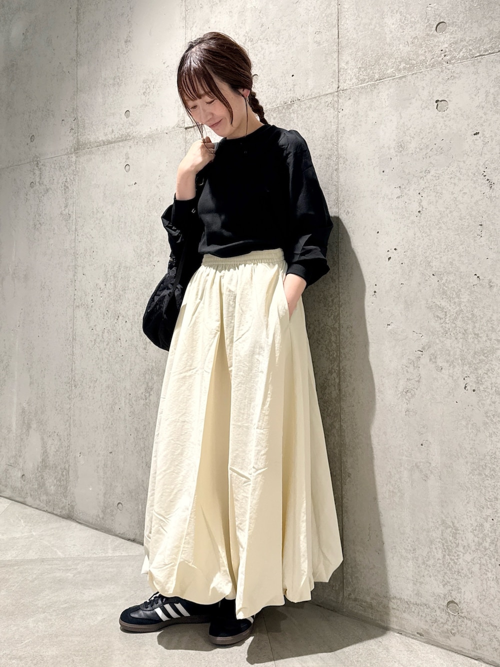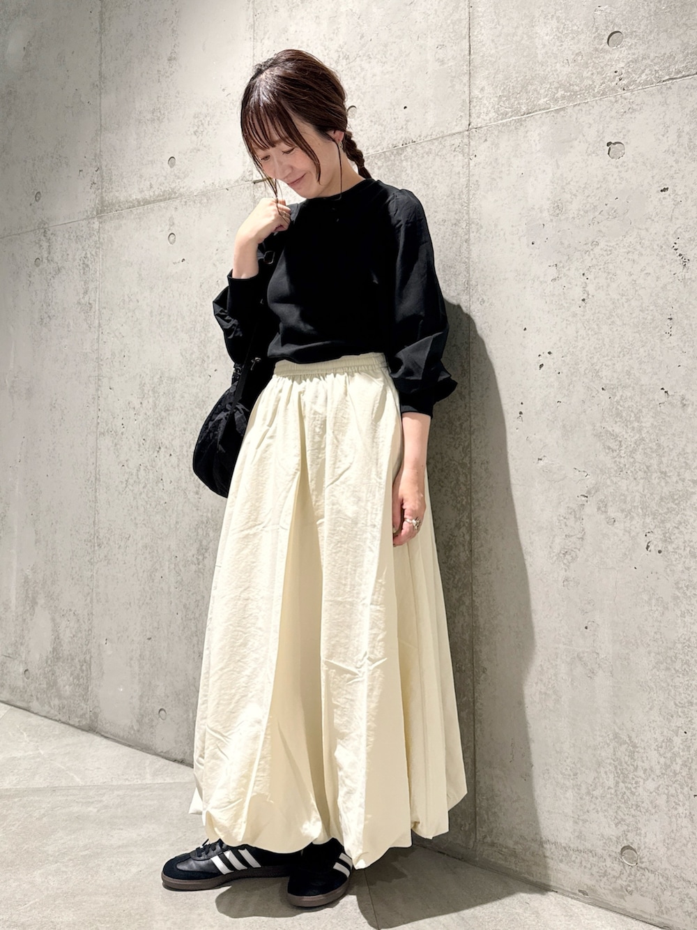 今回は、バルーンシルエットが着映えするロングスカートを合わせた大人カジュアルコーディネート。