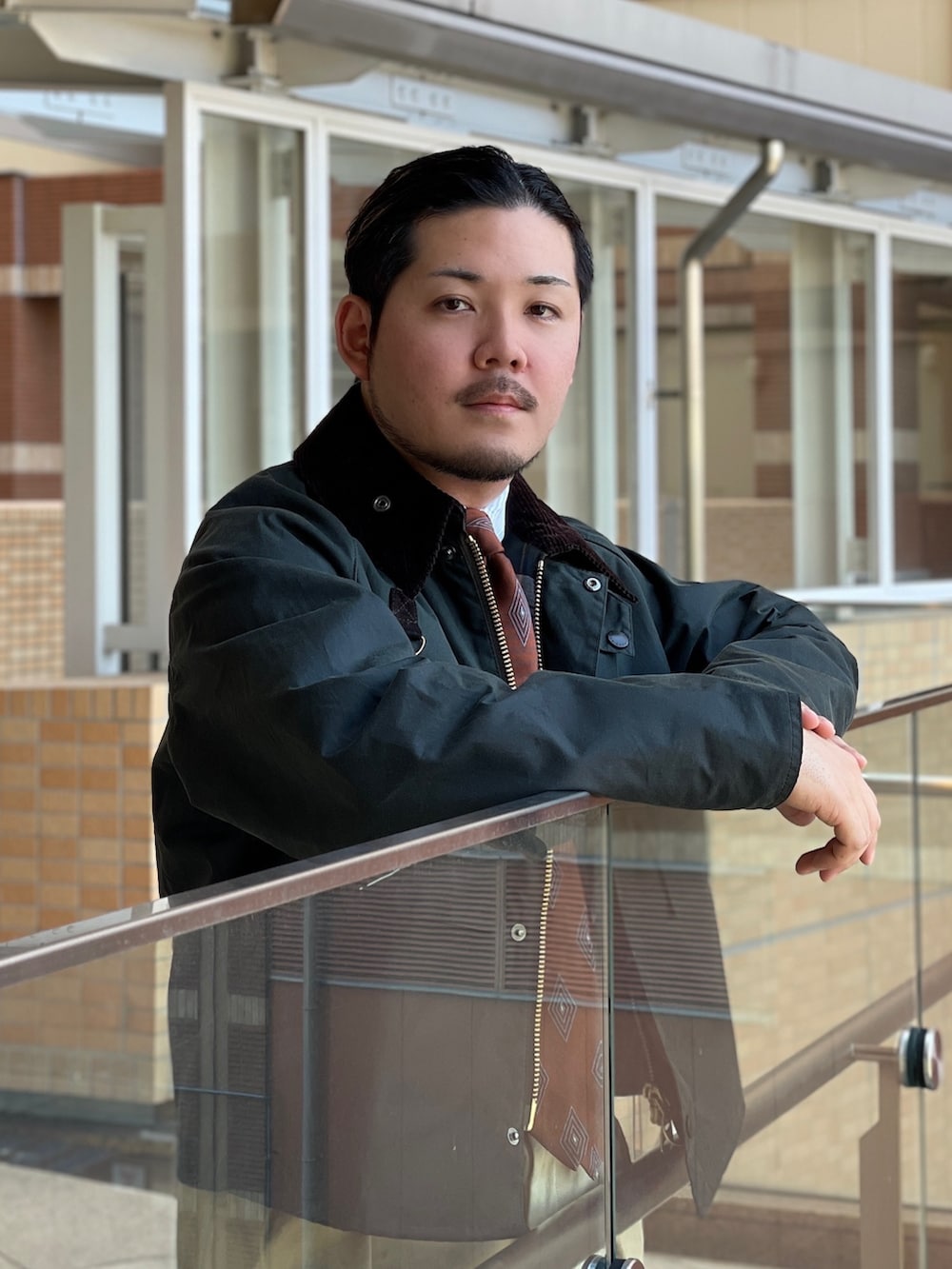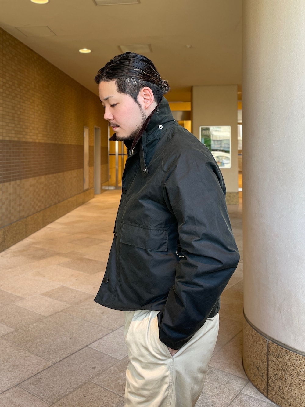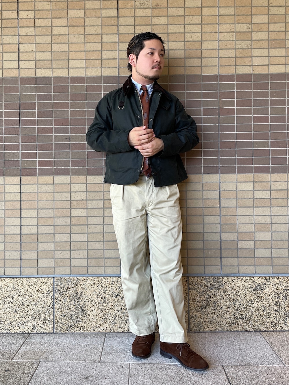 Barbourのワックスジャケット、スペイをタイドアップスタイルで。