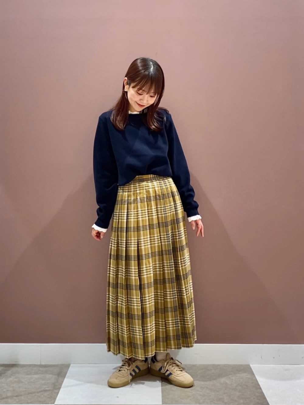 ITEMSの襟と袖にレースがドッキングされたニットに、DOORSのチェックプリーツスカートを合わせてみました
